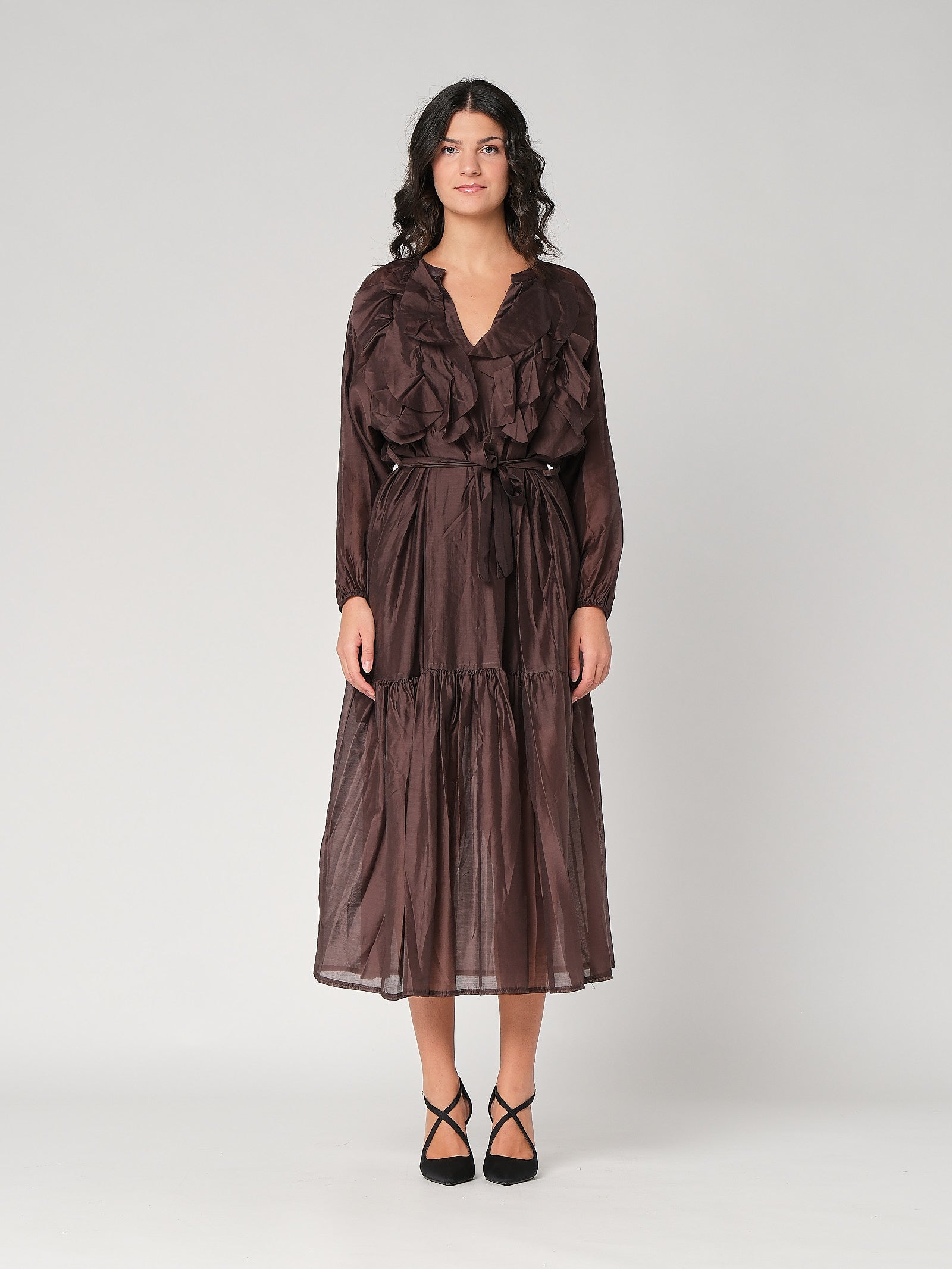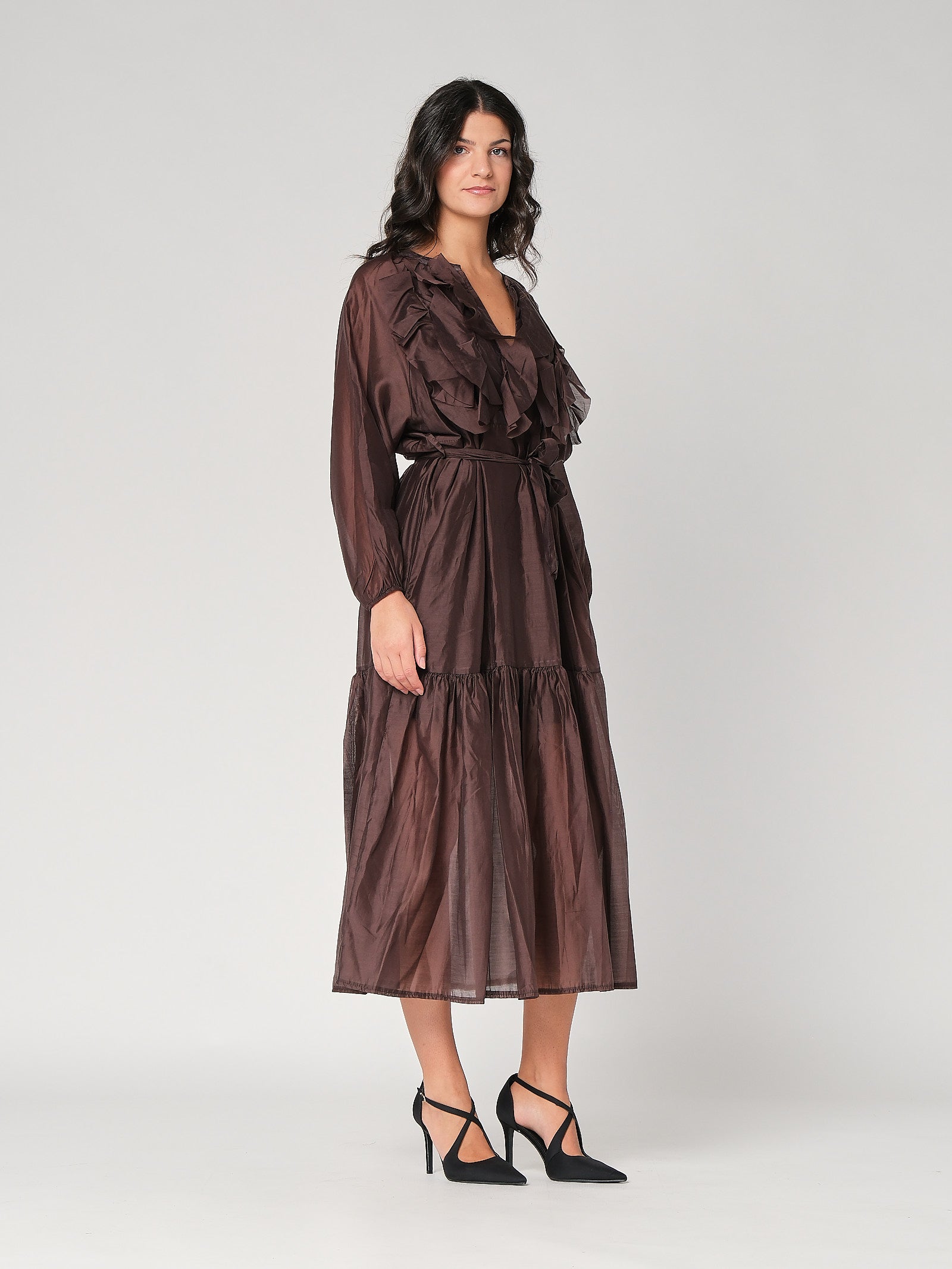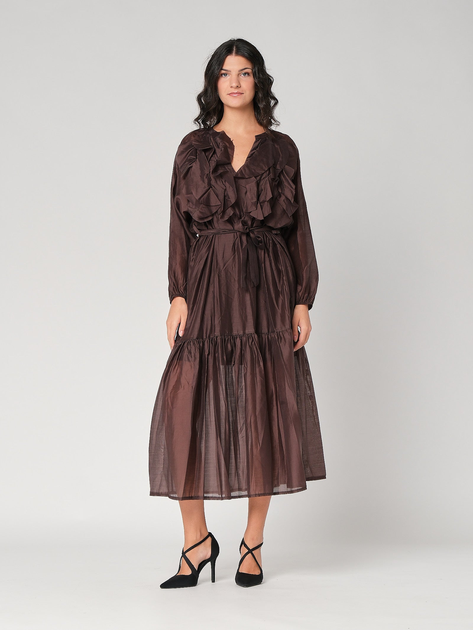 Questo abito midi in taffetà marrone unisce leggerezza e carattere in un design dall’eleganza intramontabile. Le balze sul corpetto creano un raffinato gioco di volumi, mentre la cintura in tessuto sottolinea delicatamente il punto vita donando slancio alla figura. Le maniche lunghe con polsino elasticizzato aggiungono un tocco romantico, bilanciando la linea morbida e fluida della gonna ampia.