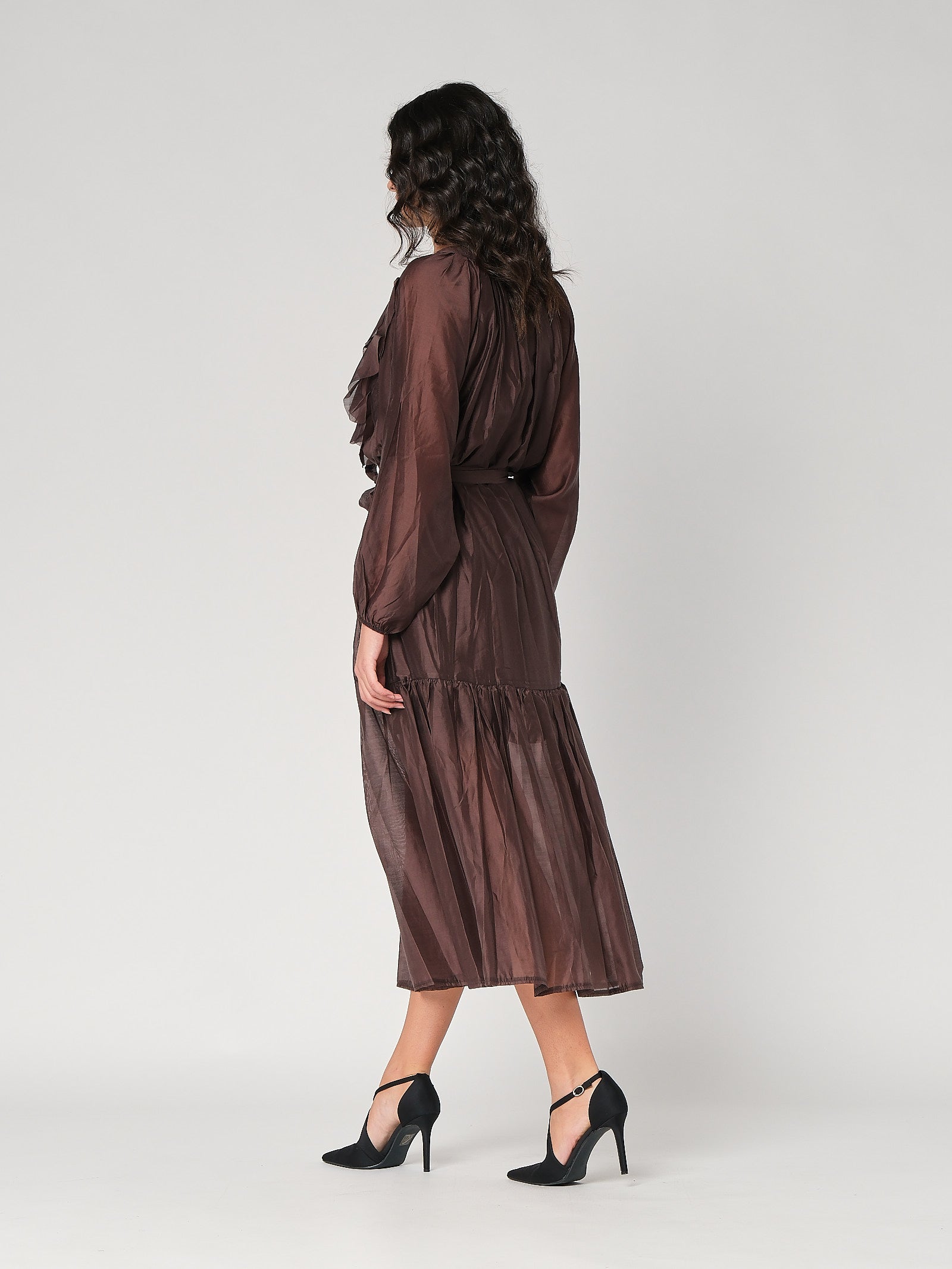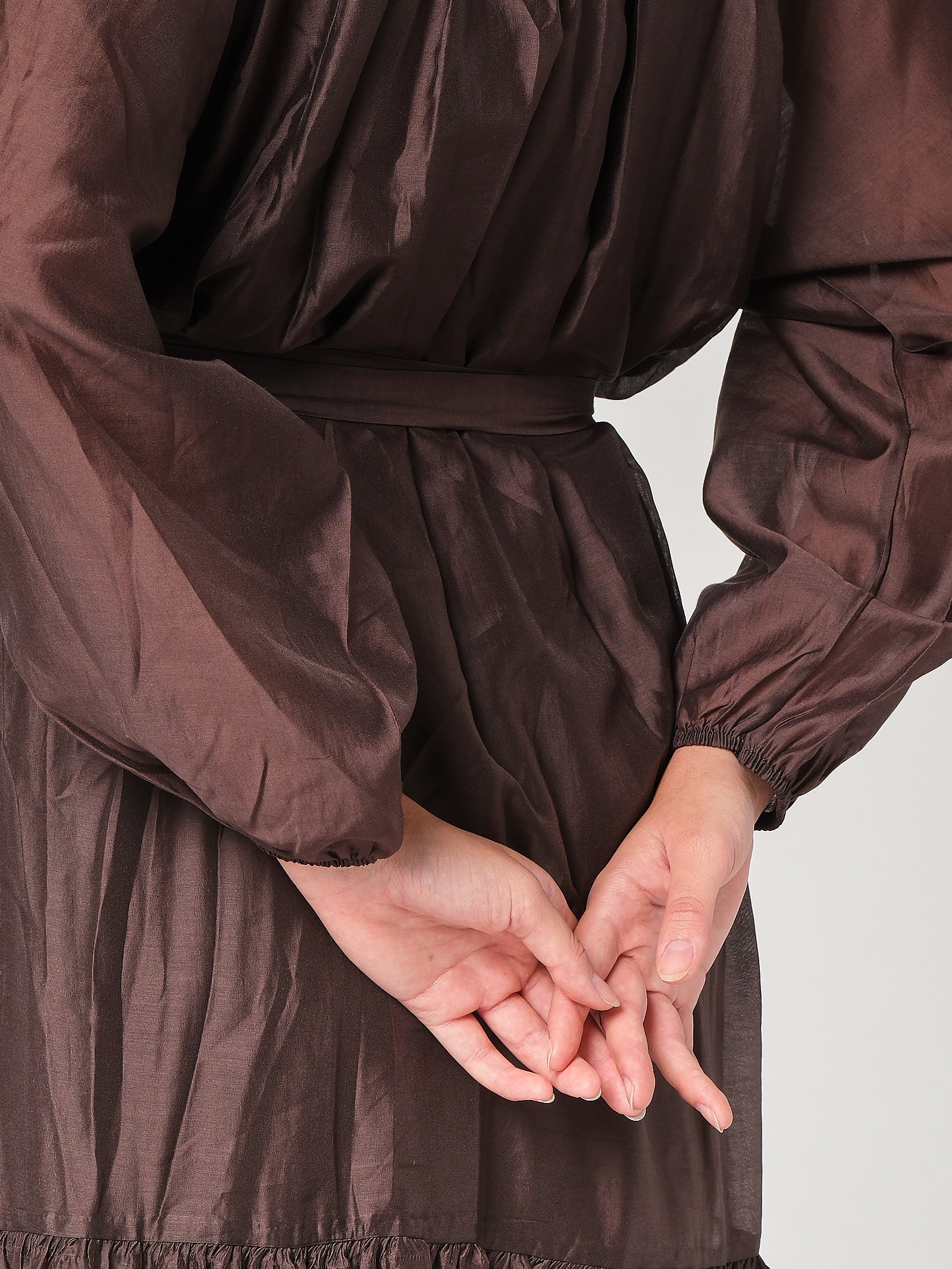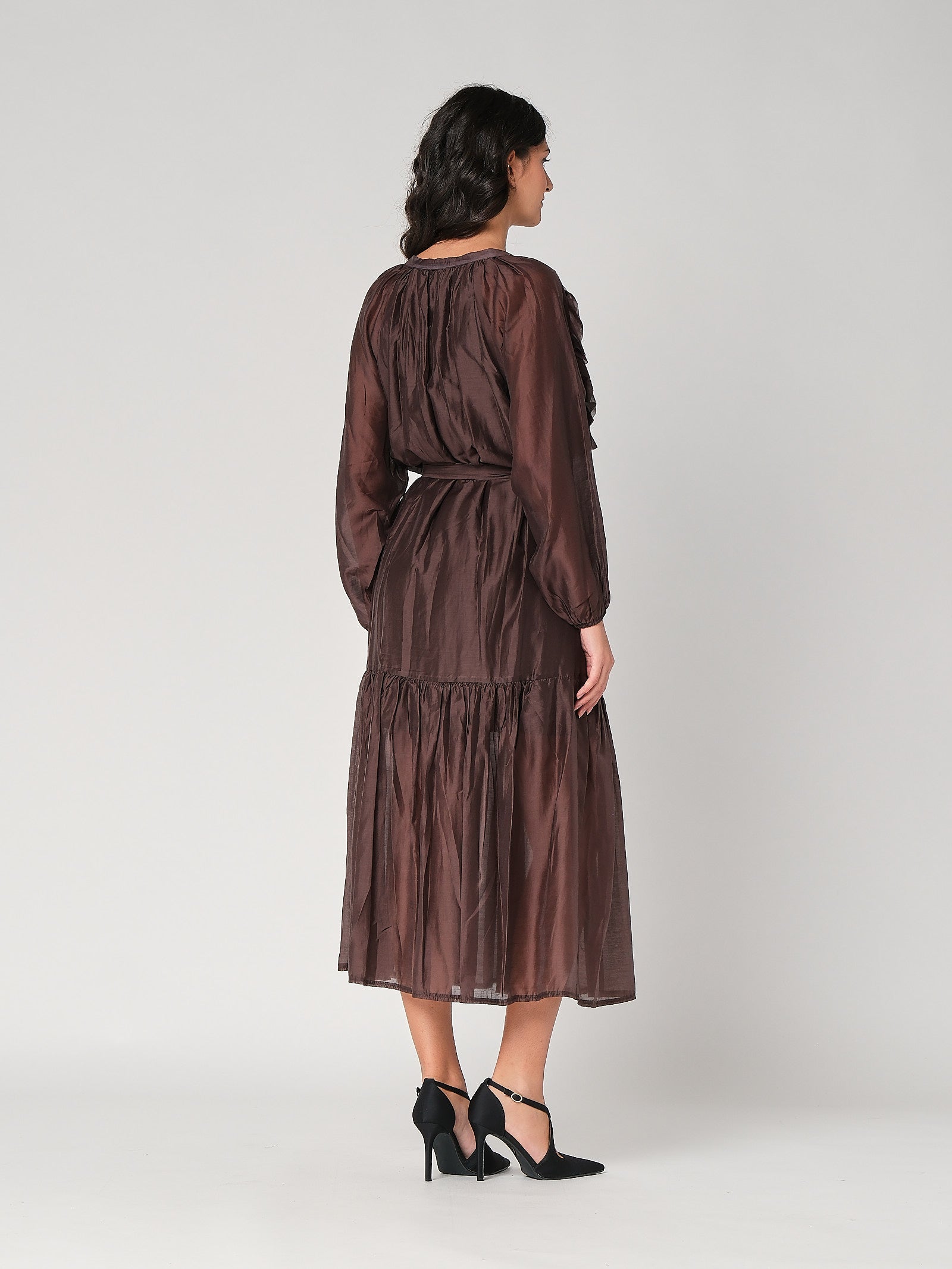 Questo abito midi in taffetà marrone unisce leggerezza e carattere in un design dall’eleganza intramontabile. Le balze sul corpetto creano un raffinato gioco di volumi, mentre la cintura in tessuto sottolinea delicatamente il punto vita donando slancio alla figura. Le maniche lunghe con polsino elasticizzato aggiungono un tocco romantico, bilanciando la linea morbida e fluida della gonna ampia.