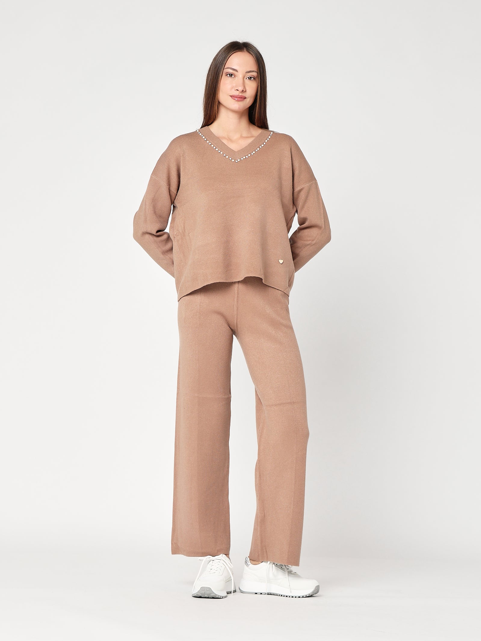 Maglia collo aderente e pantalone in tinta cammello: un abbinamento raffinato che gioca su tonalità neutre calde. La maglia valorizza il décolleté mentre il pantalone slancia la figura con taglio dritto. Perfetto con stivali cuoio, cappotto cammello lungo e accessori in oro o legno. Ideale per ufficio, brunch o serata elegante.