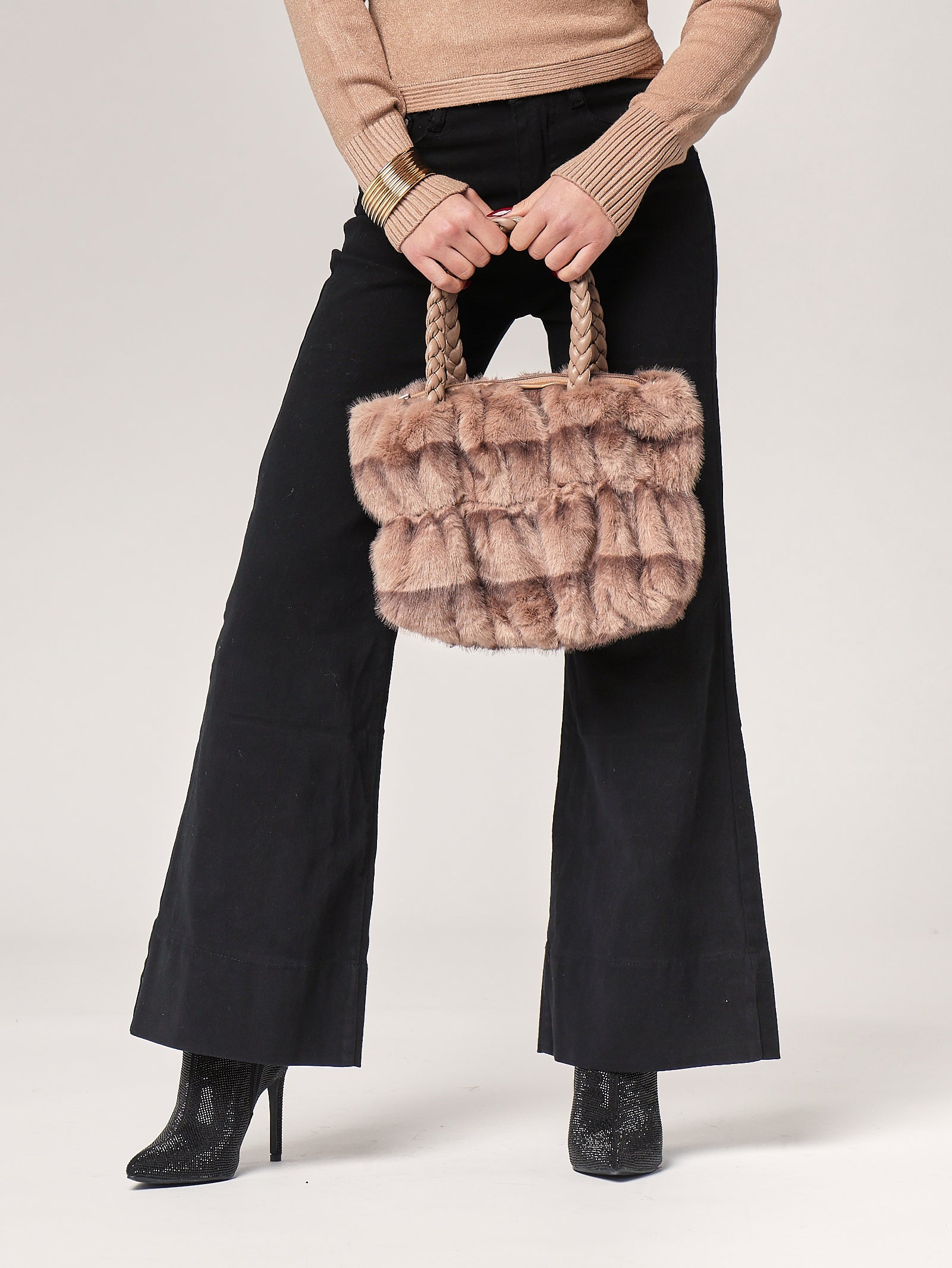 Borsa in pelliccia con manici intrecciati, un accessorio morbido e femminile che aggiunge un tocco cozy ai look di stagione. La texture soffice e la struttura compatta la rendono perfetta per completare outfit casual chic o combinazioni più eleganti.
