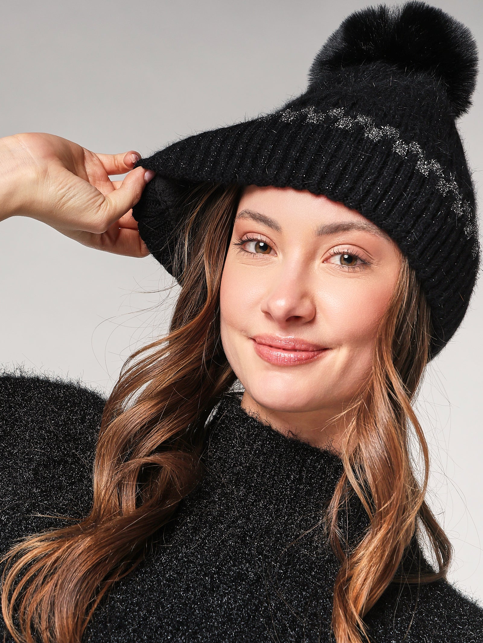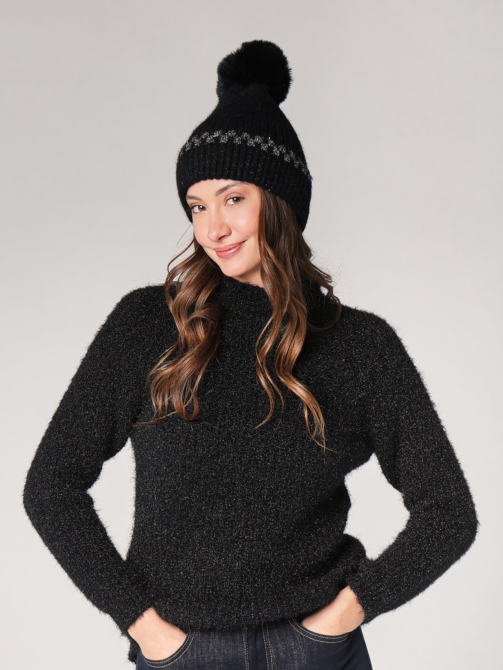 Cappello lavorato con filo lurex, ideale per dare un tocco di luce a qualsiasi look invernale. La morbidezza del filato e la vestibilità elastica assicurano calore e comfort per tutto il giorno.