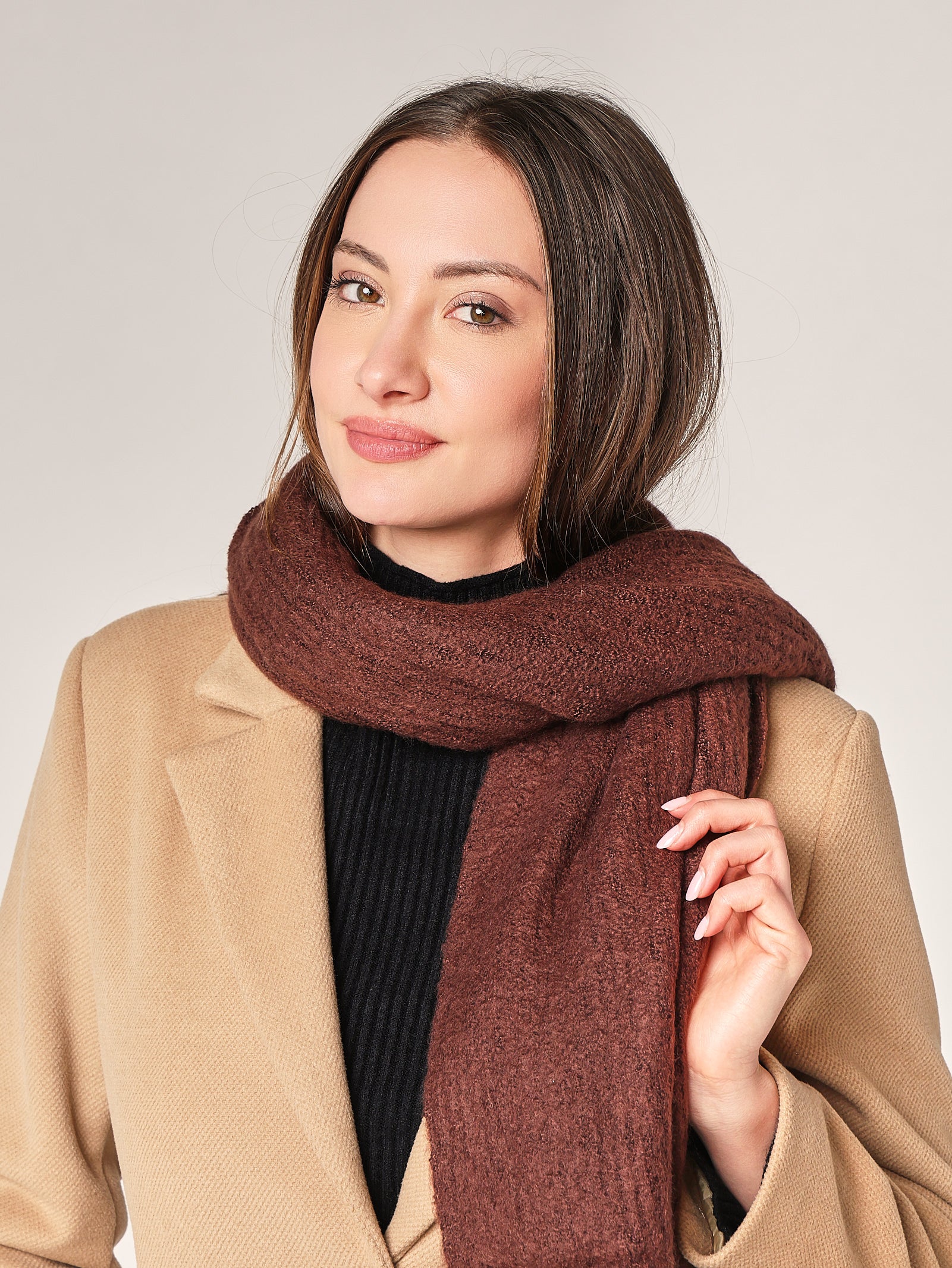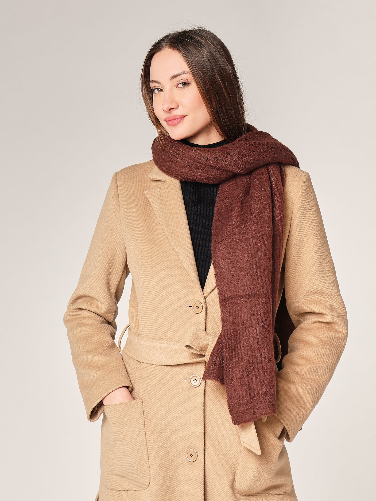 Sciarpa morbida dal look moderno e versatile, ideale per completare sia outfit casual che più raffinati. La texture avvolgente e la linea pulita la rendono un must-have per l’inverno.