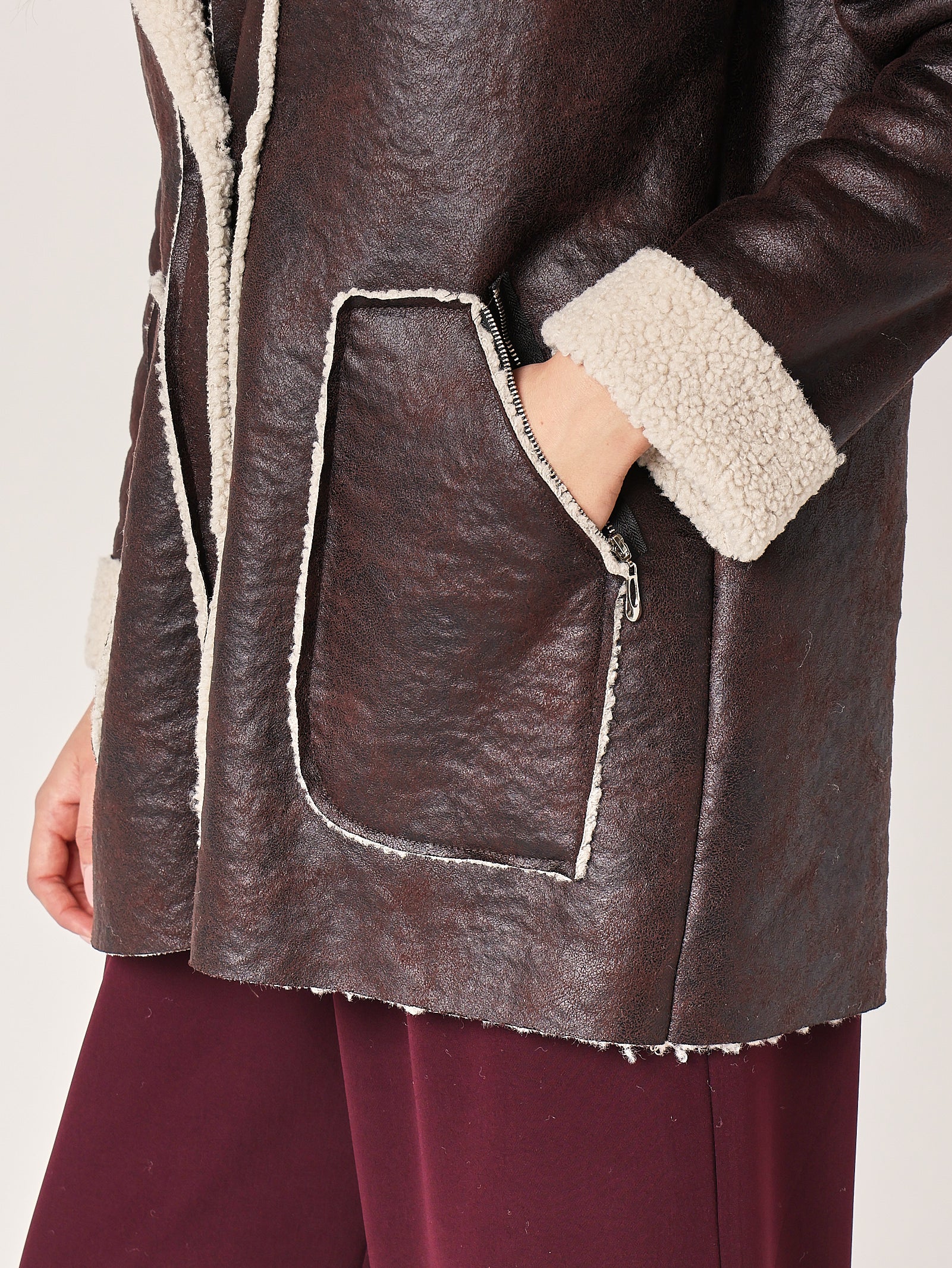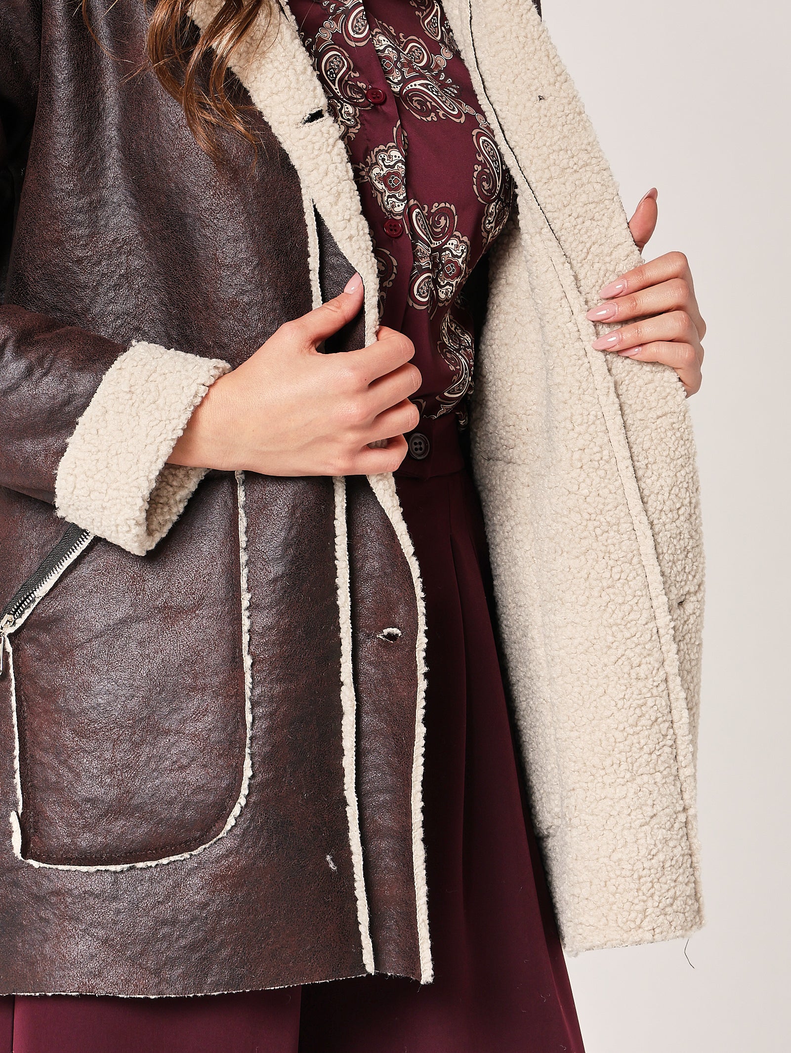 Dettaglio sartoriale: finiture effetto pelliccia e cuciture decorative