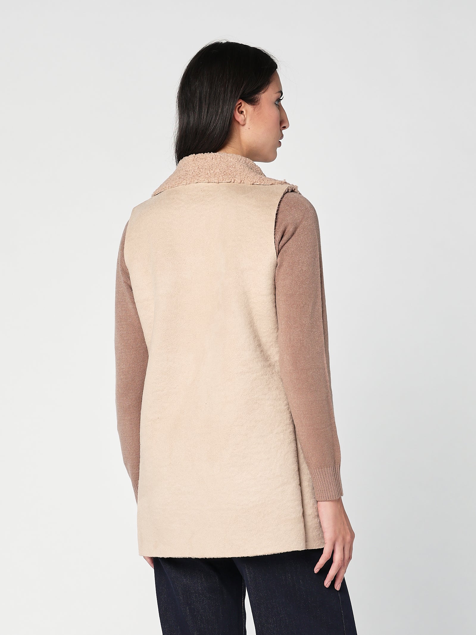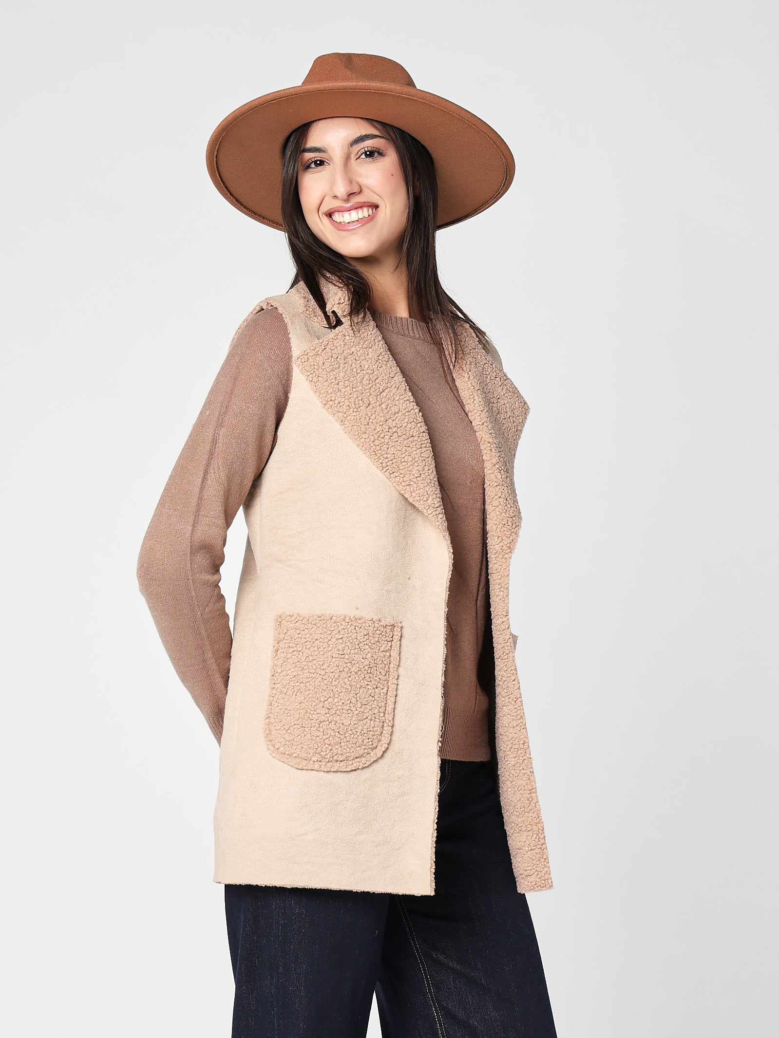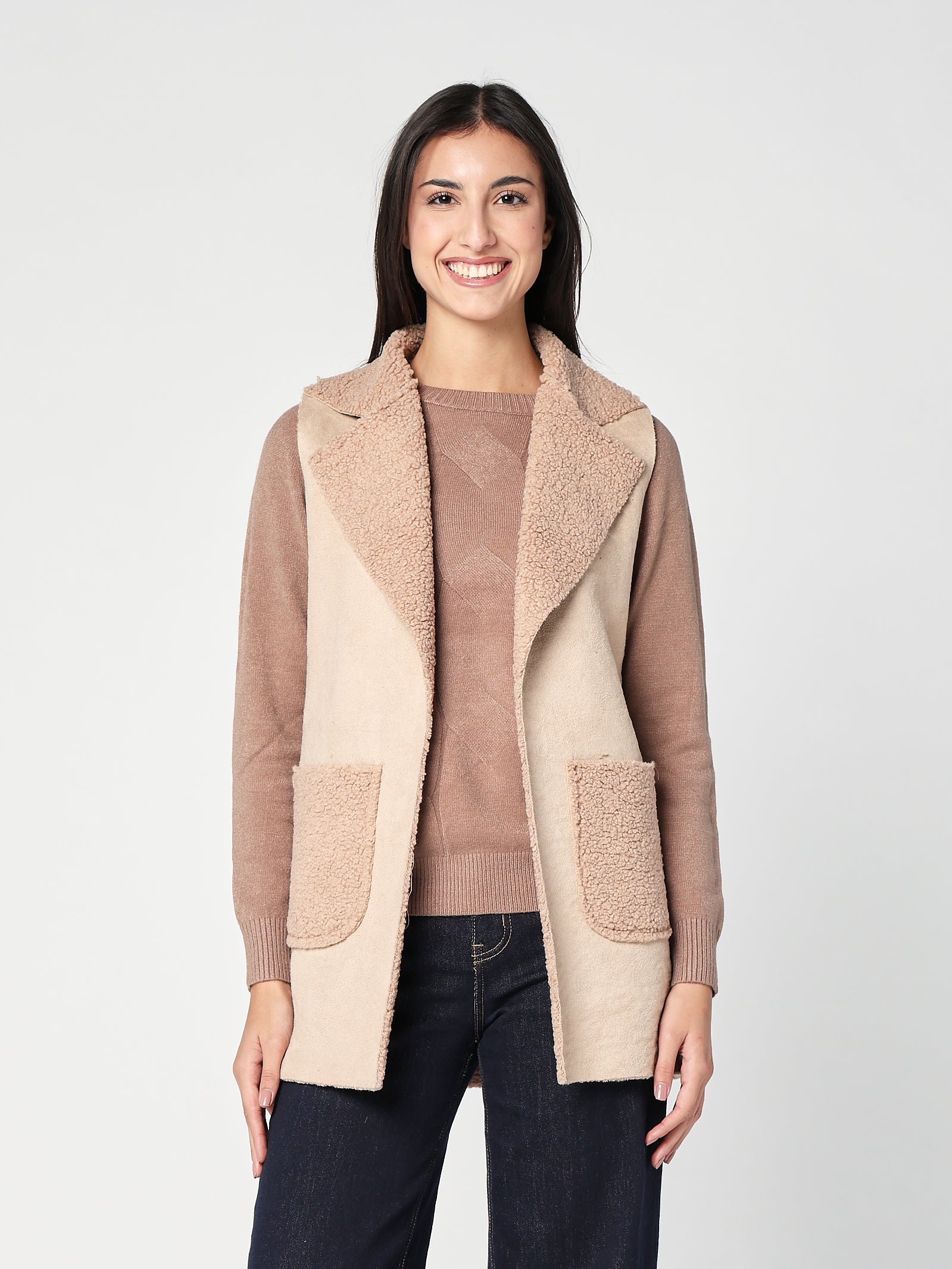 Montone smanicato aperto in nuance scura, dallo stile versatile e contemporaneo. Il volume della pelliccia dialoga con linee dritte del look sottostante: abbinalo a tuta in jersey per un effetto soft, oppure sopra blazer oversize con pantaloni palazzo per una silhouette armoniosa.