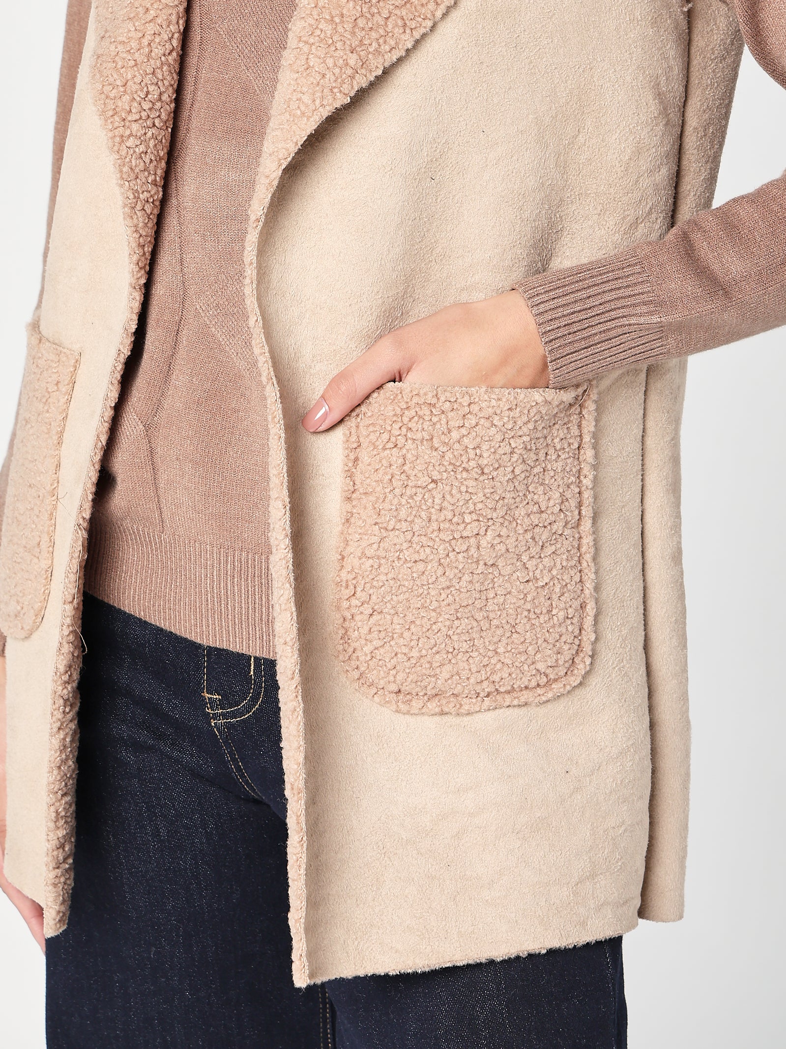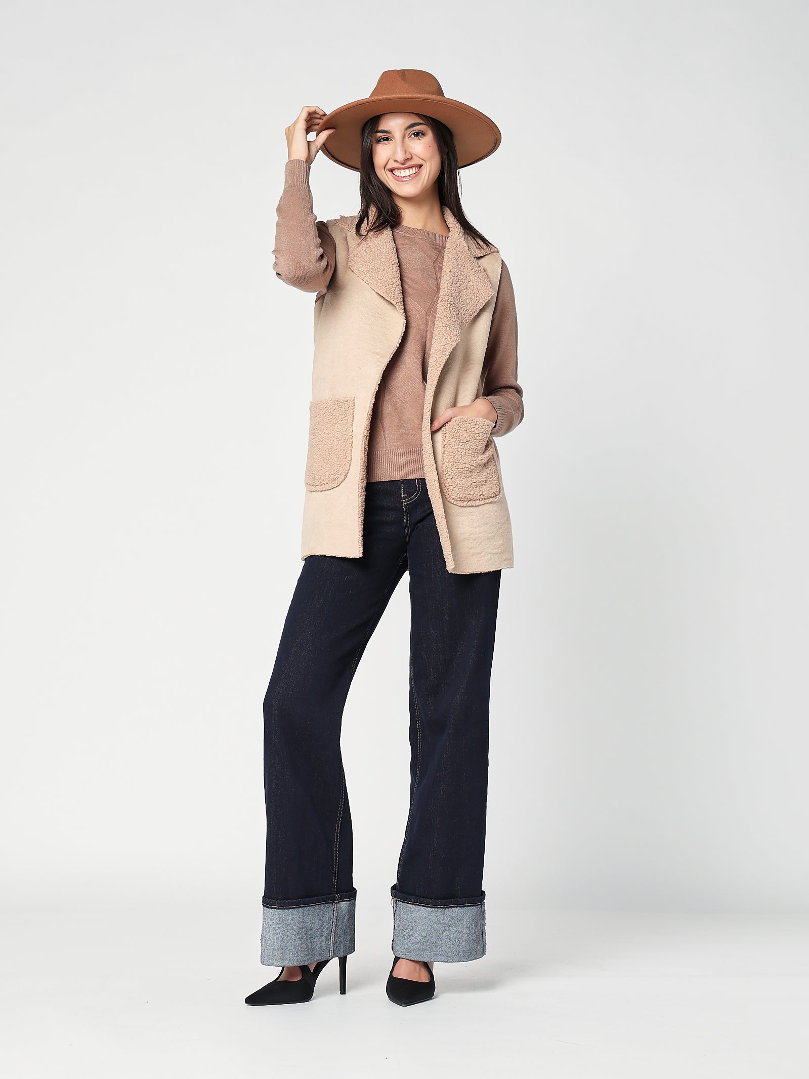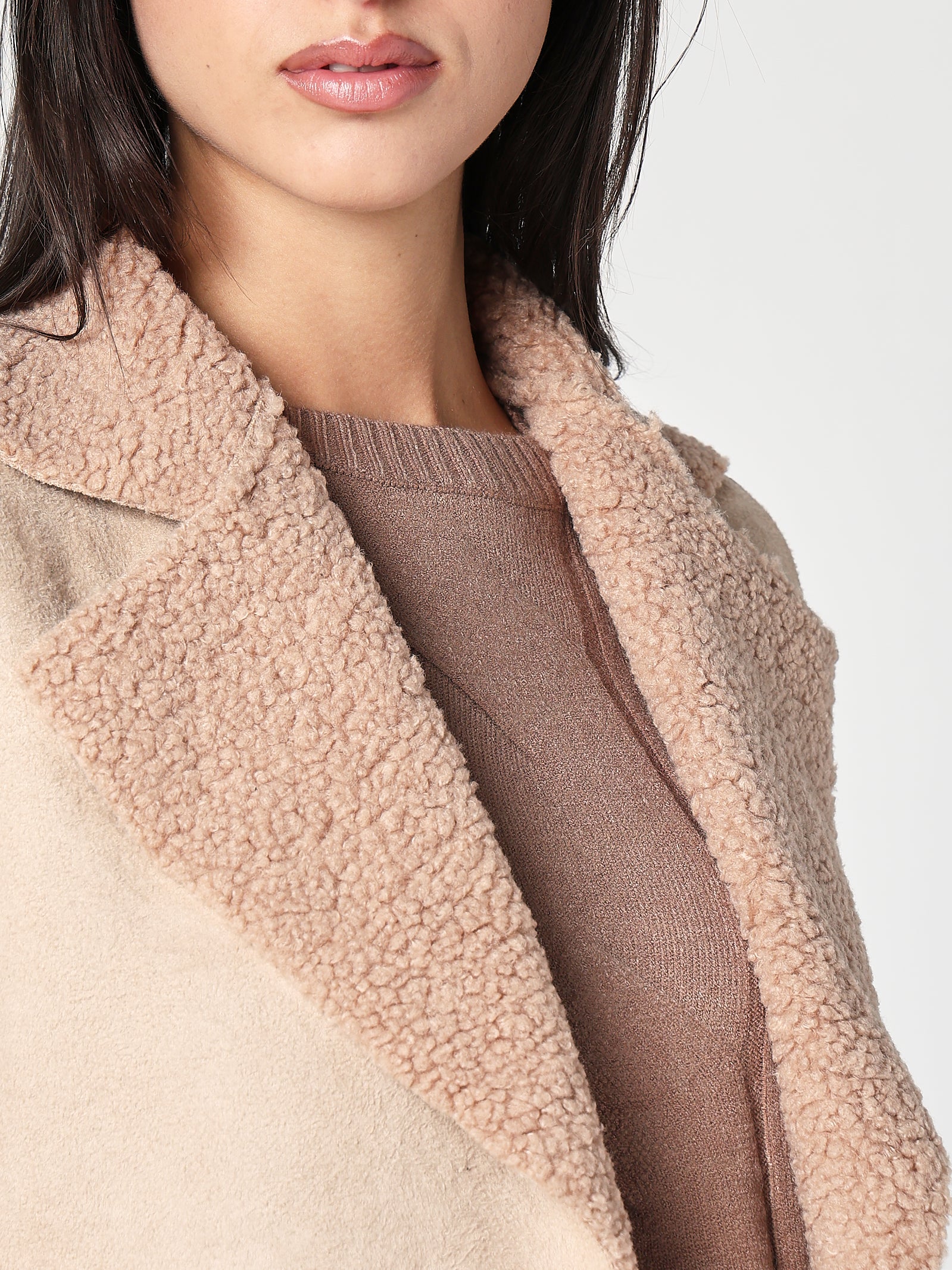Montone smanicato aperto in nuance scura, dallo stile versatile e contemporaneo. Il volume della pelliccia dialoga con linee dritte del look sottostante: abbinalo a tuta in jersey per un effetto soft, oppure sopra blazer oversize con pantaloni palazzo per una silhouette armoniosa.