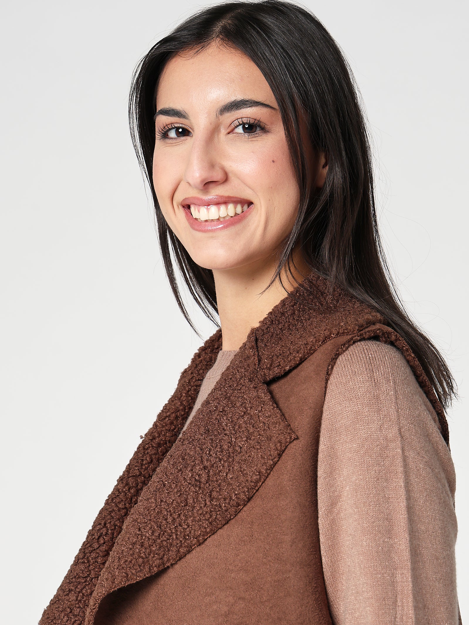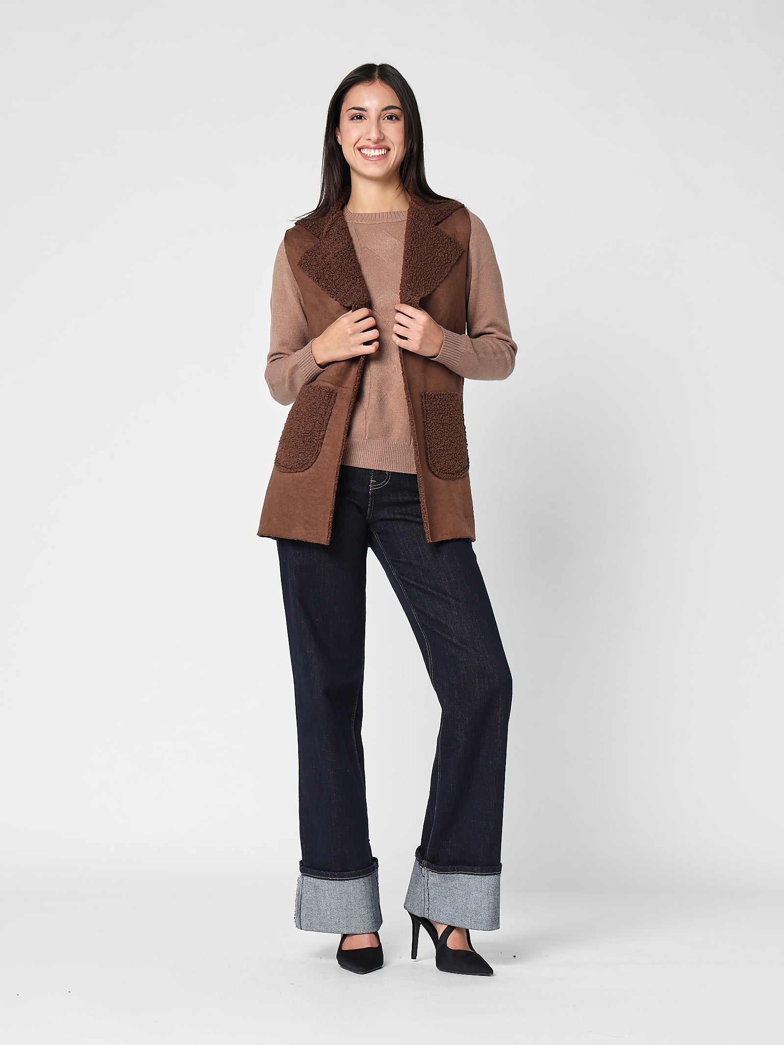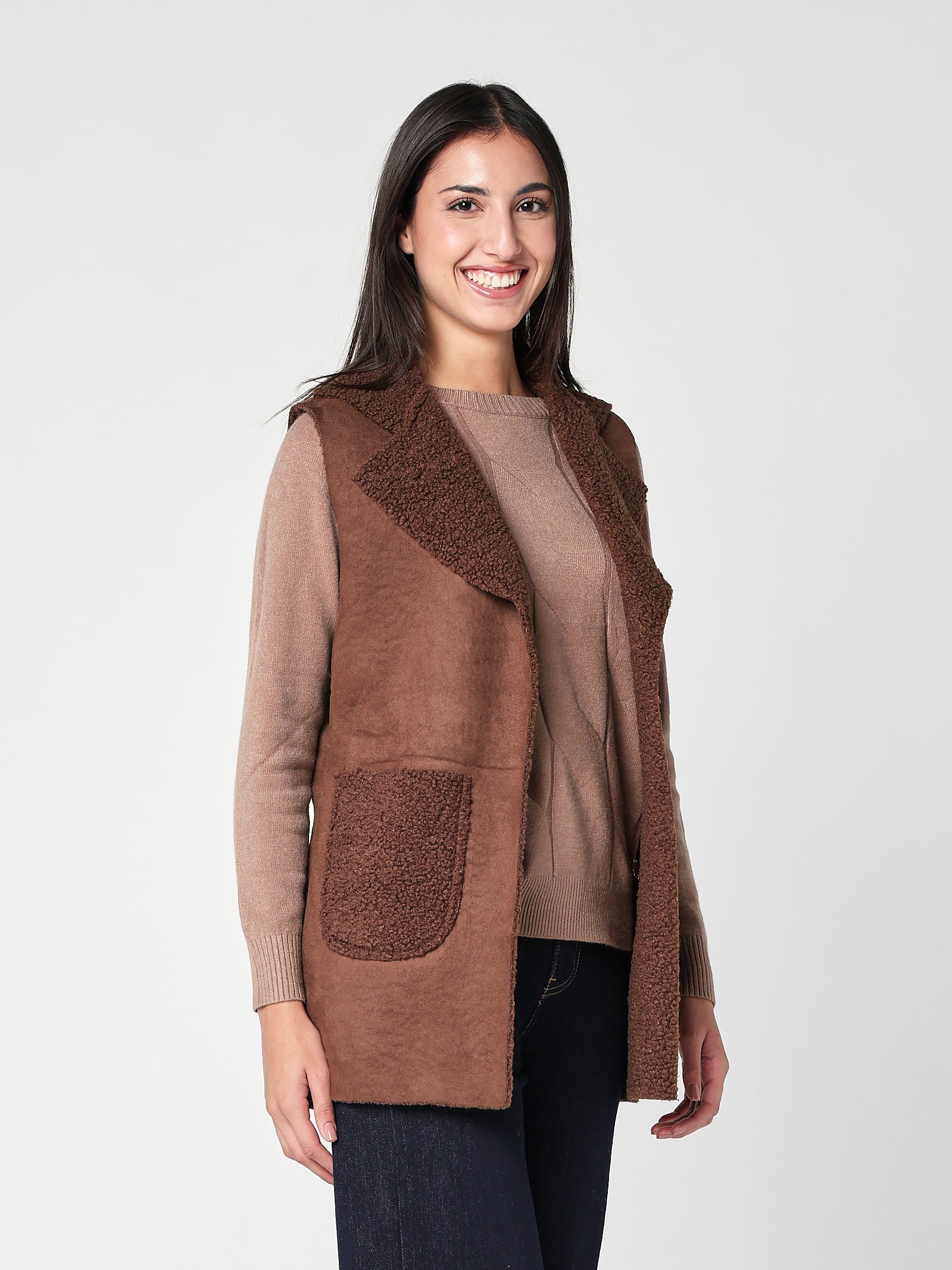 Gilet in montone aperto dal carattere deciso: il contrasto tra la texture morbida e la silhouette asciutta crea un gioco elegante. Usalo sopra una camicia bianca oversize e pantaloni tailleur per un look urbano sofisticato, oppure sopra un maglione nero e gonna di pelle per un effetto rock glam.