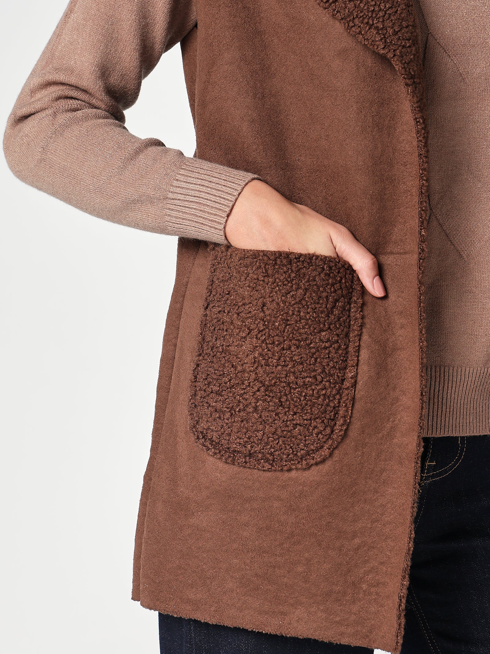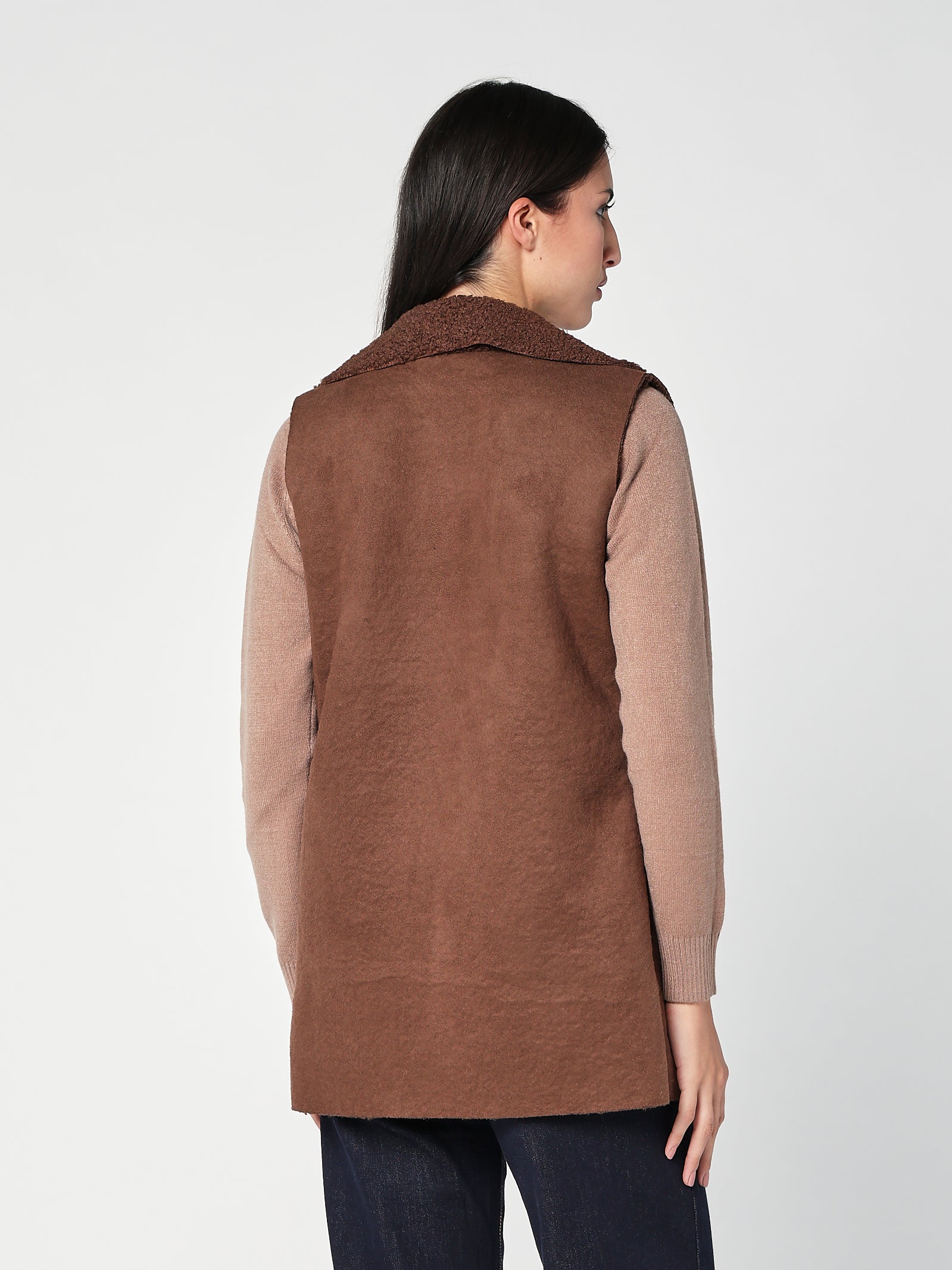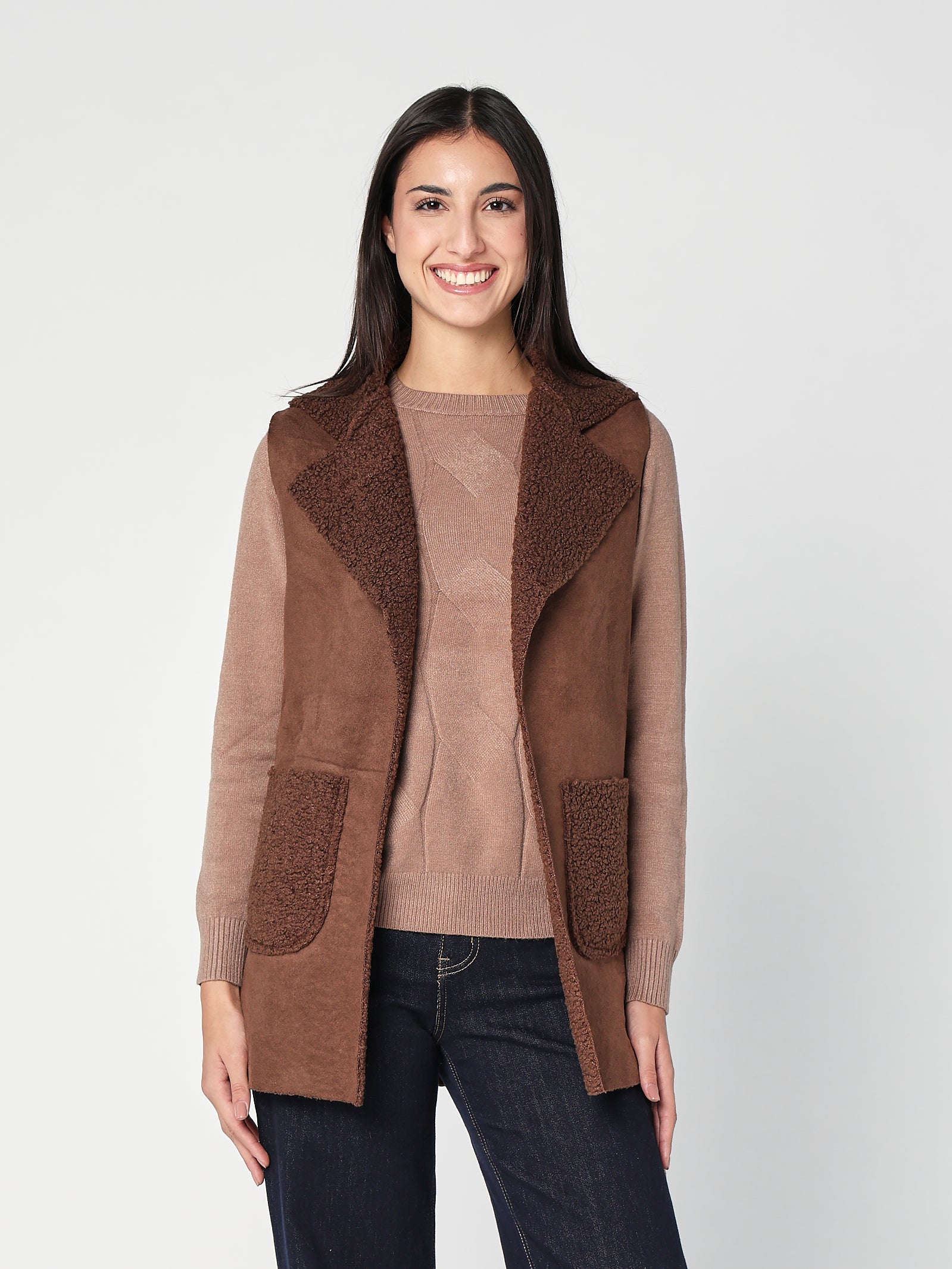 Gilet in montone aperto dal carattere deciso: il contrasto tra la texture morbida e la silhouette asciutta crea un gioco elegante. Usalo sopra una camicia bianca oversize e pantaloni tailleur per un look urbano sofisticato, oppure sopra un maglione nero e gonna di pelle per un effetto rock glam.