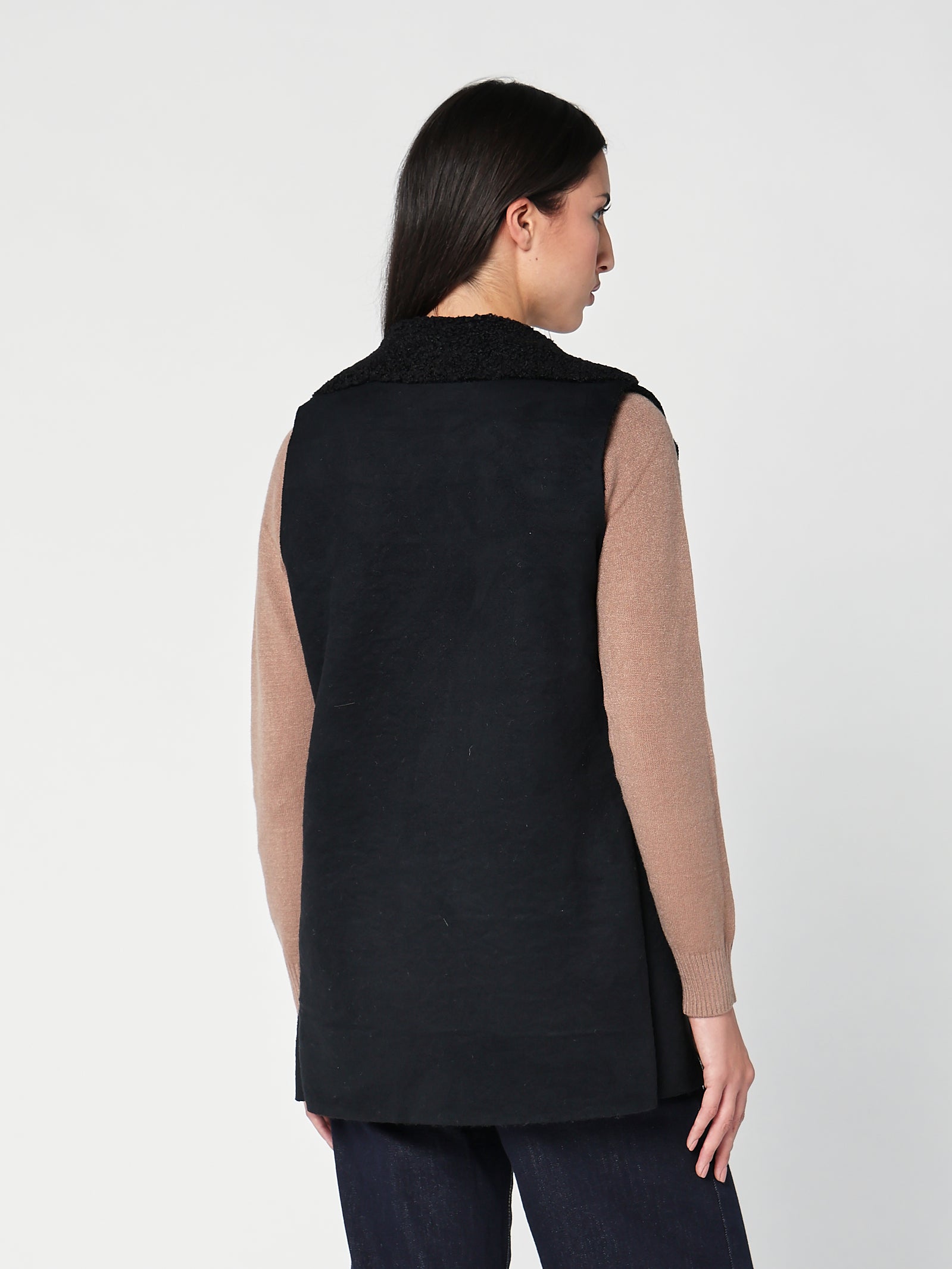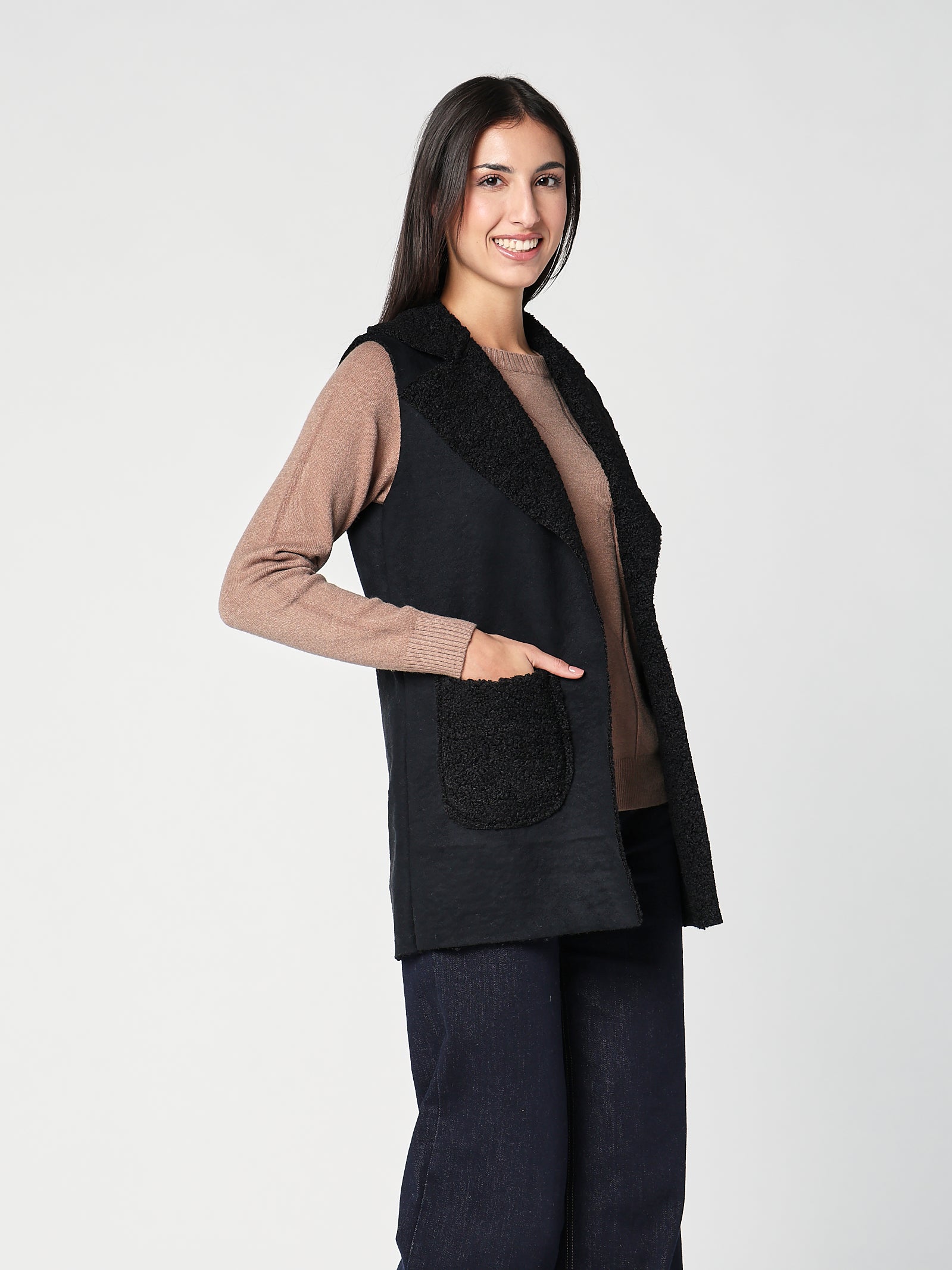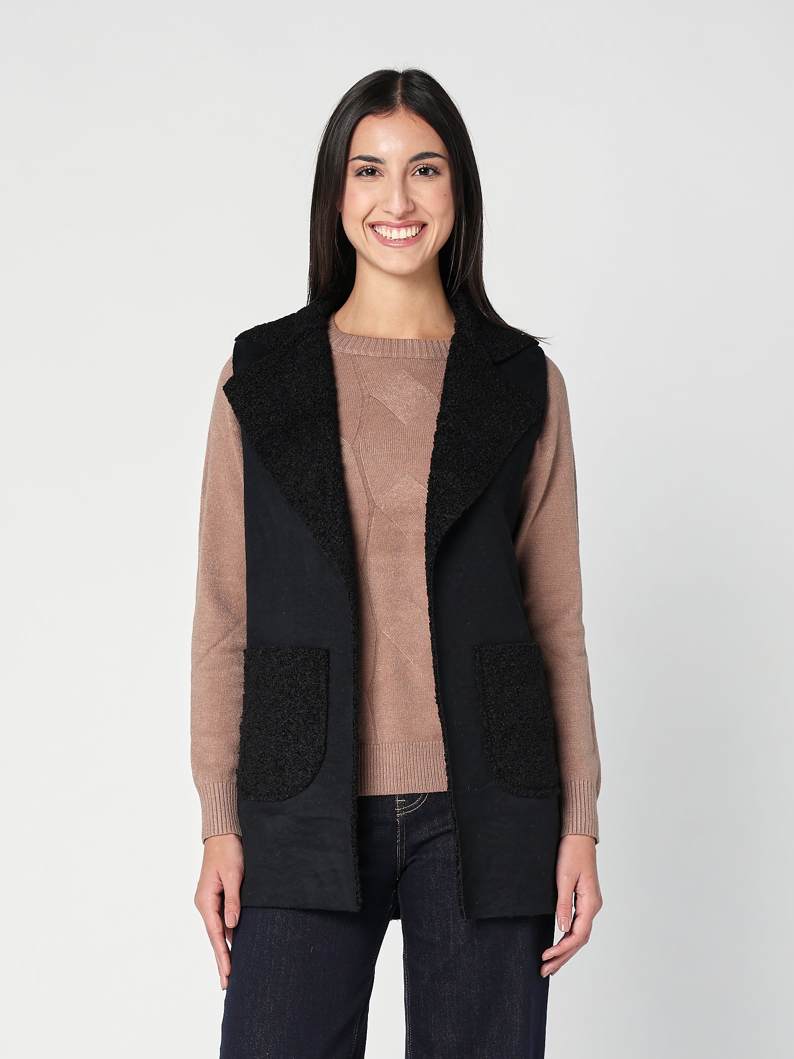 Montone smanicato aperto in pelliccia sintetica morbidissima, silhouette dritta e accogliente. Perfetto sopra maglioni a collo alto o felpe oversize: crea stratificazioni equilibrate con pantaloni slim o jeans skinny. Per la sera abbinalo a mini abito in velluto e stivali alti, aggiungendo una tracolla lucida per un tocco glam.