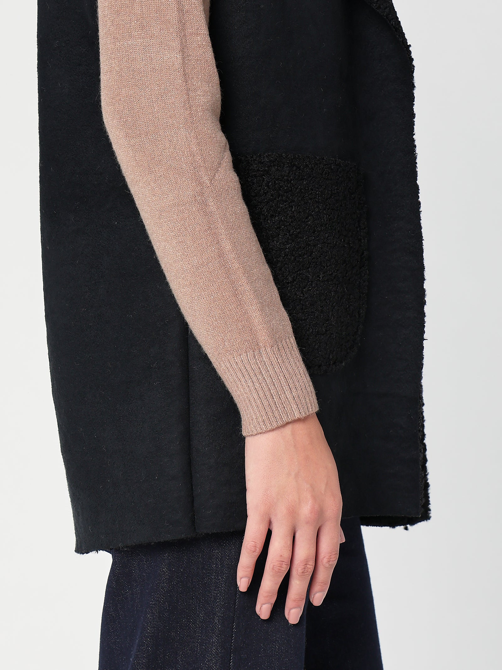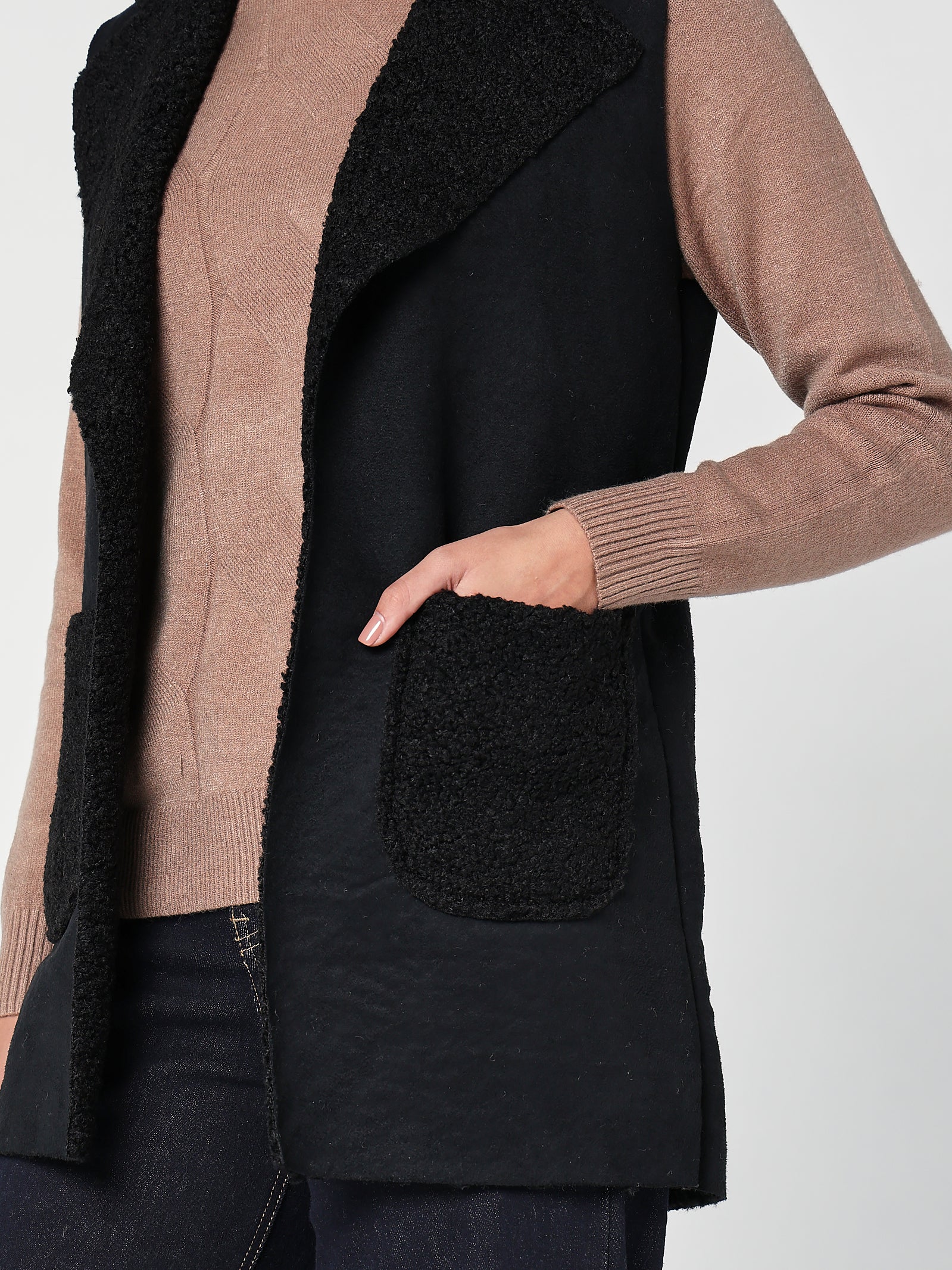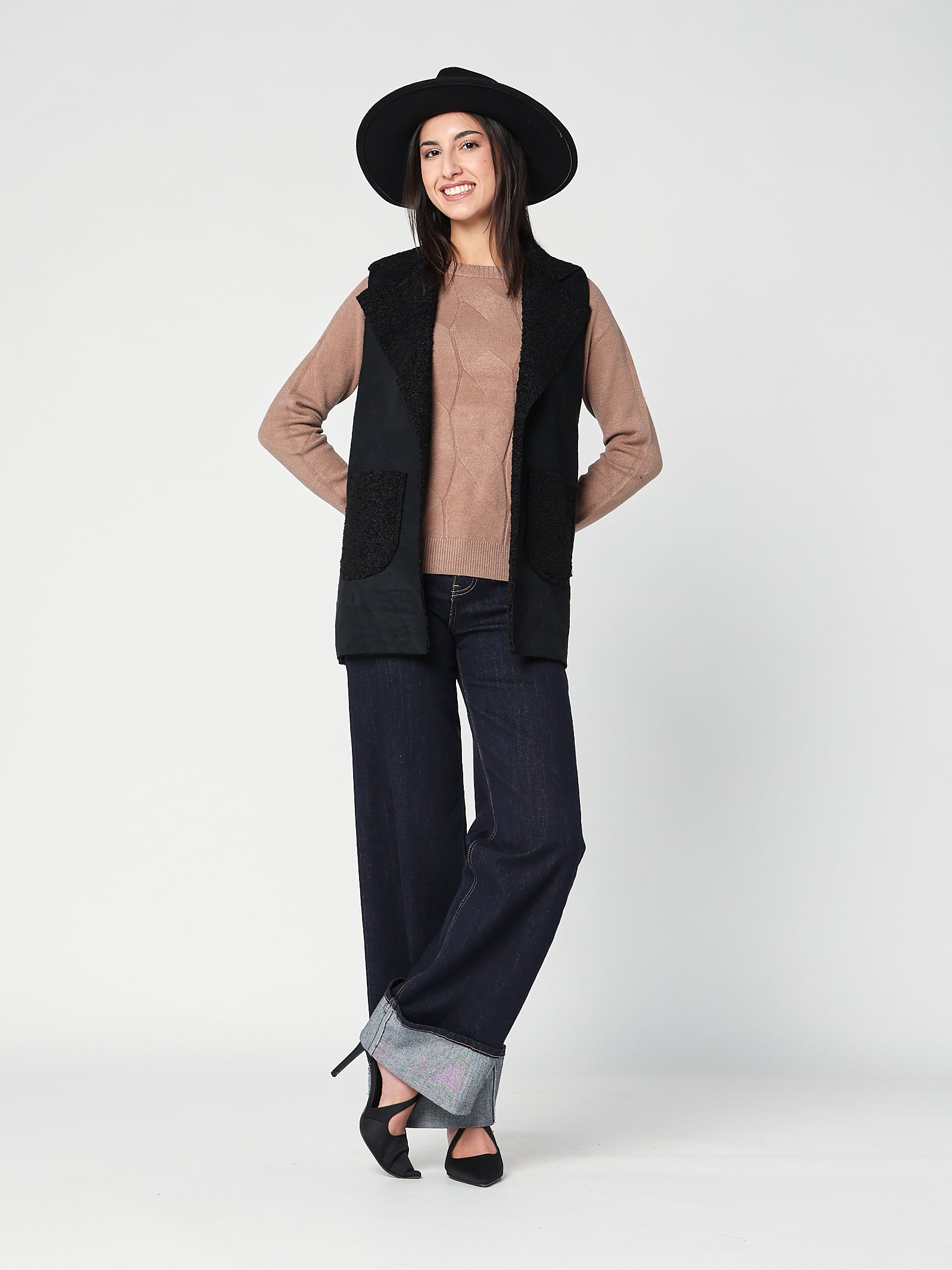 Montone smanicato aperto in pelliccia sintetica morbidissima, silhouette dritta e accogliente. Perfetto sopra maglioni a collo alto o felpe oversize: crea stratificazioni equilibrate con pantaloni slim o jeans skinny. Per la sera abbinalo a mini abito in velluto e stivali alti, aggiungendo una tracolla lucida per un tocco glam.