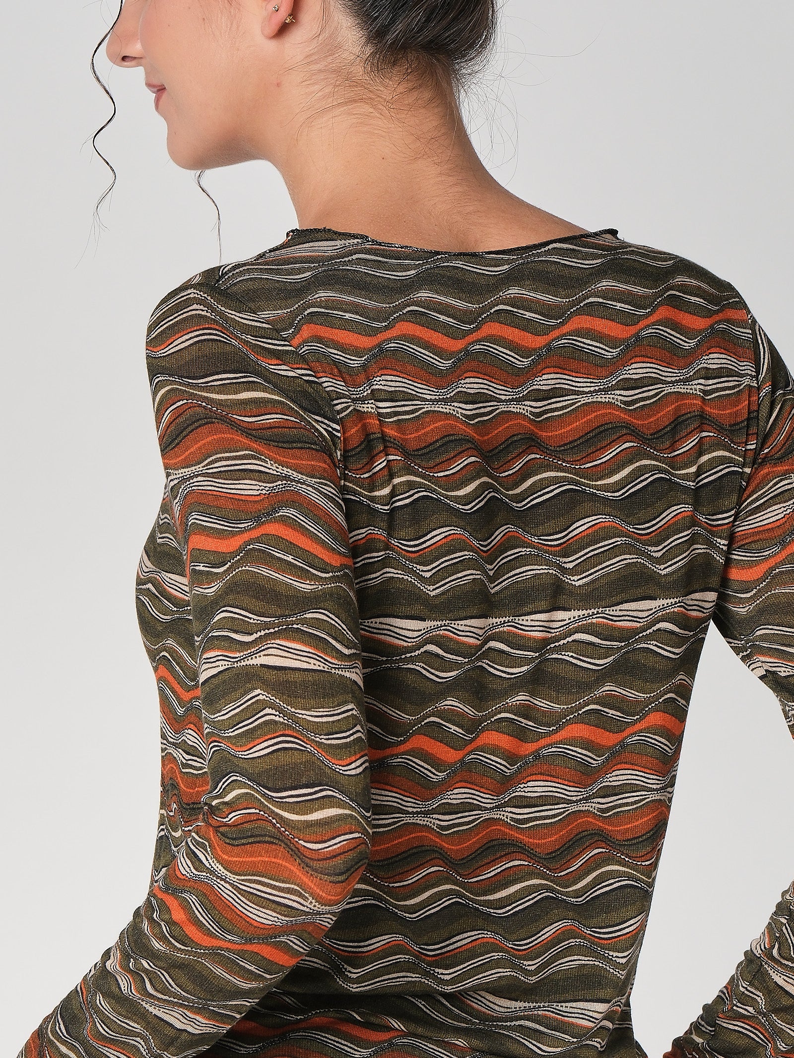 Dettagli: collo barchetta che valorizza spalle e décolleté, fantasia all over, finiture pulite