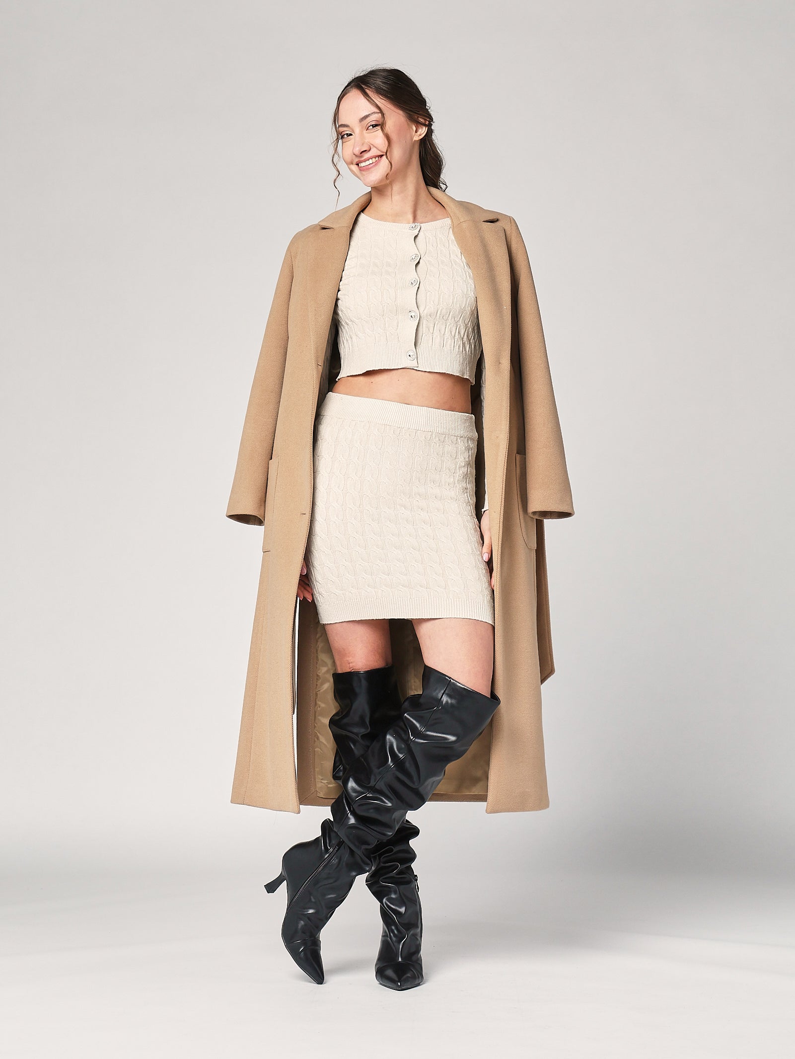 Completo in maglia con trecce, un must-have cozy chic per l’autunno inverno. La texture morbida e la silhouette equilibrata rendono questo set perfetto per un’eleganza rilassata e naturale.