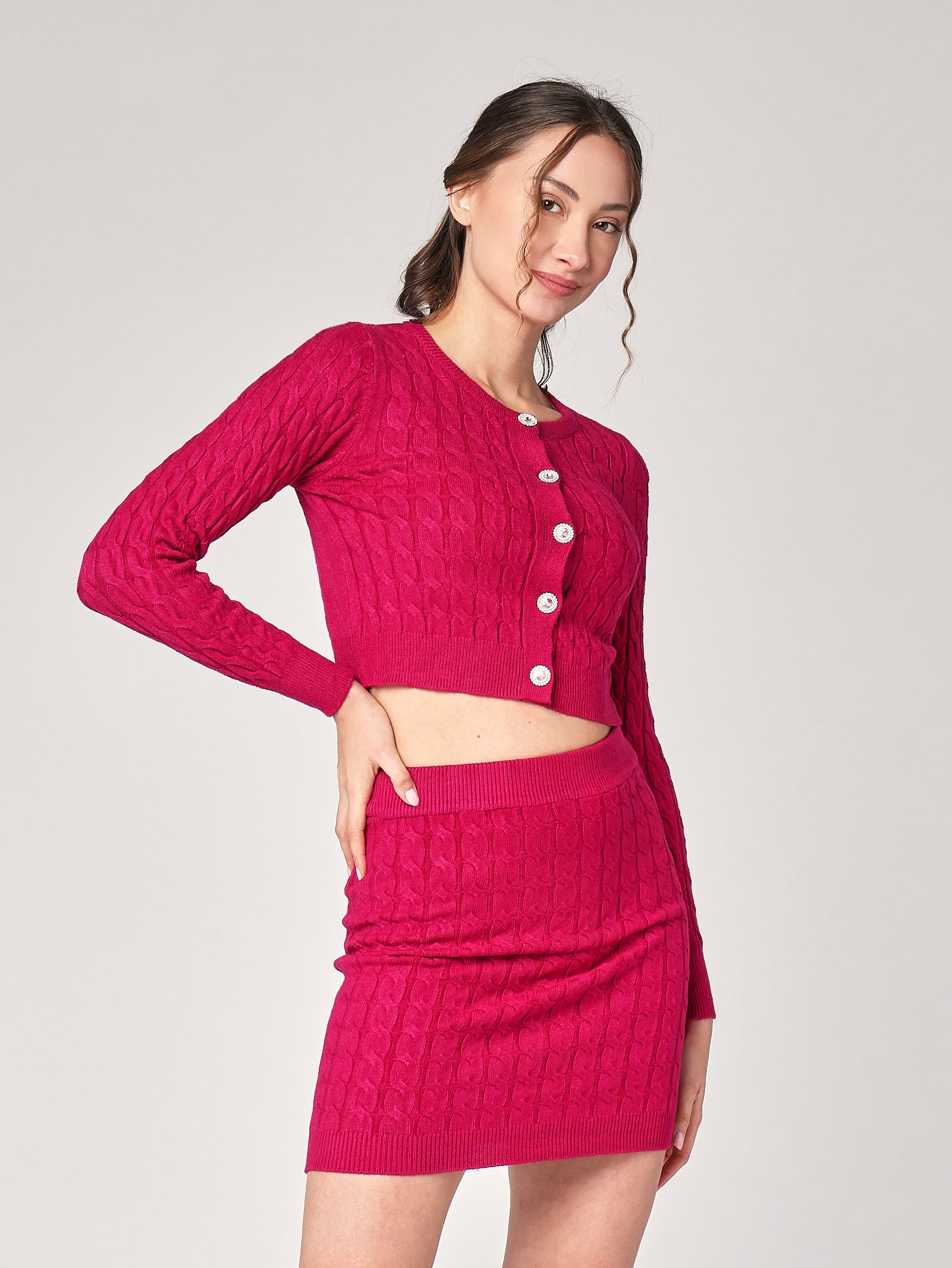 Completo golfino e gonna chic, perfetto per un’eleganza disinvolta. Le trecce sottili donano movimento e texture, mentre la maglia morbida avvolge con comfort e stile.