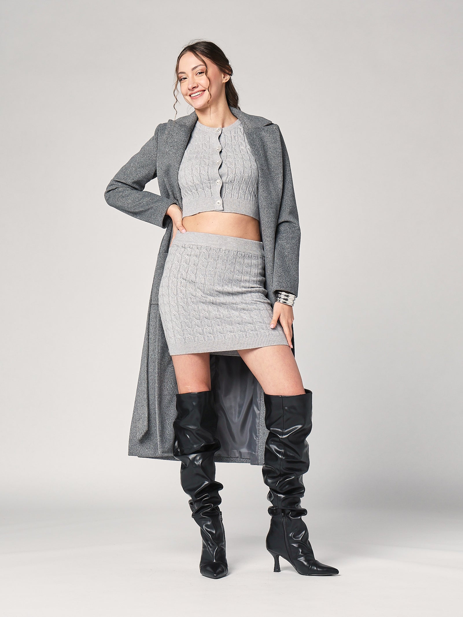 Completo golfino e gonna in maglia, un mix di comfort e raffinatezza. Il top corto e la gonna coordinata creano una silhouette elegante e moderna, perfetta per look femminili e curati.