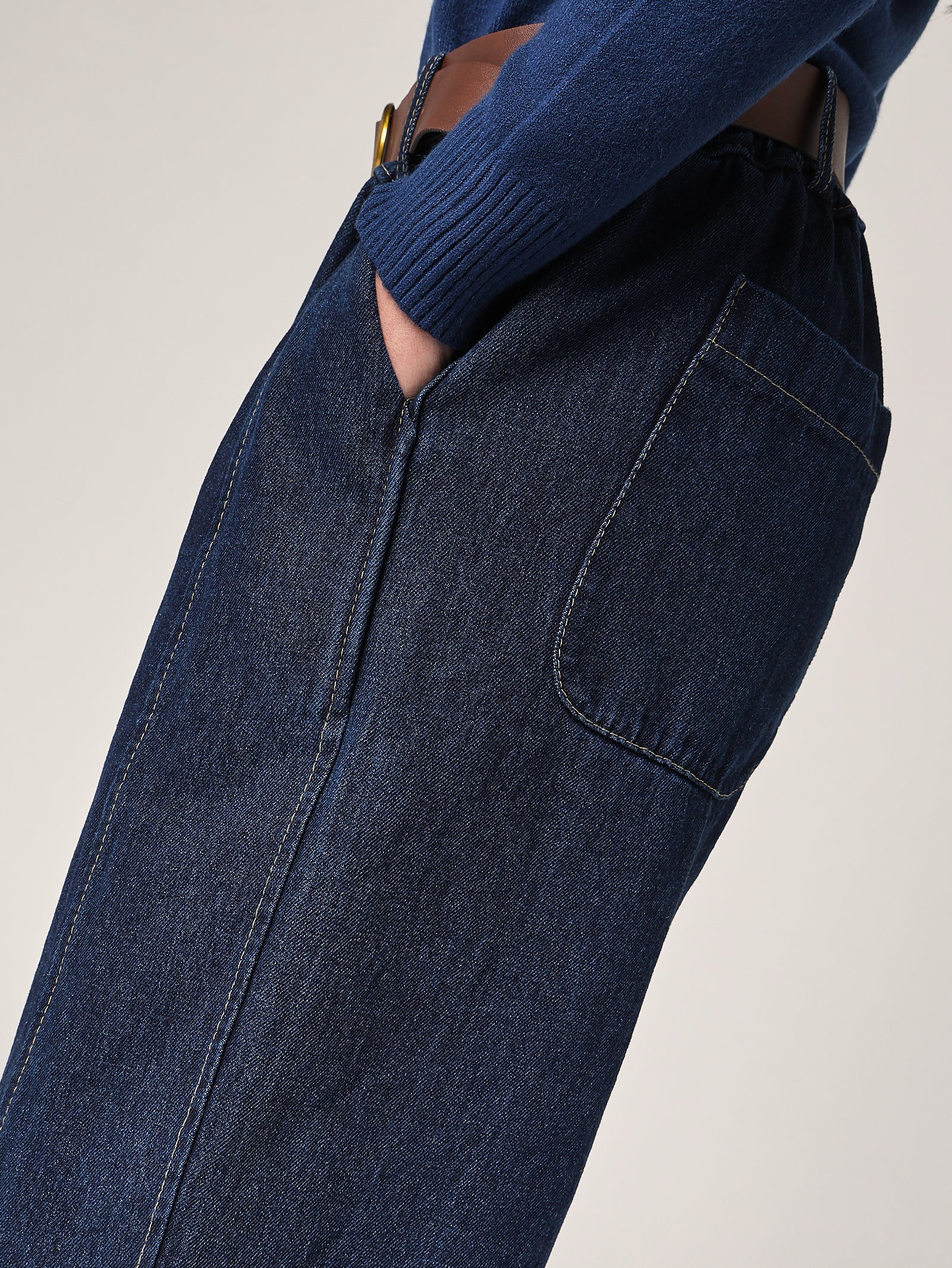 Dettaglio sartoriale: cuciture tono su tono e chiusura frontale