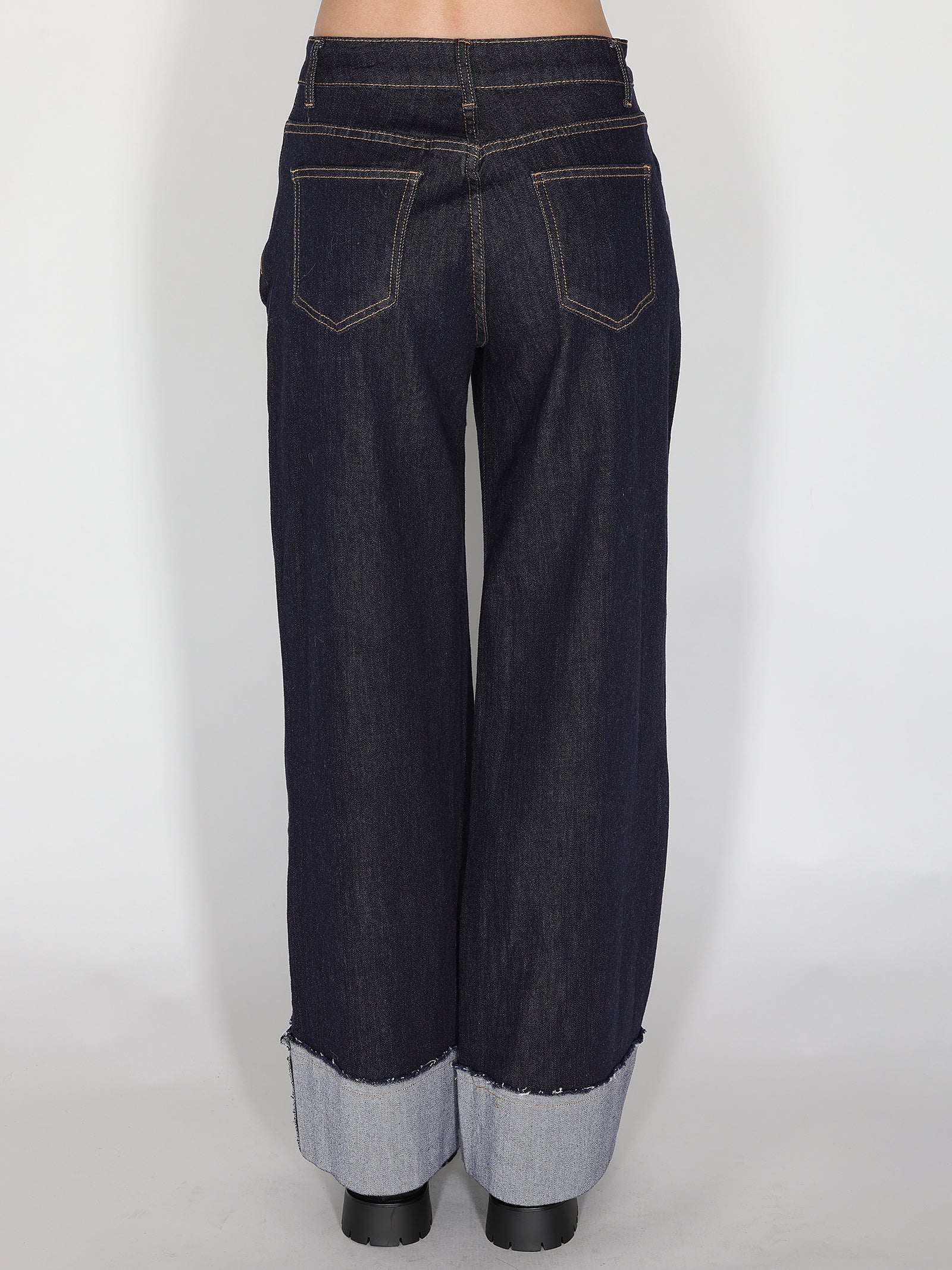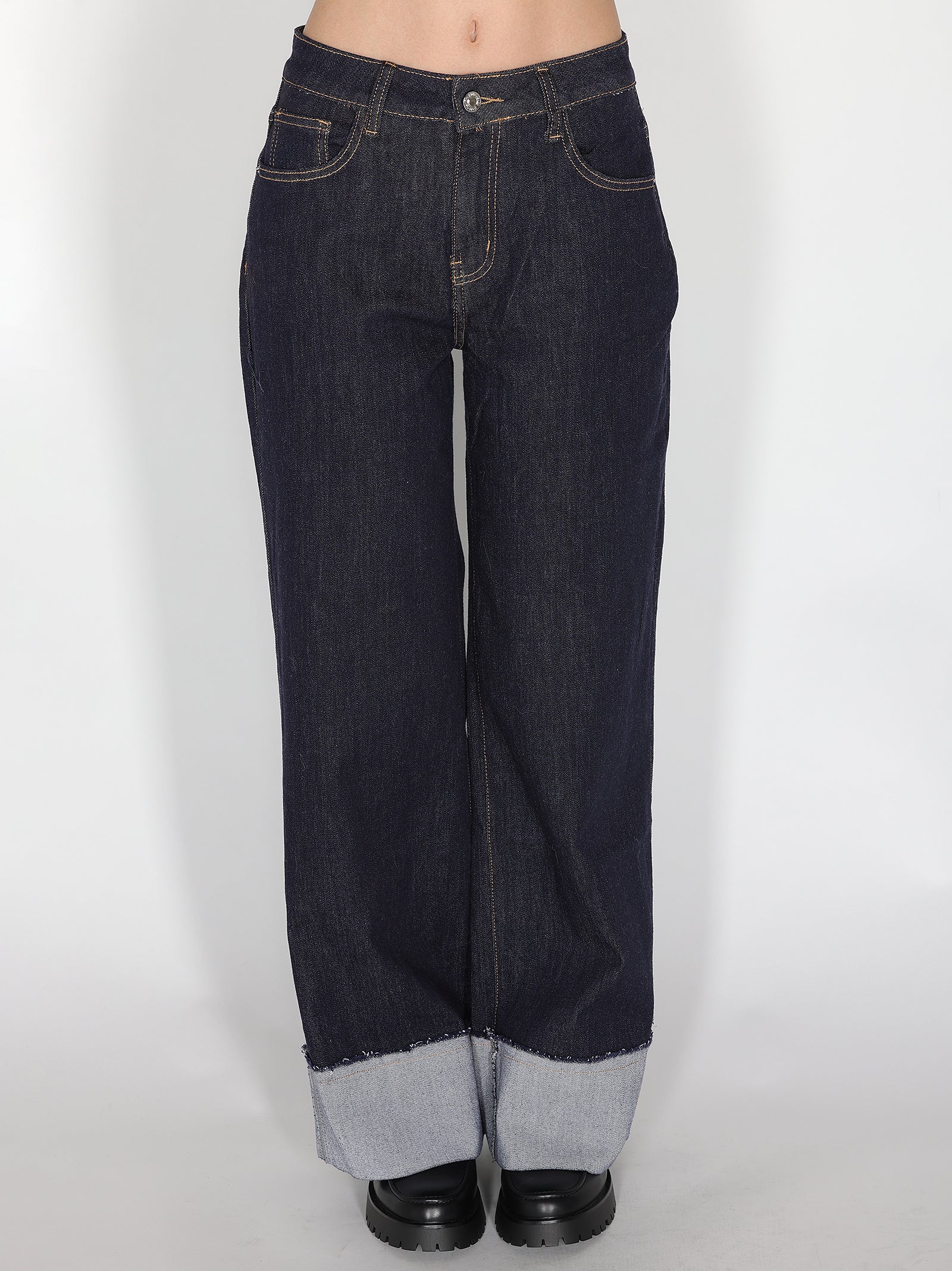 Jeans a palazzo con risvolto, un modello moderno e raffinato che unisce comfort e stile. La gamba ampia e la vita regolare slanciano la figura, mentre il risvolto sul fondo dona un tocco trendy e curato. Un capo perfetto per chi ama un look casual chic, facile da abbinare a maglie, camicie o blazer.