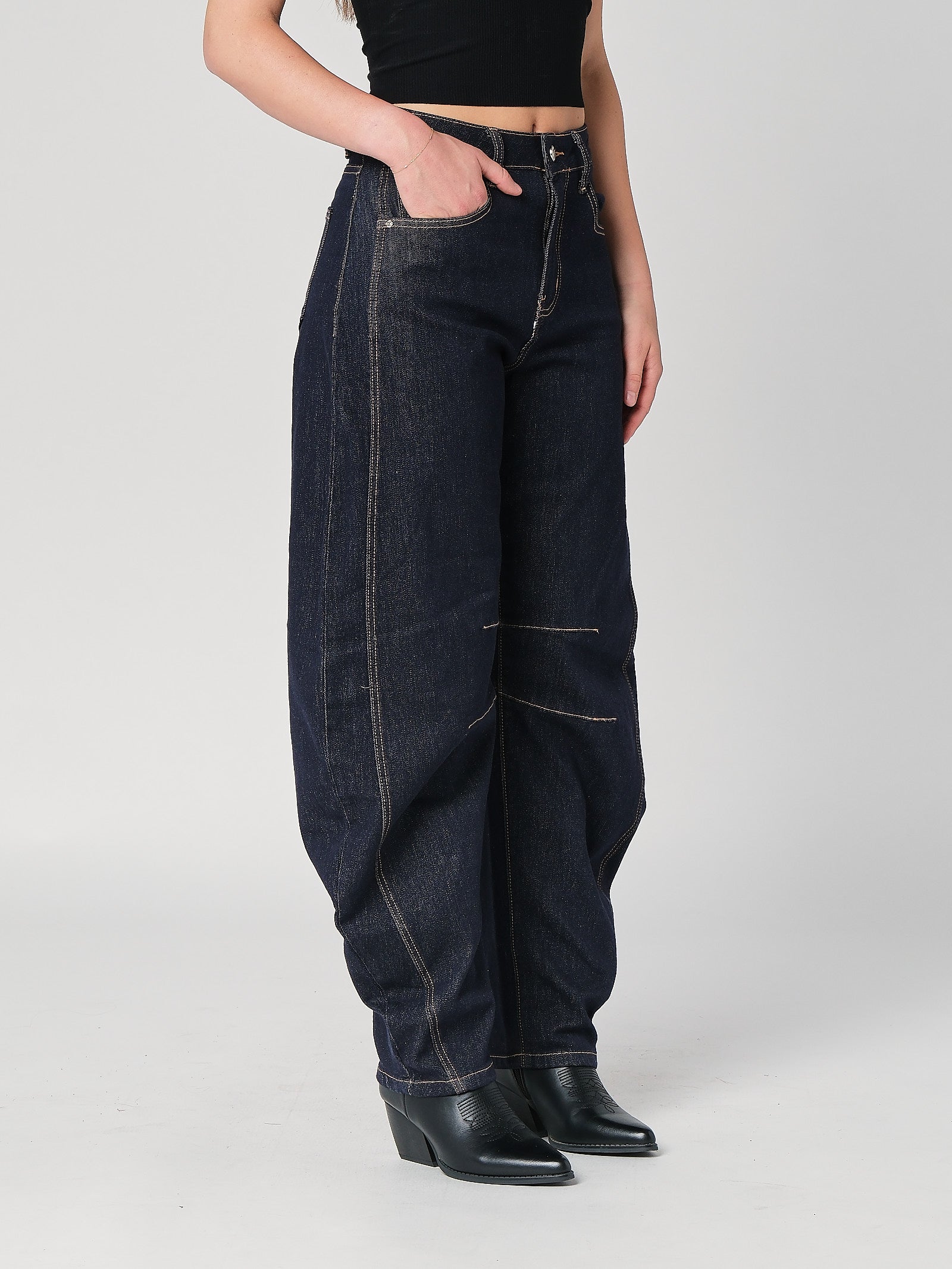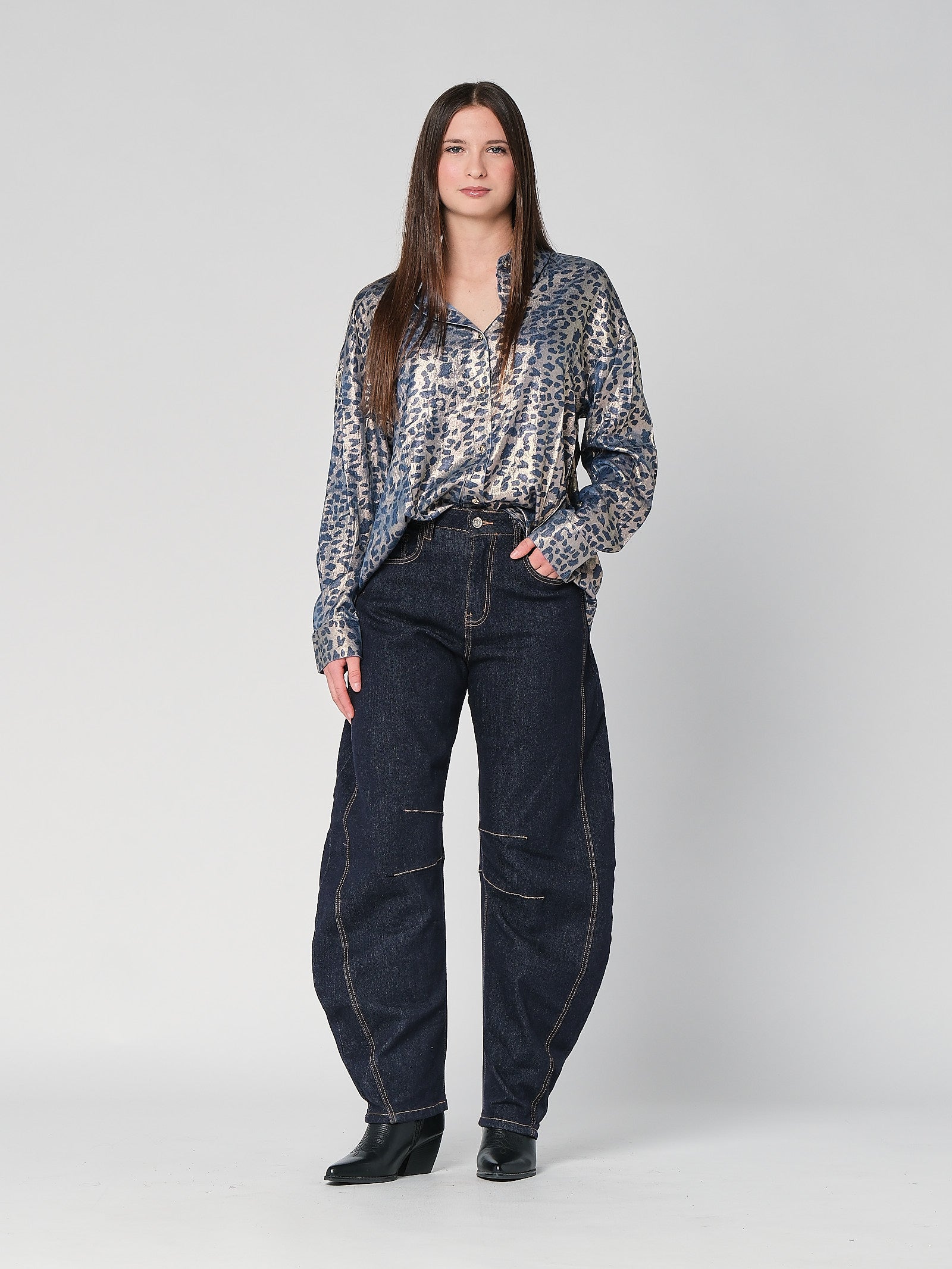 I jeans gamba larga fanno upgrade al volo: vita alta che valorizza, gamba ampia che scende morbida e silhouette contemporanea. Sono jeans donna pensati per stare bene tutto il giorno, con quel volume studiato che slancia senza rinunciare al comfort. Le impunture sottolineano la struttura del denim donna e danno carattere. Se cerchi un jeans a vita alta che sta bene con tutto, questi wide leg sono la scelta furba.