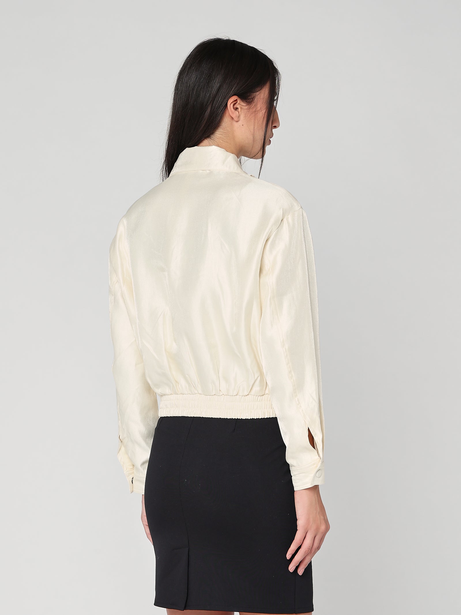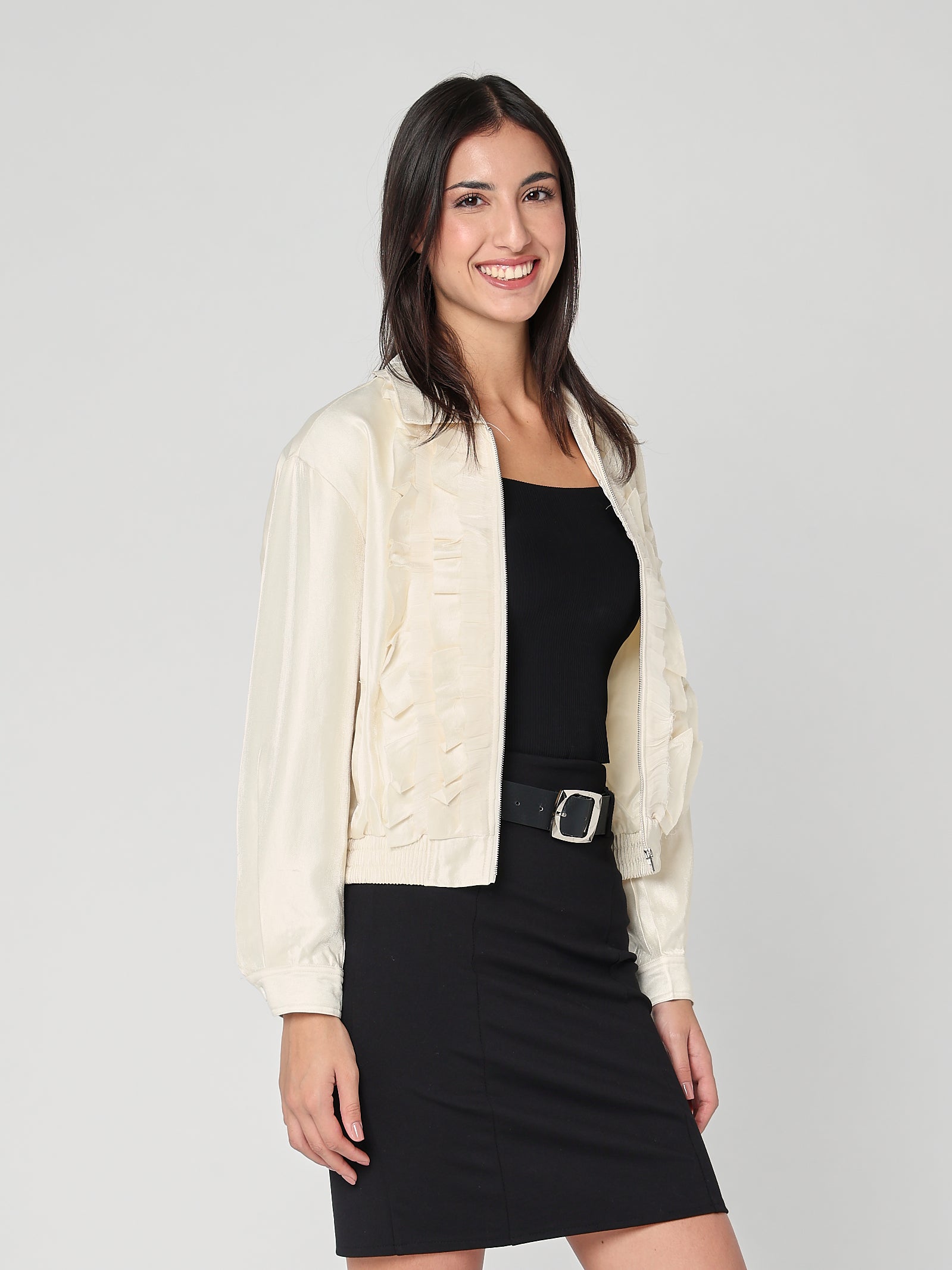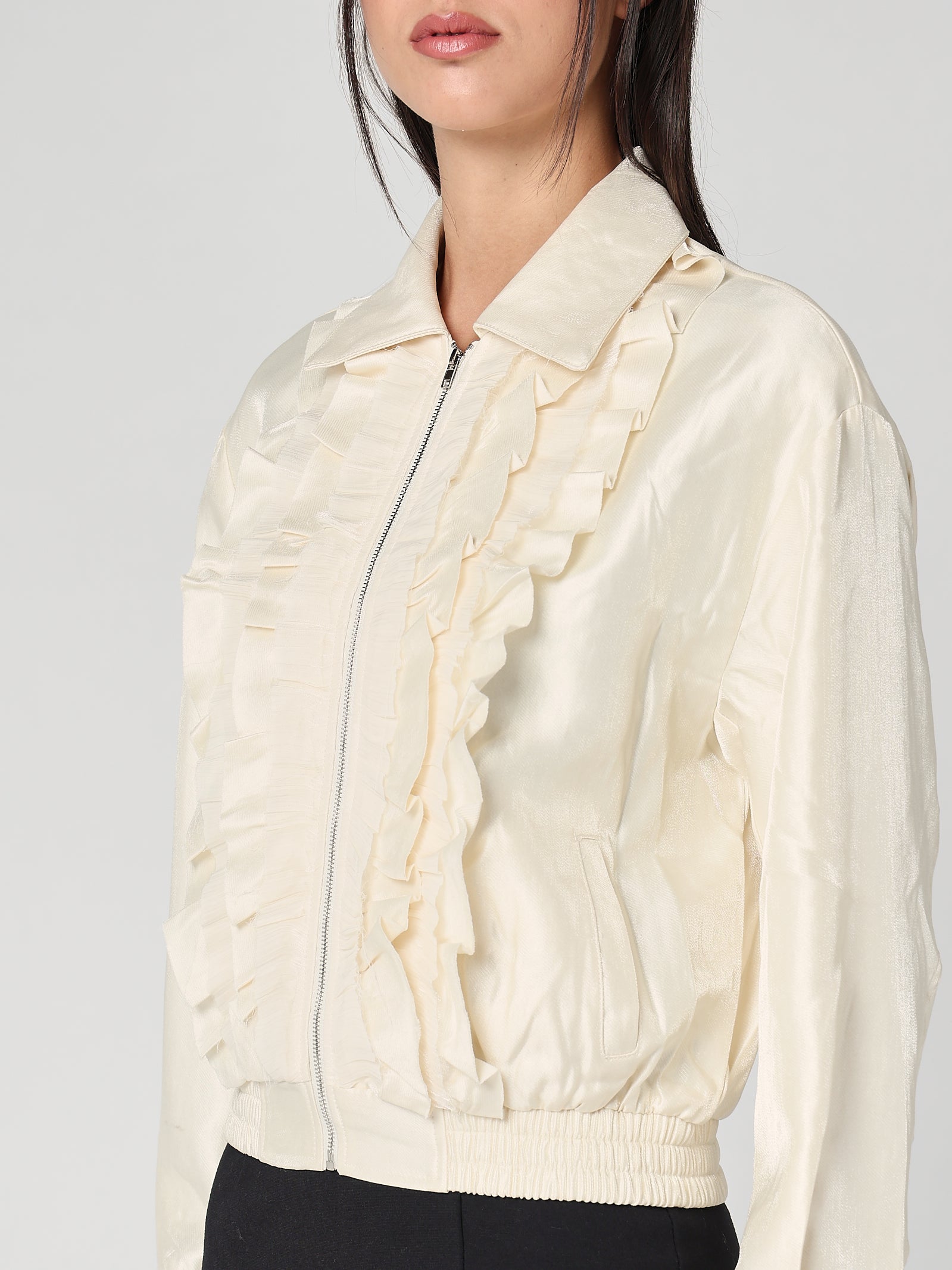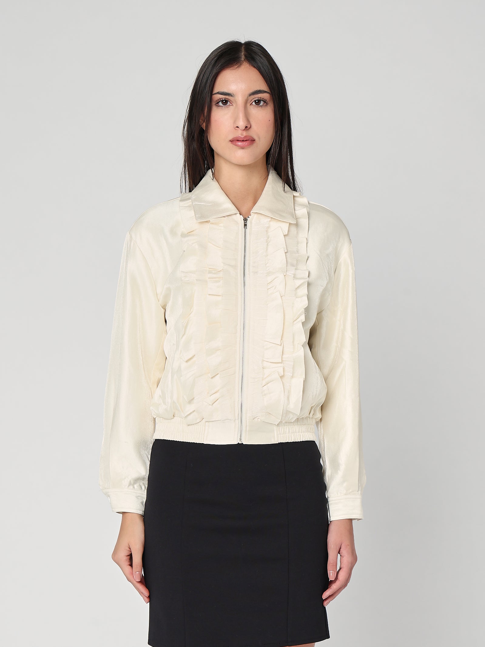 Giacca leggera effetto satin con chiusura a zip e balze sul davanti che aggiungono movimento e un tocco glam.