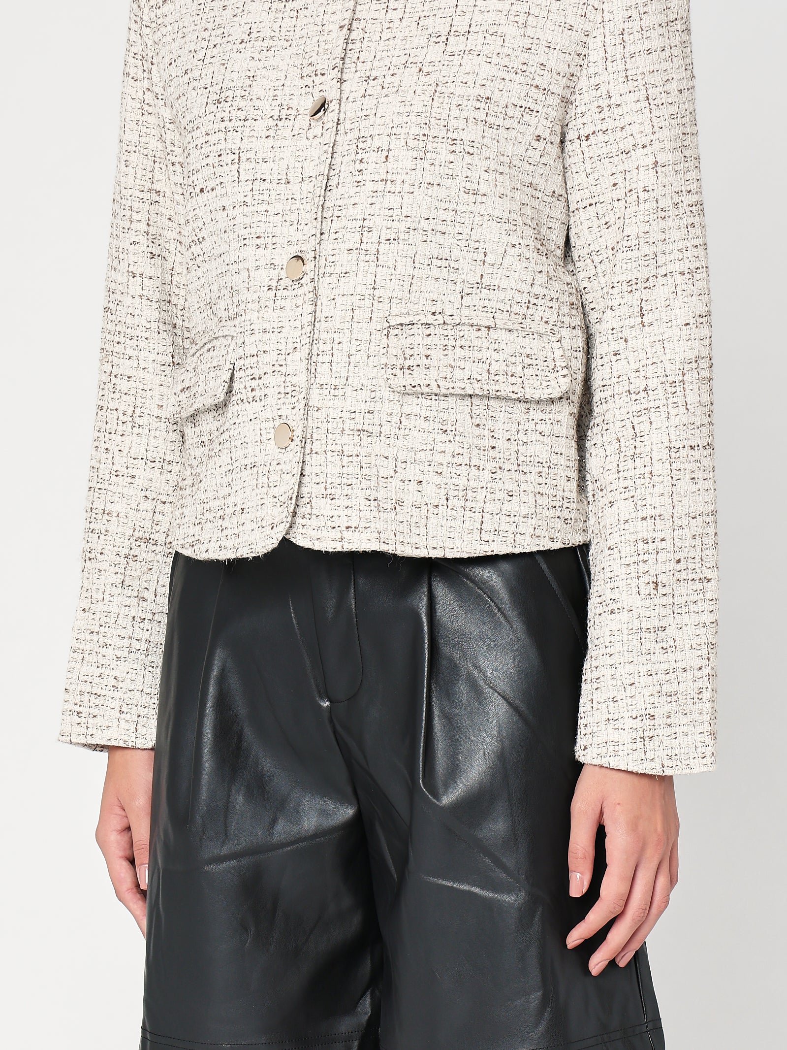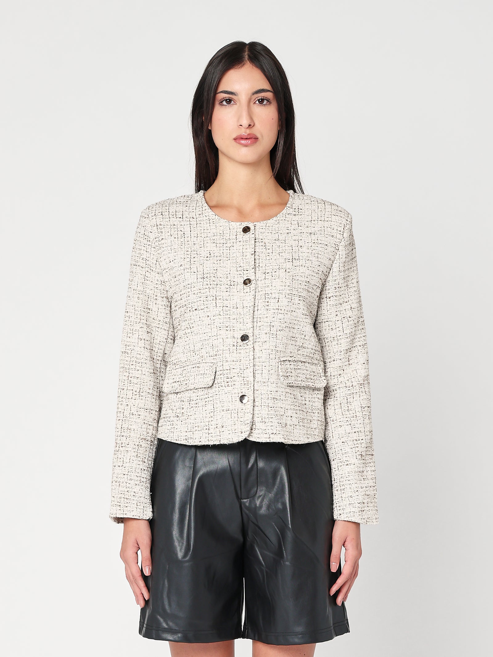 Giacca corta con filato lurex che illumina il look con discrezione ed eleganza. Il taglio moderno e la lunghezza sopra la vita la rendono perfetta per valorizzare la silhouette e dare struttura a pantaloni o gonne a vita alta. Un capo ideale per le serate o per aggiungere un tocco brillante agli outfit quotidiani.