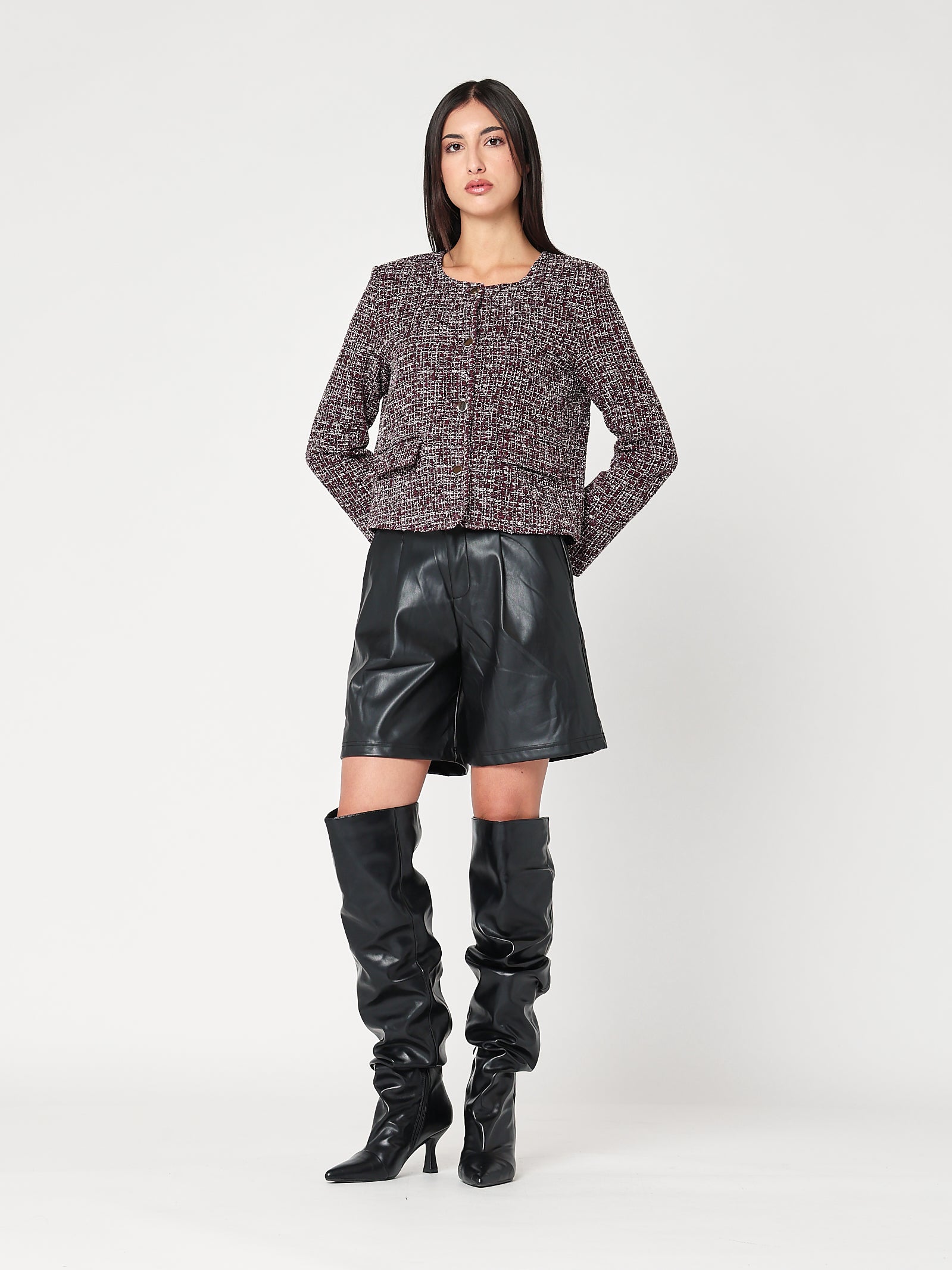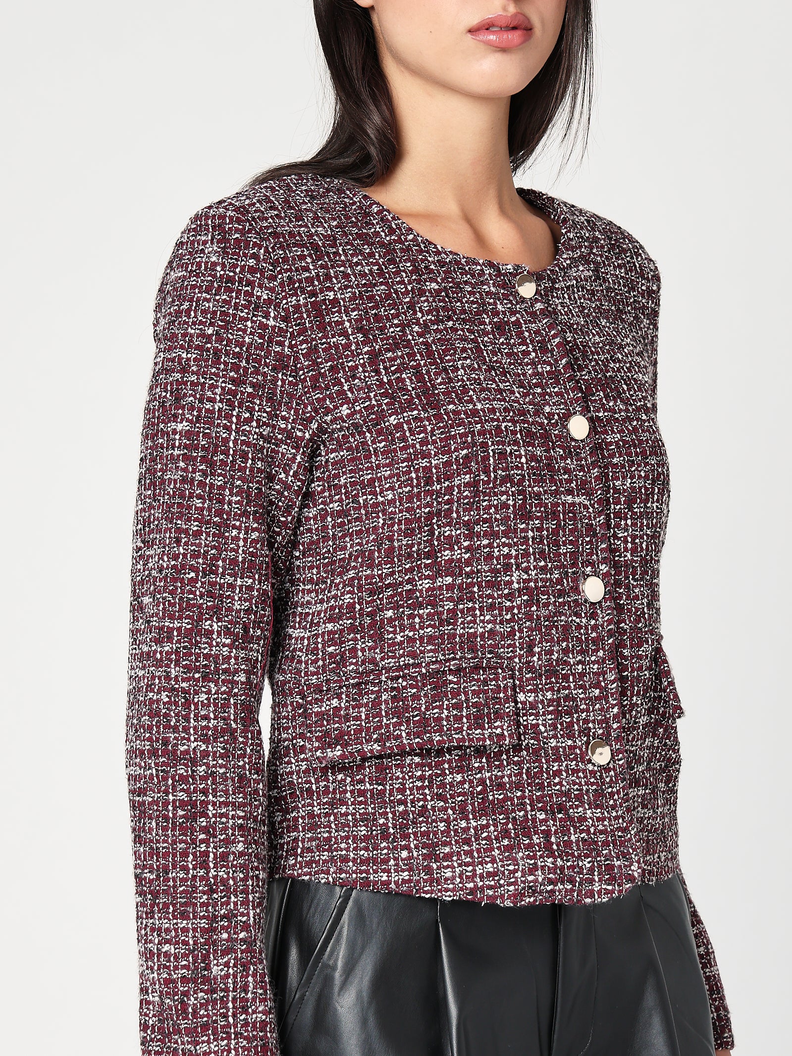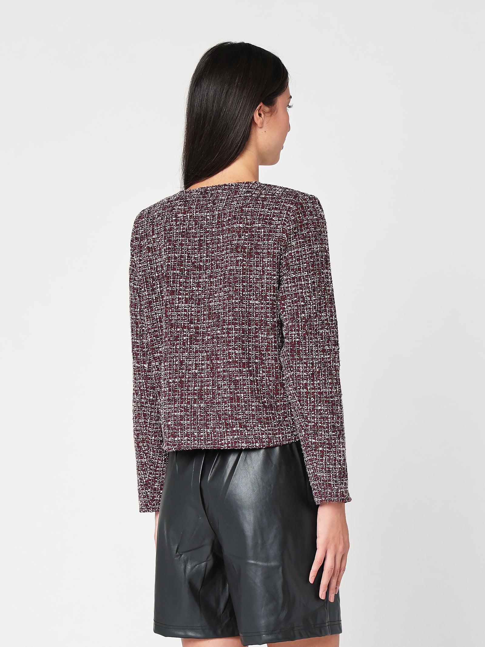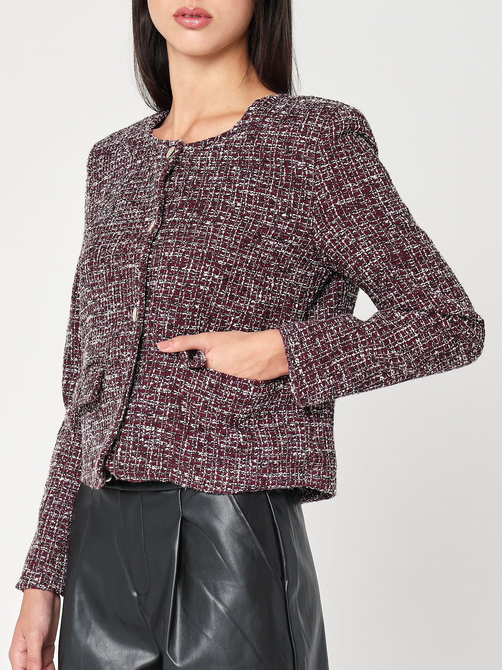 Giacca corta con filato lurex che illumina il look con discrezione ed eleganza. Il taglio moderno e la lunghezza sopra la vita la rendono perfetta per valorizzare la silhouette e dare struttura a pantaloni o gonne a vita alta. Un capo ideale per le serate o per aggiungere un tocco brillante agli outfit quotidiani.