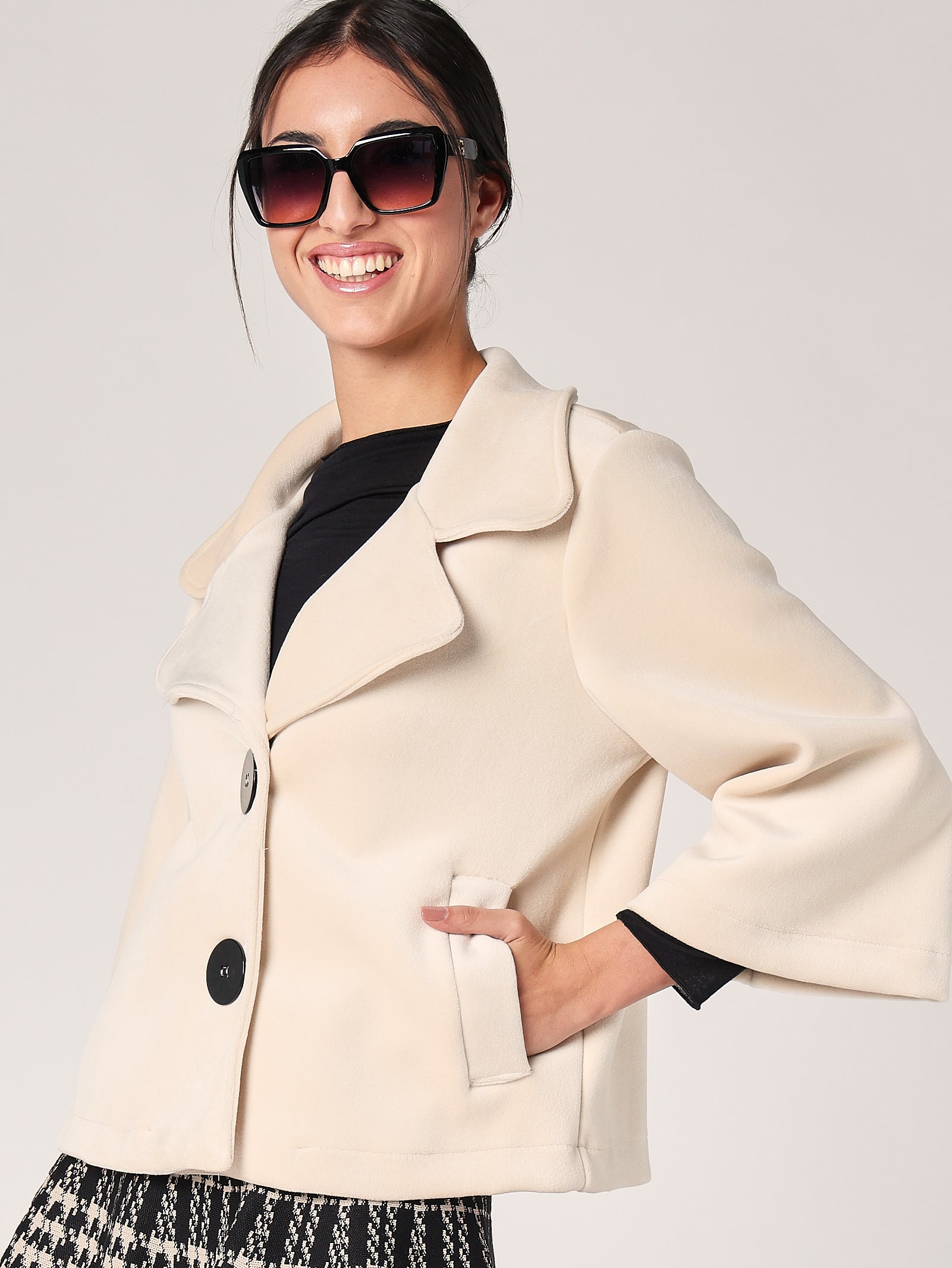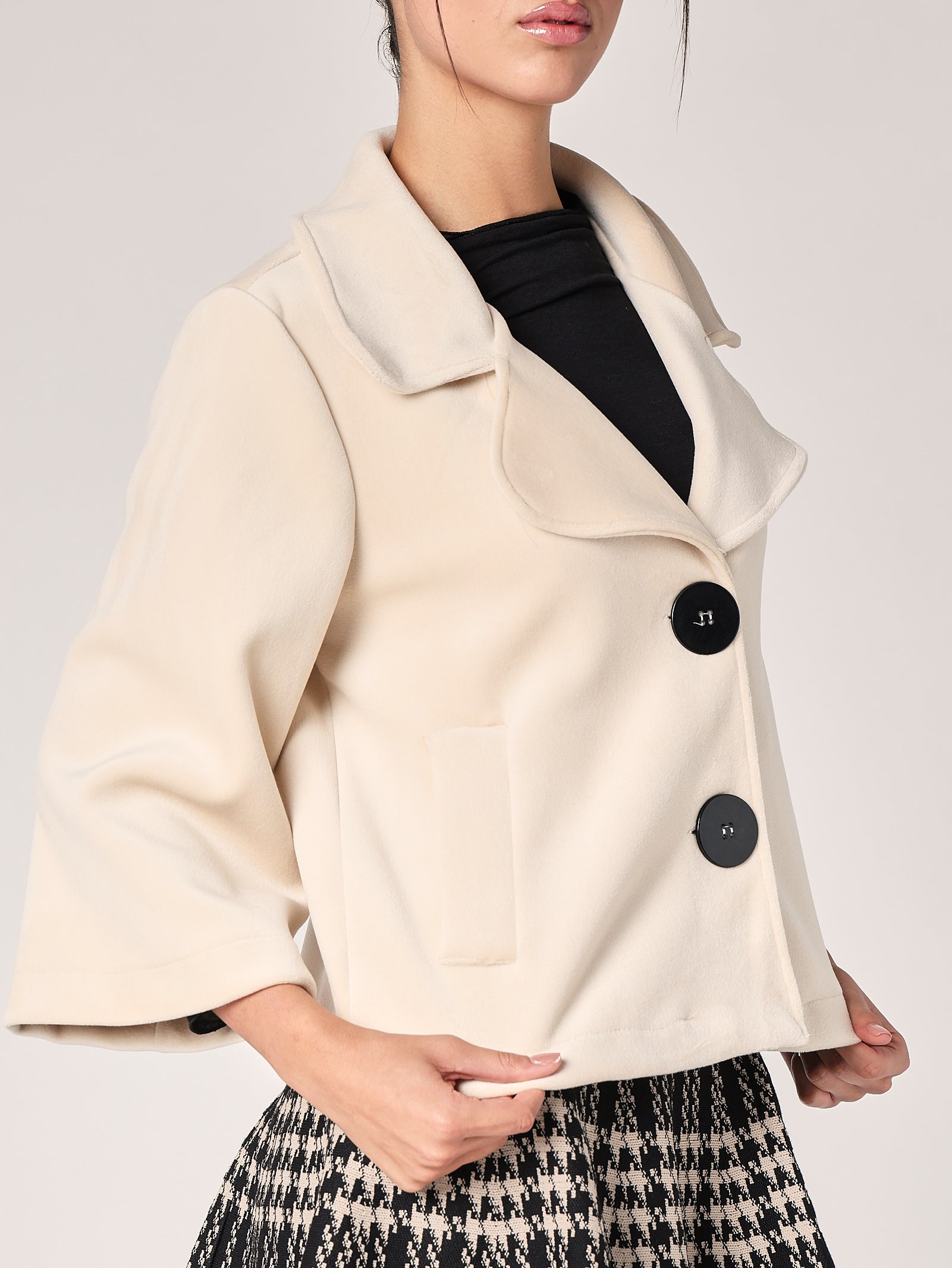Dettaglio sartoriale: doppio bottone frontale, revers classico