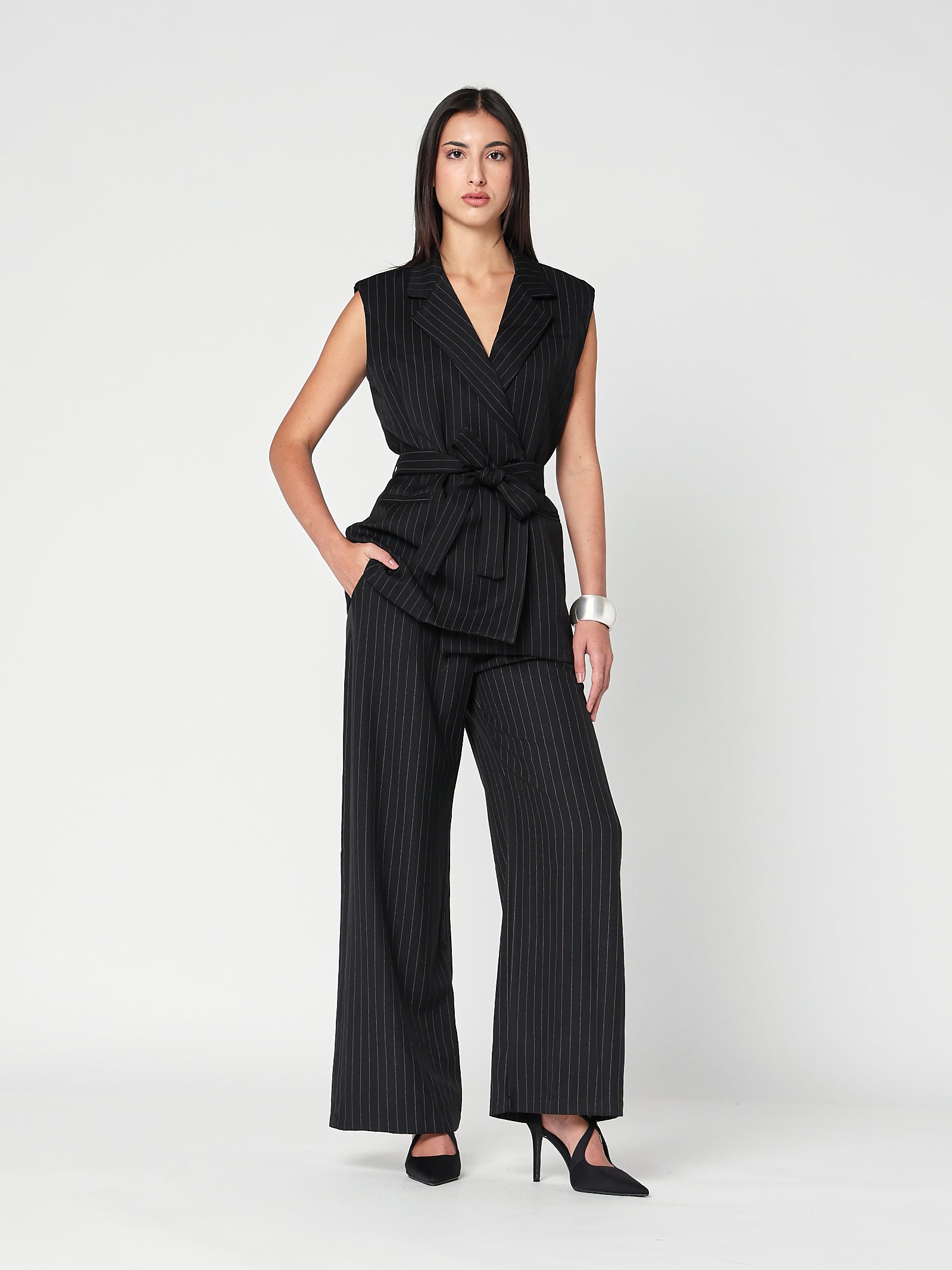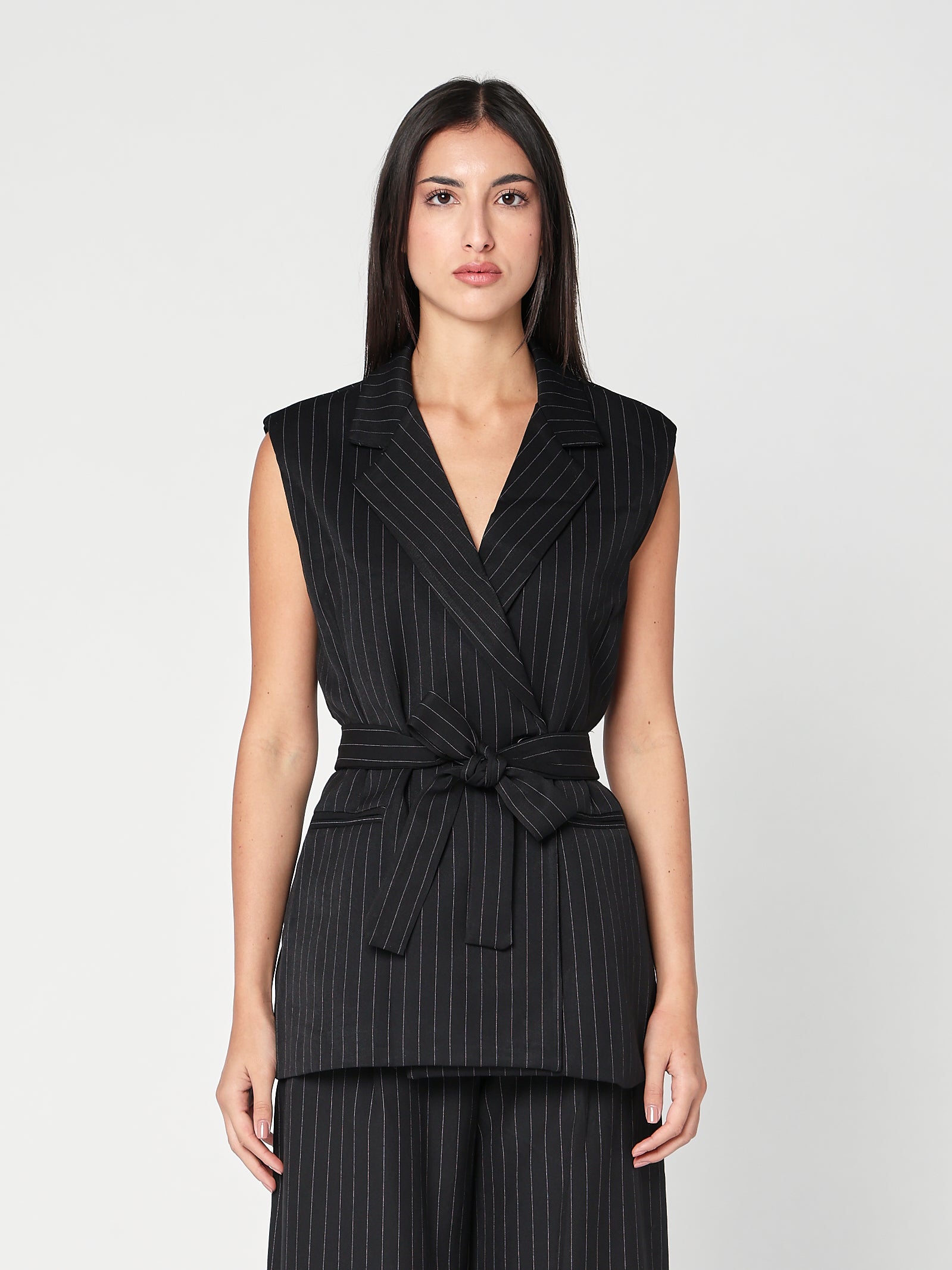 Gilet a righe dal taglio sartoriale, arricchito da cintura coordinata che valorizza il punto vita. Un capo elegante e versatile, perfetto da indossare su camicie o dolcevita per dare struttura al look. Il design a righe verticali slancia la figura e si presta a outfit da ufficio o aperitivi serali con pantaloni ampi o gonne midi.