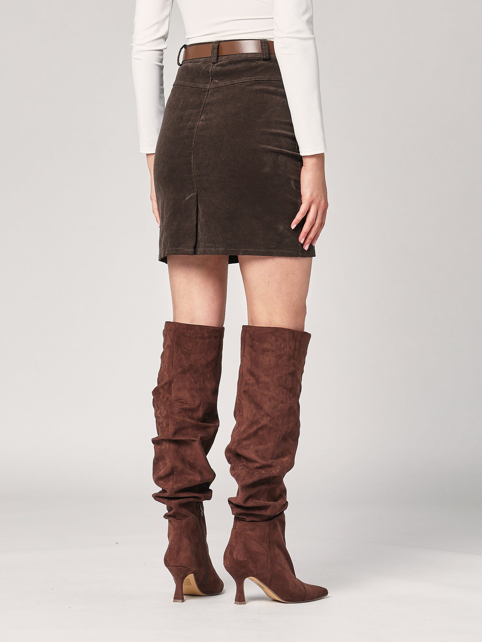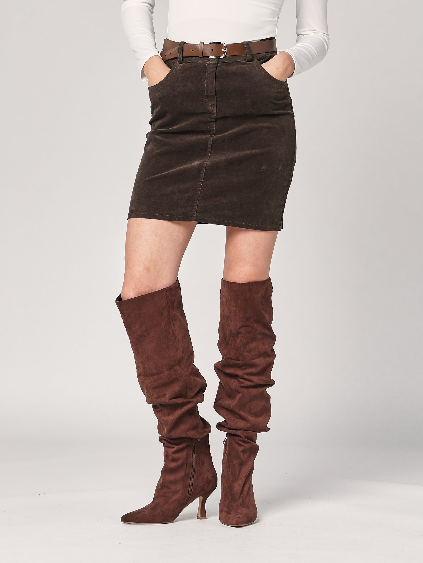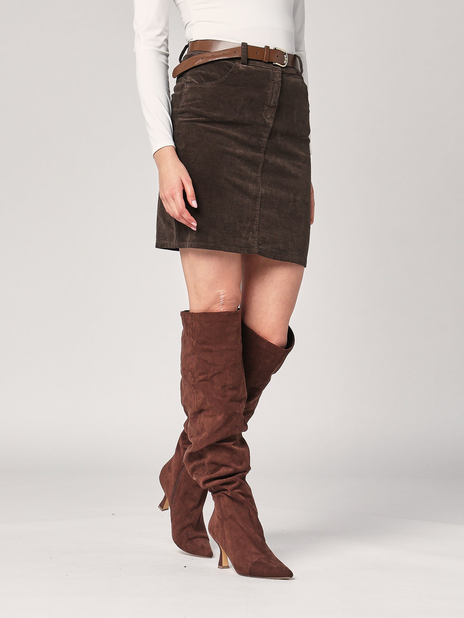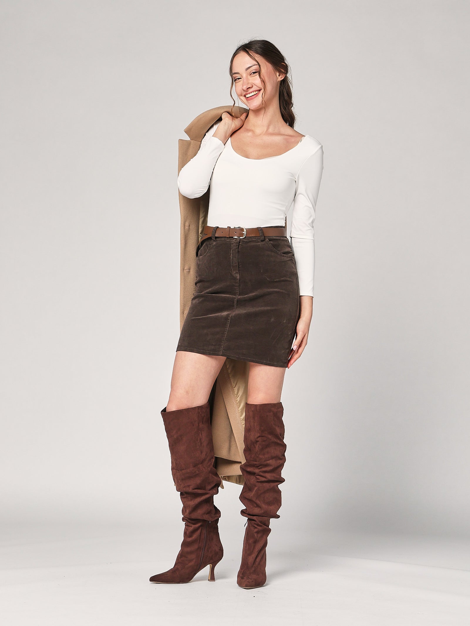 Gonna tubino in tessuto strutturato, simbolo di eleganza minimal e femminilità. Il taglio dritto e la vita alta creano una silhouette armoniosa, facile da interpretare con stili diversi.