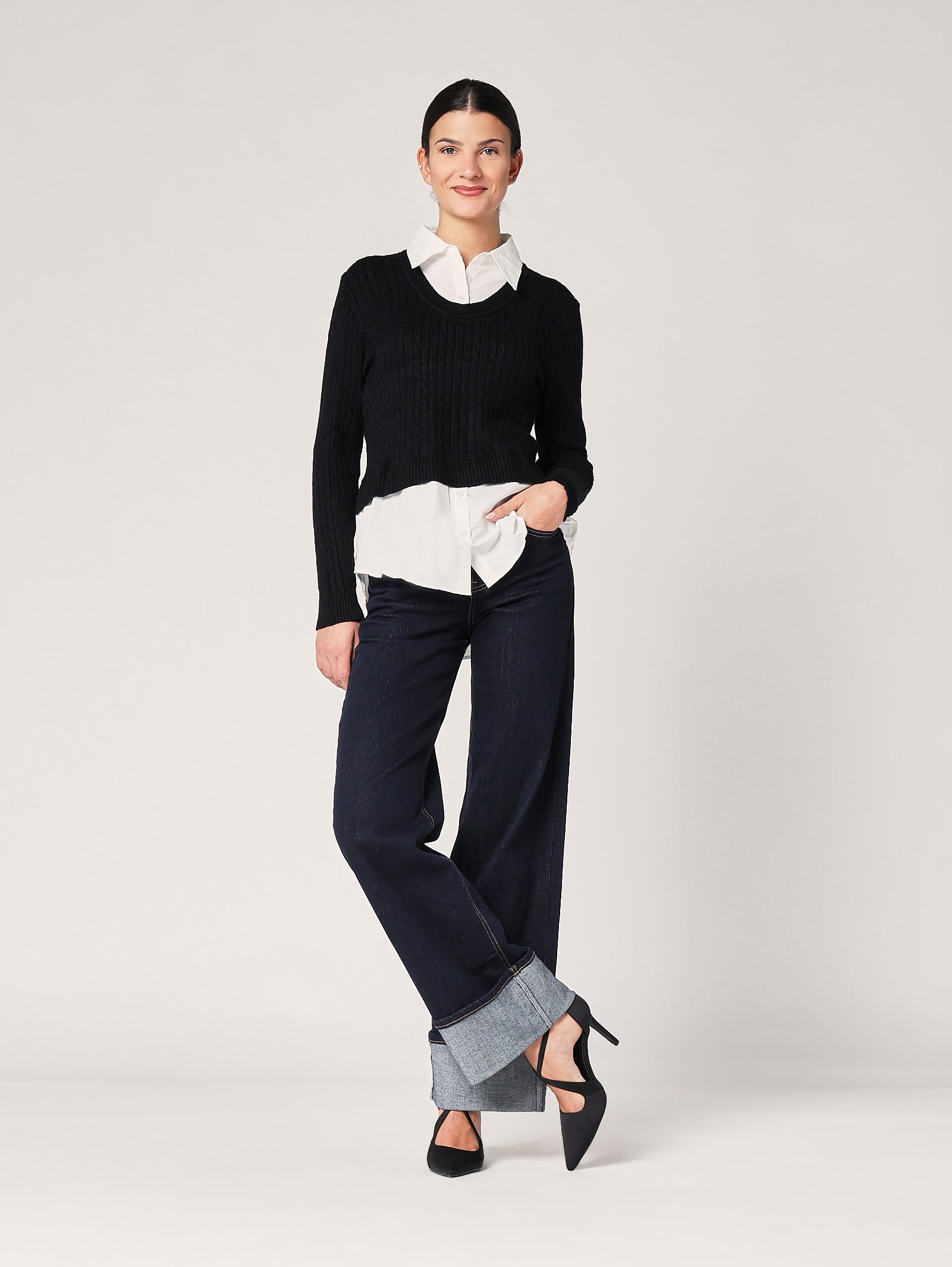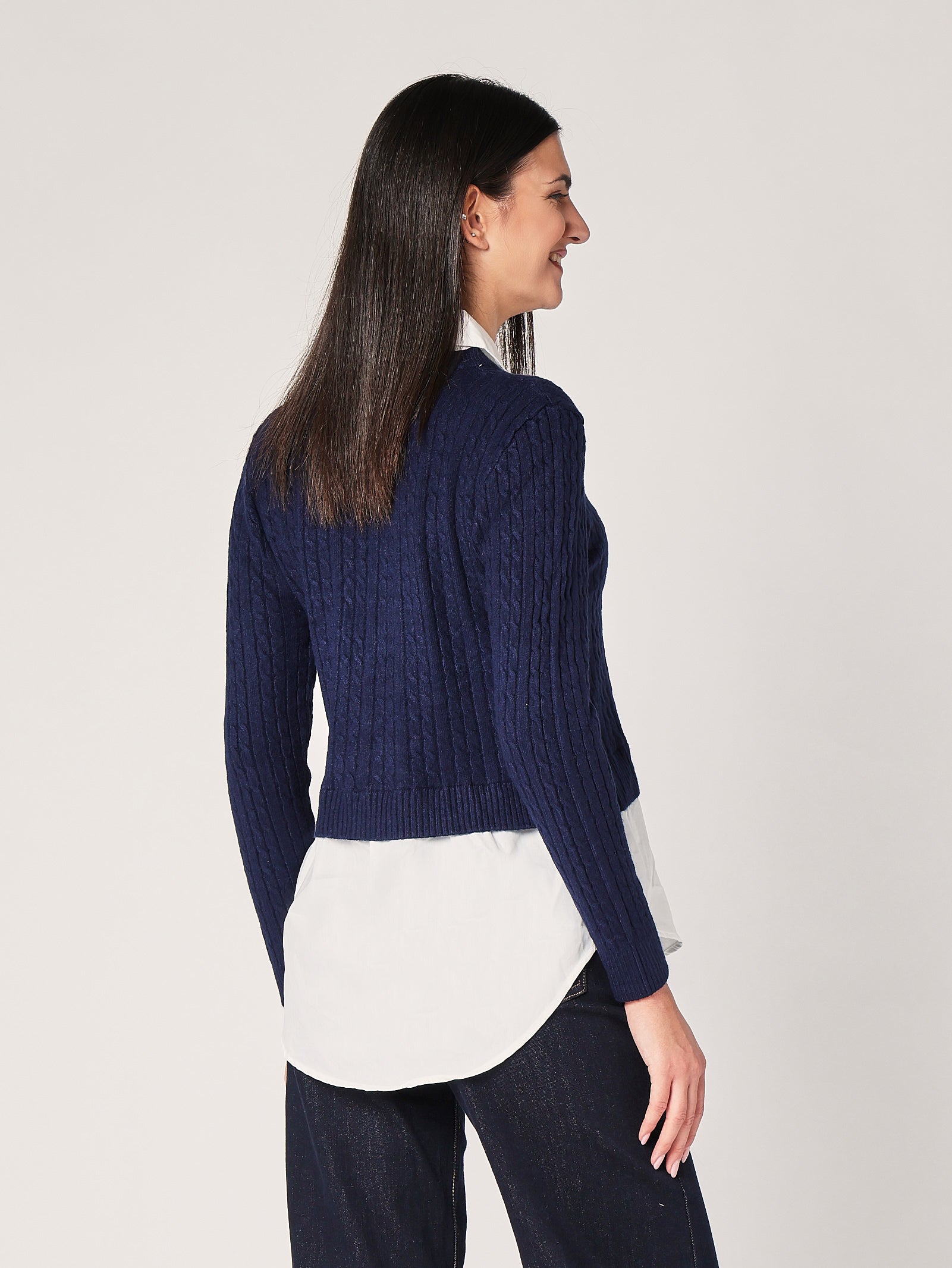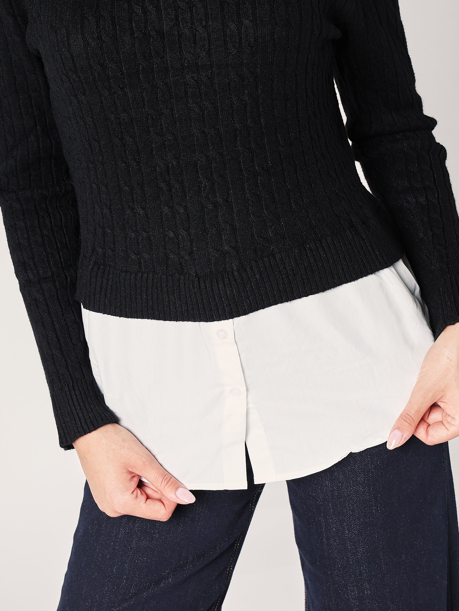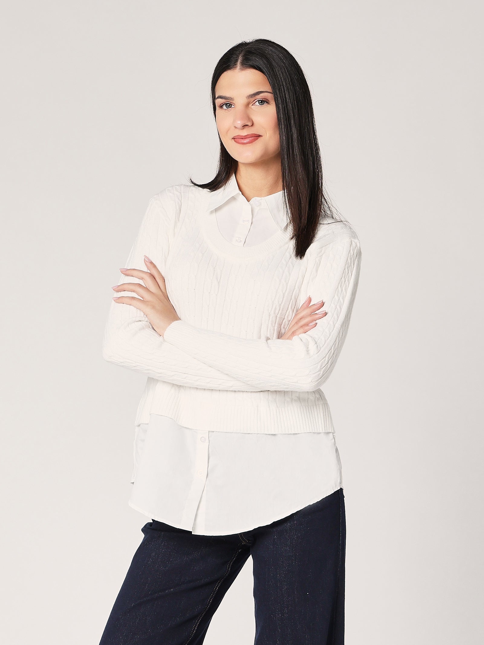 Maglia a trecce con camicia integrata, un capo sofisticato e pratico che regala subito un effetto “layered” curato e contemporaneo. La lavorazione a trecce aggiunge texture e movimento, mentre il colletto e l’orlo della camicia donano un tocco elegante e preppy. Perfetta per look raffinati ma facili da indossare.