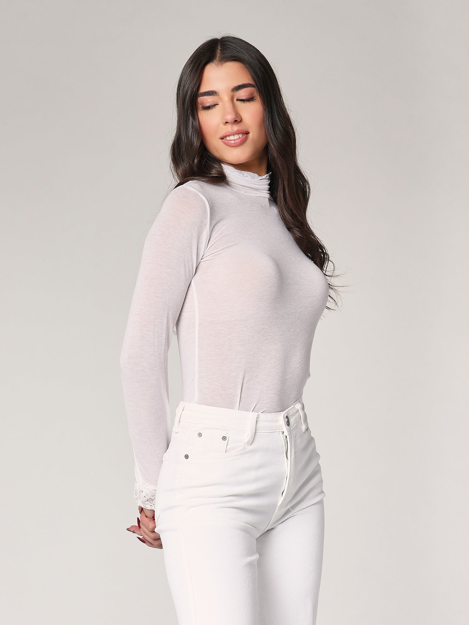 Dolcevita in cashmere con dettaglio in pizzo, un capo raffinato che unisce comfort e femminilità. La maglia avvolge con morbidezza, mentre il pizzo dona un tocco elegante perfetto per impreziosire qualsiasi look.