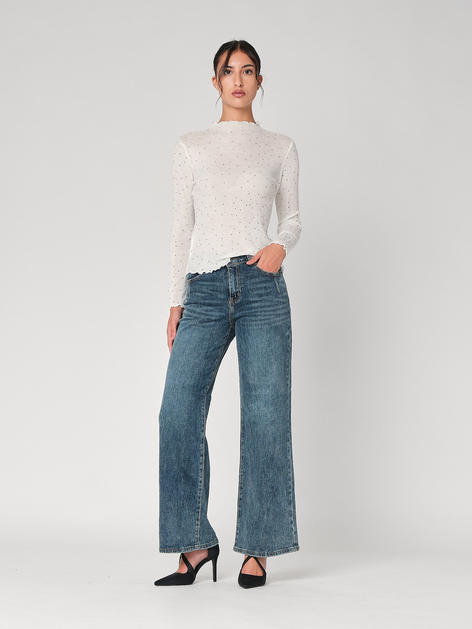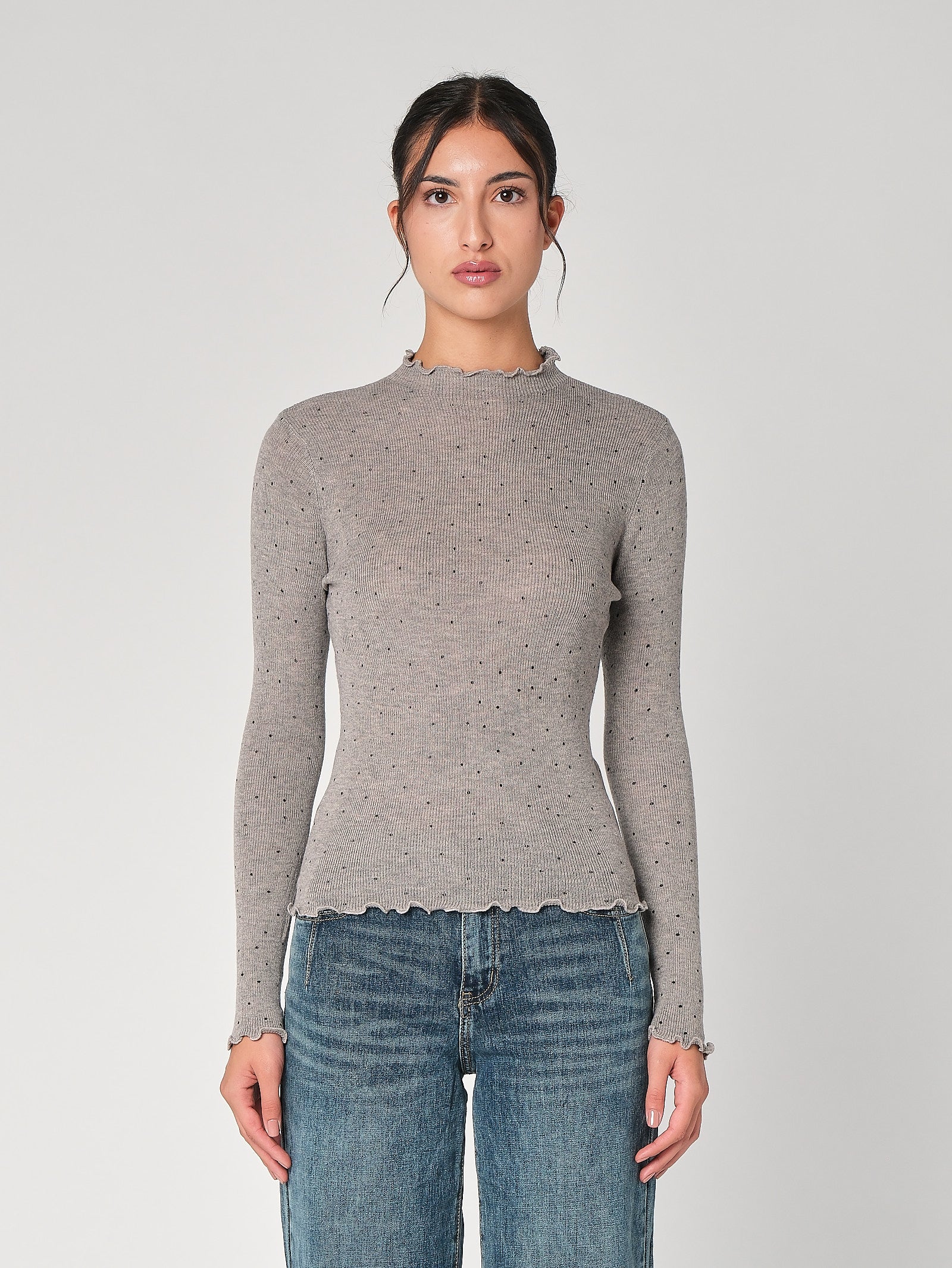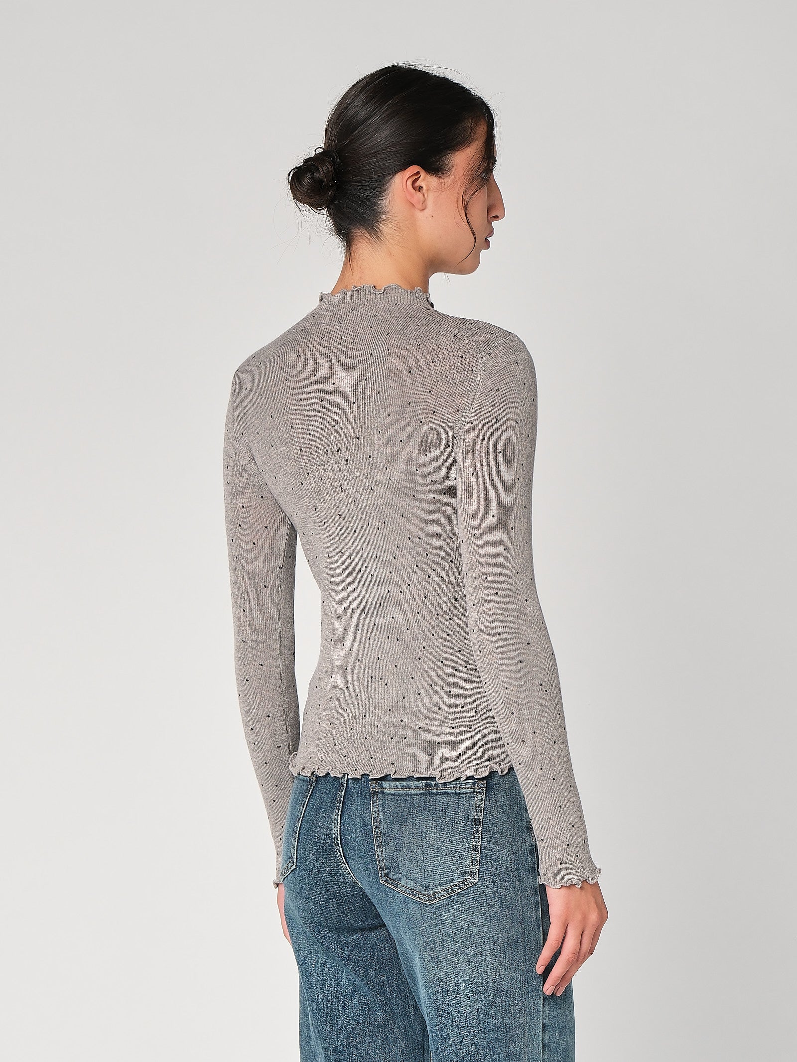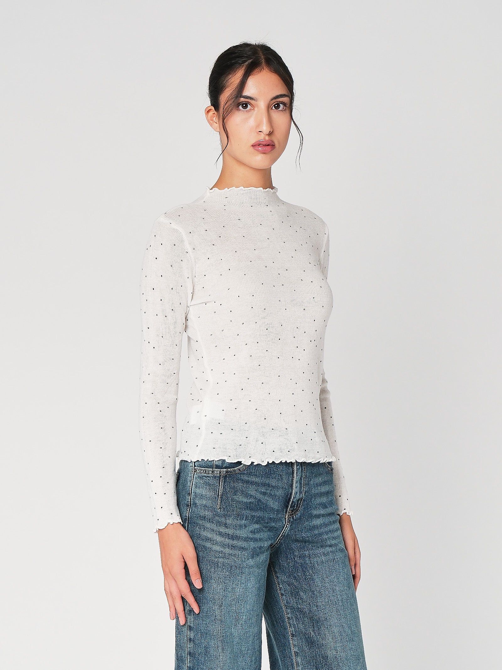 Il lupetto con pois è la maglia dolcevita donna che unisce vibe playful e linea pulita, collo morbido che avvolge senza stringere, stampa a pois protagonista che accende l’outfit. Questa maglia a collo alto cade fluida, non segna e funziona dal lavoro al tempo libero con un tocco chic immediato.