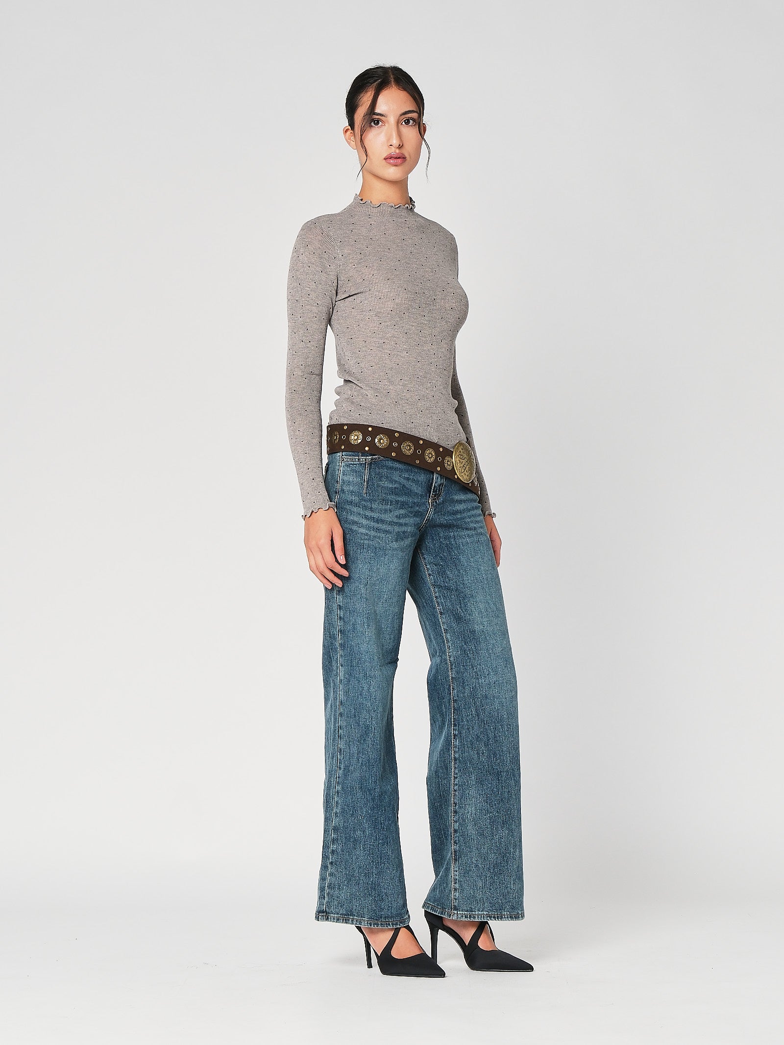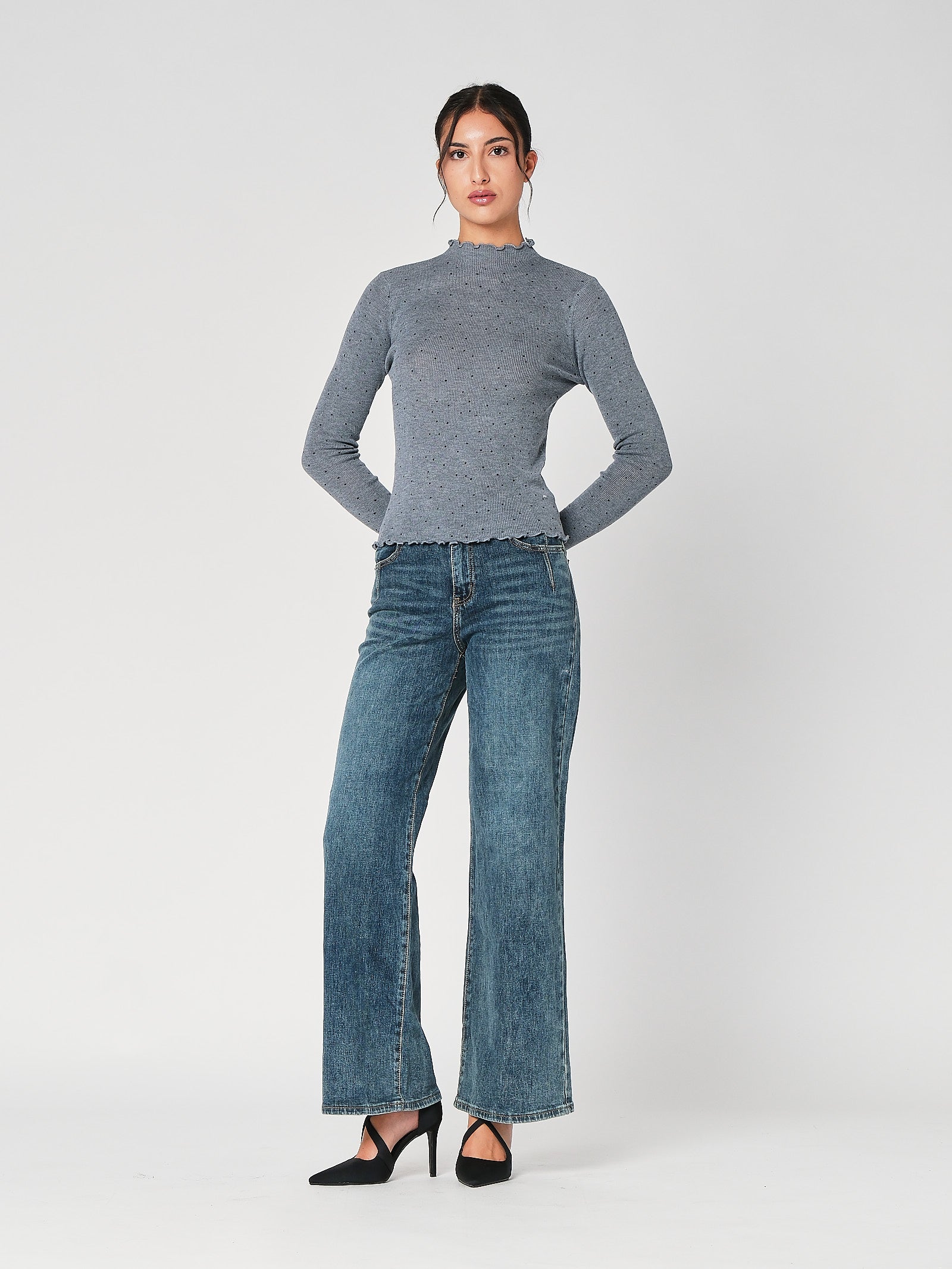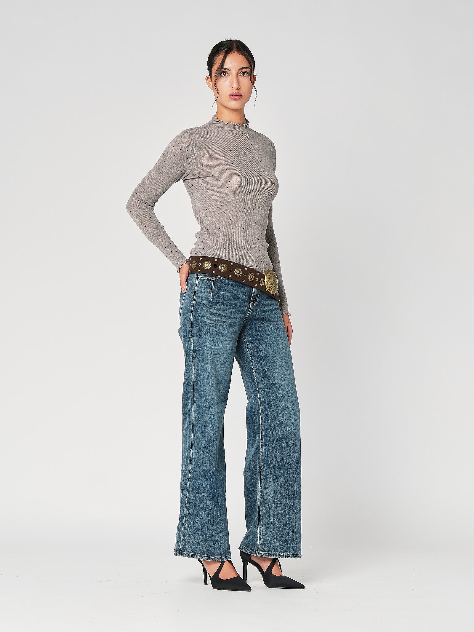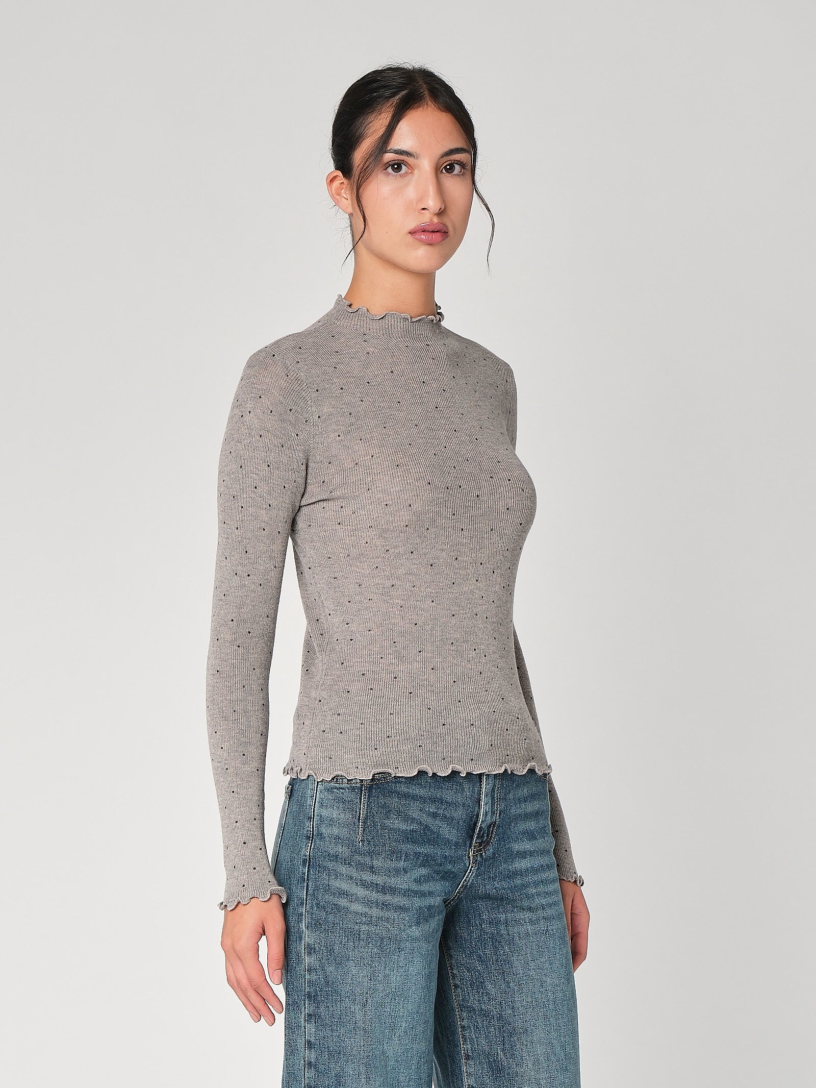 Il lupetto con pois è la maglia dolcevita donna che unisce vibe playful e linea pulita, collo morbido che avvolge senza stringere, stampa a pois protagonista che accende l’outfit. Questa maglia a collo alto cade fluida, non segna e funziona dal lavoro al tempo libero con un tocco chic immediato.