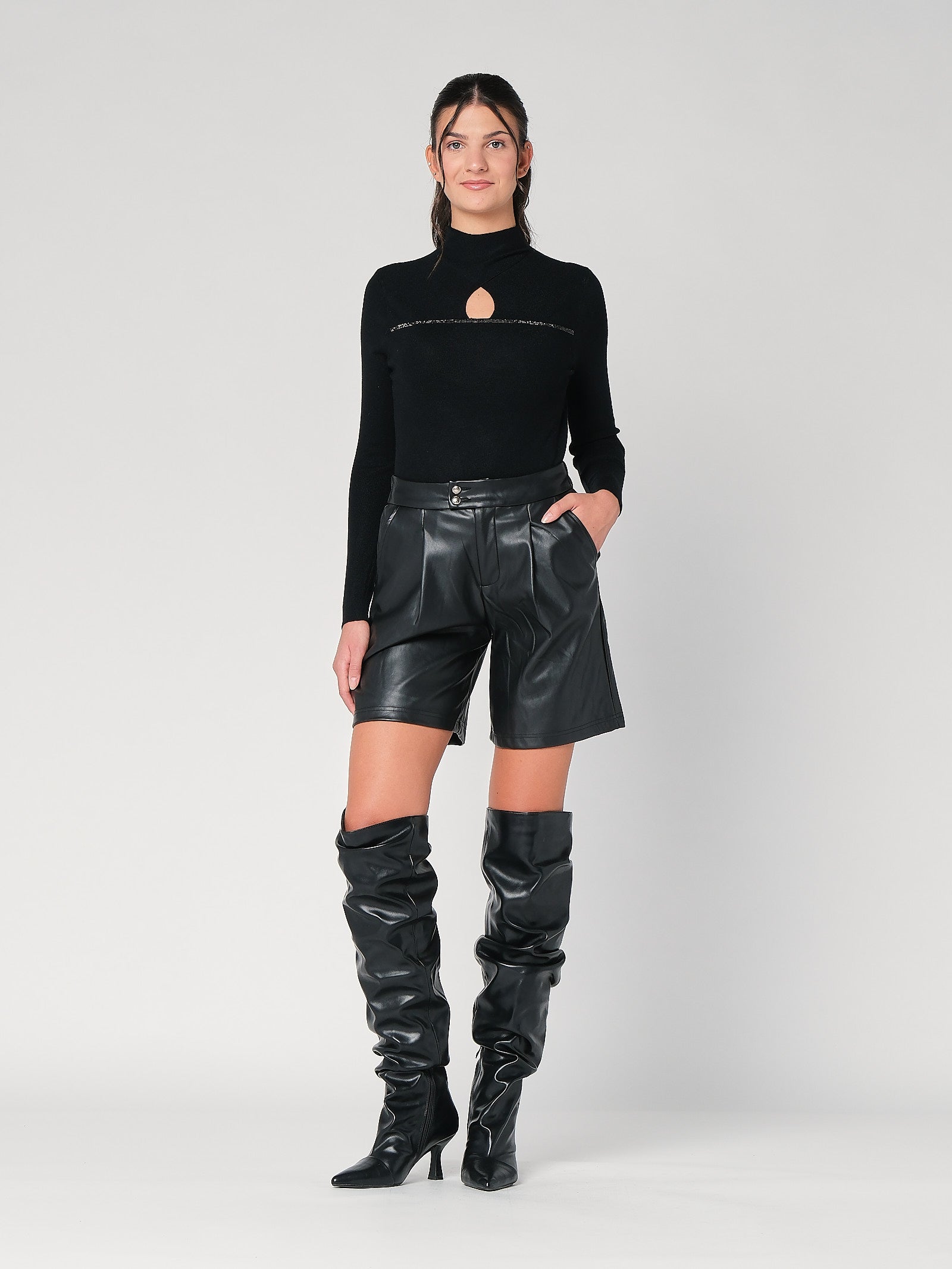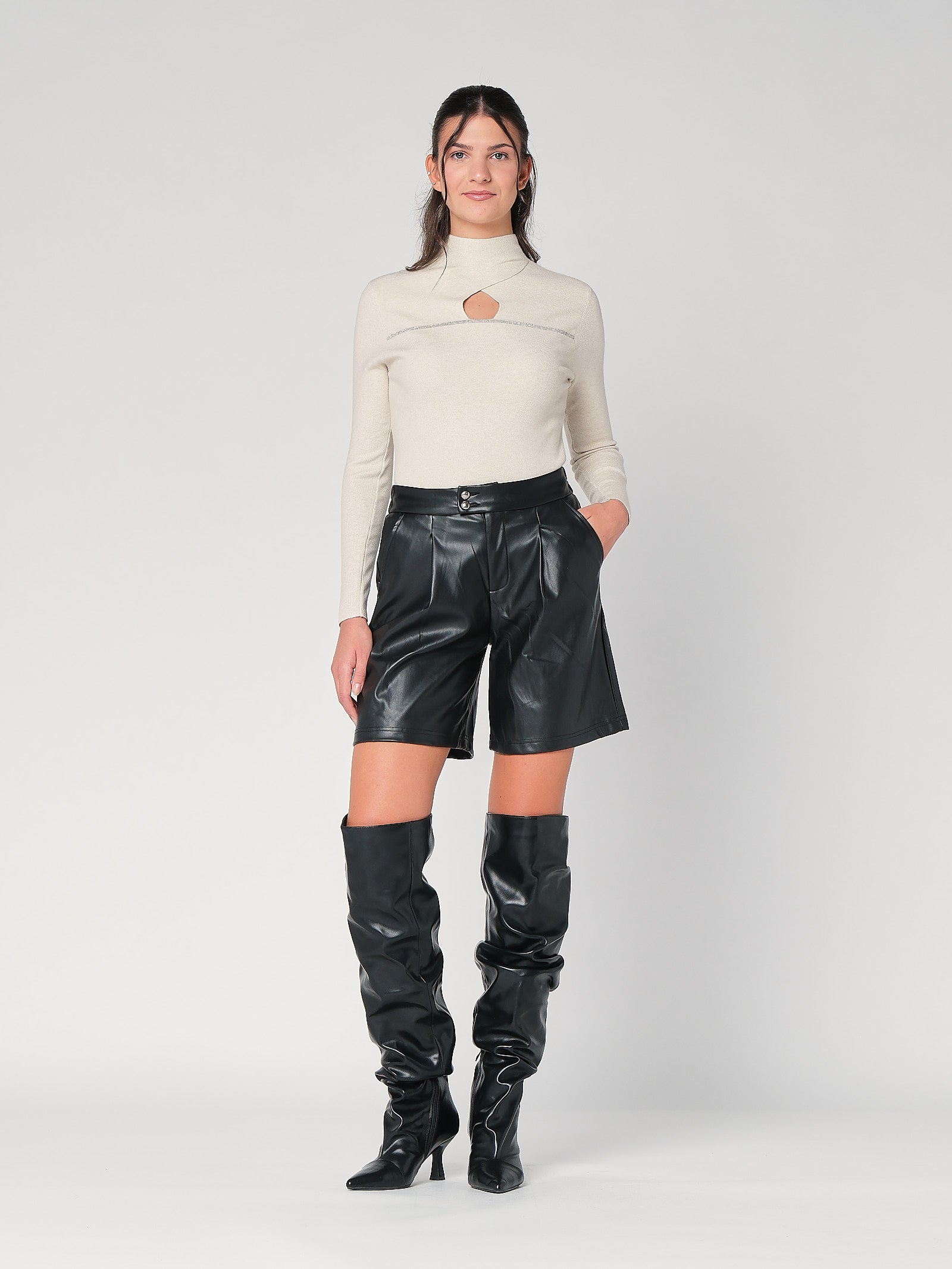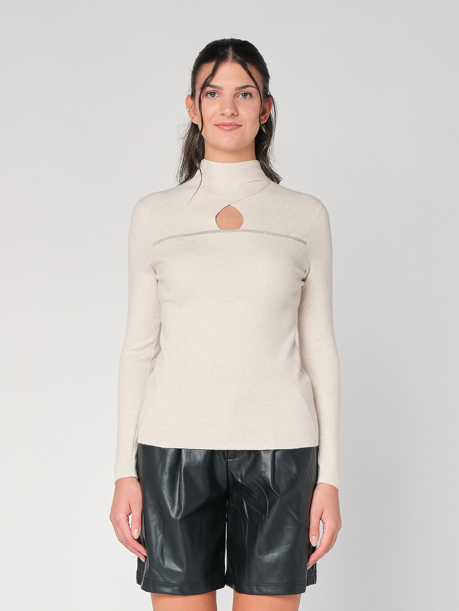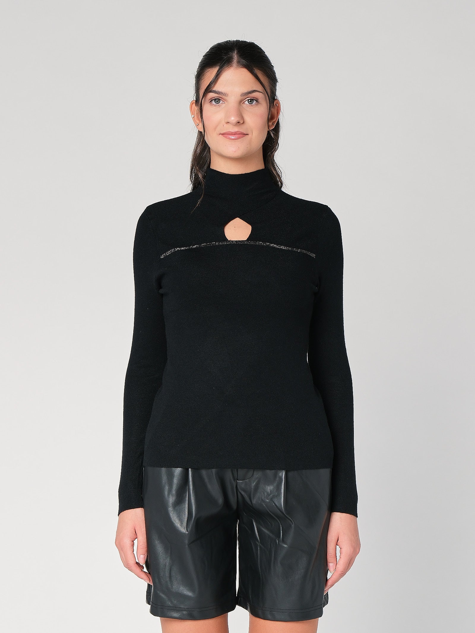 Dettagli: riga di strass frontale, collo tipo dolcevita corto, finiture pulite