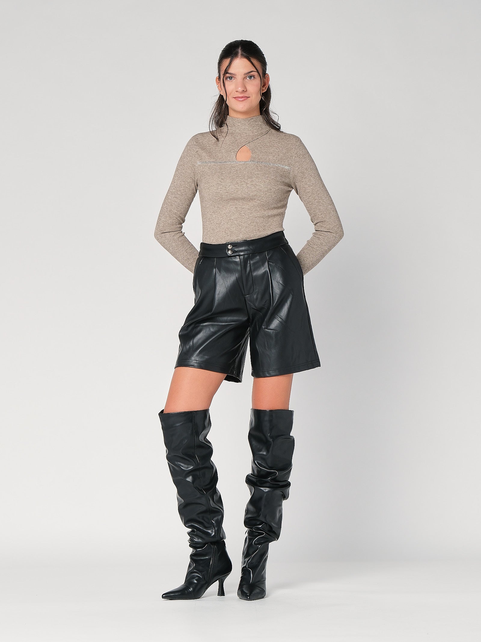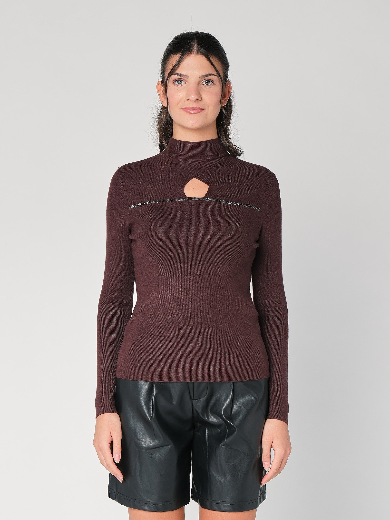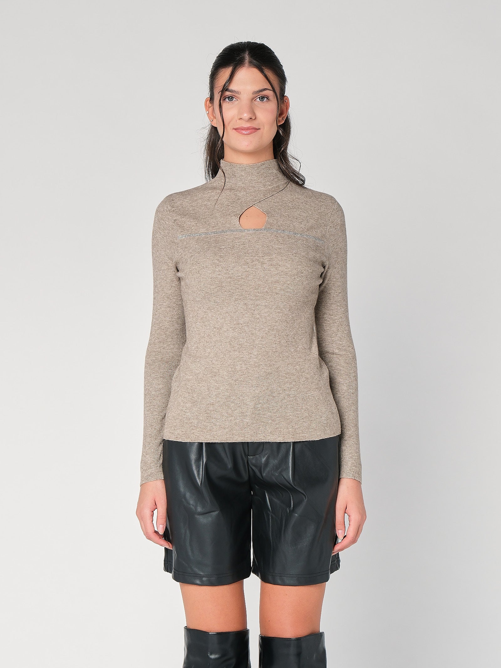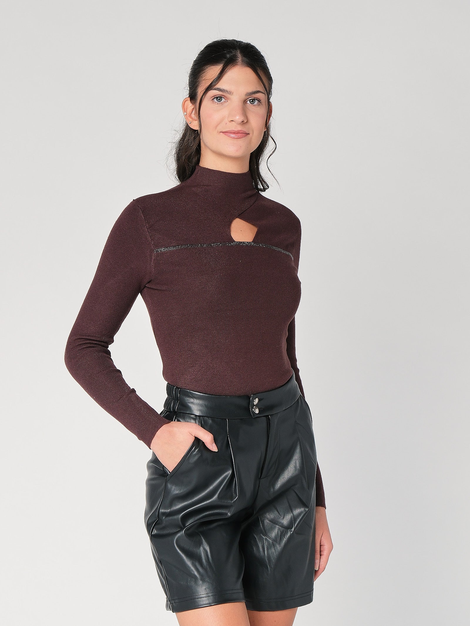 Dettagli: riga di strass frontale, collo tipo dolcevita corto, finiture pulite