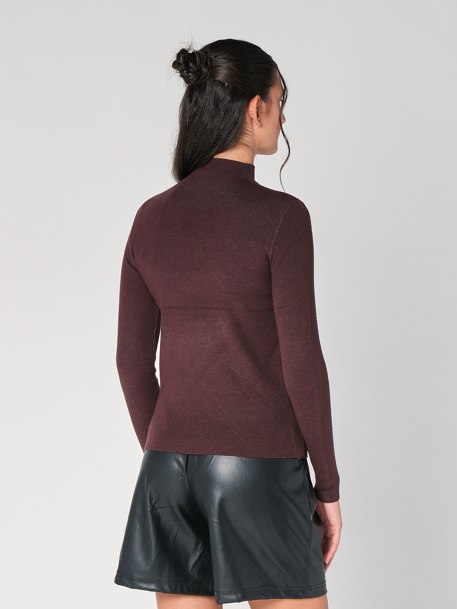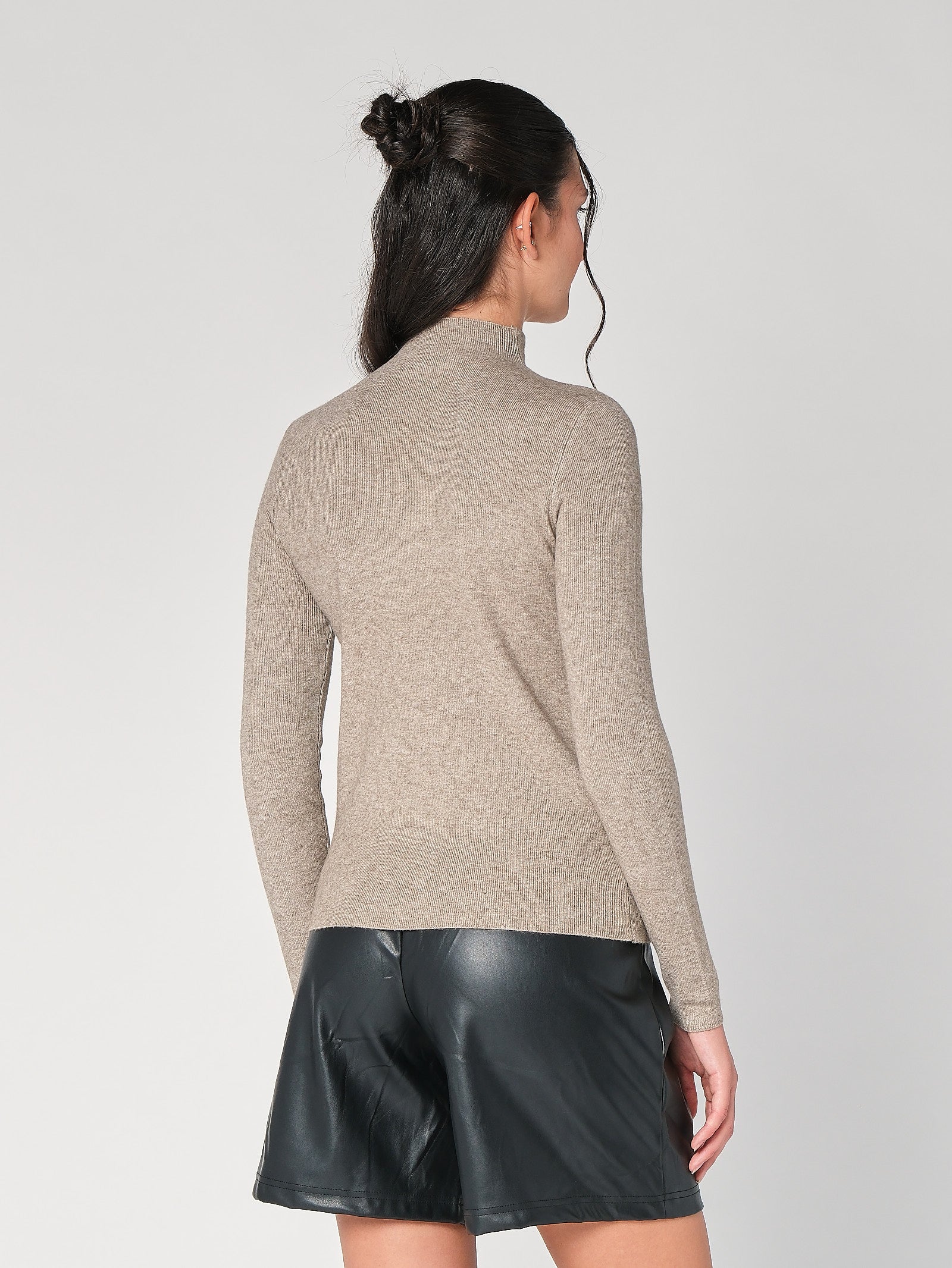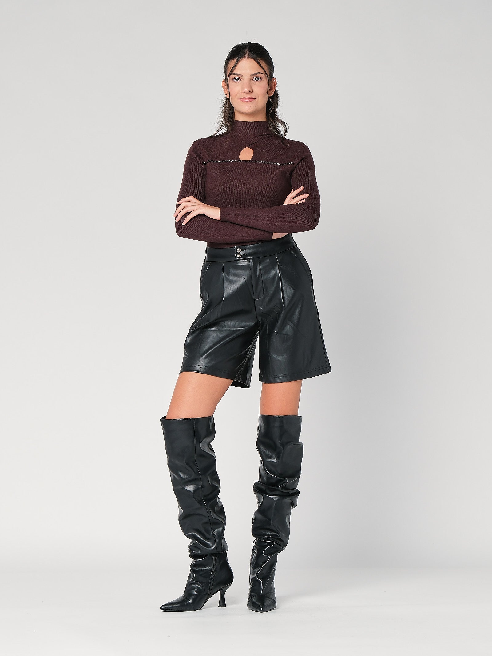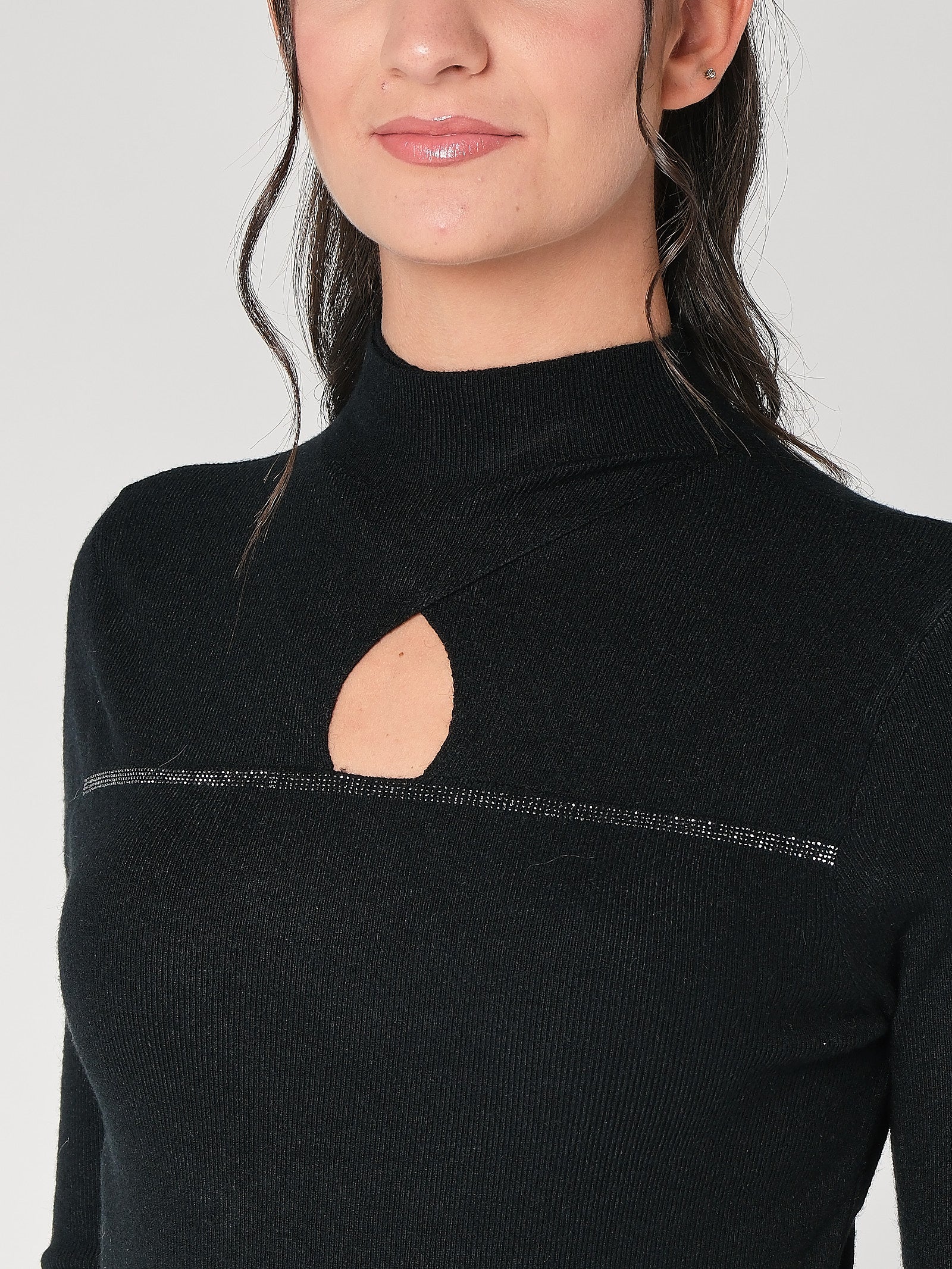 Dettagli: riga di strass frontale, collo tipo dolcevita corto, finiture pulite