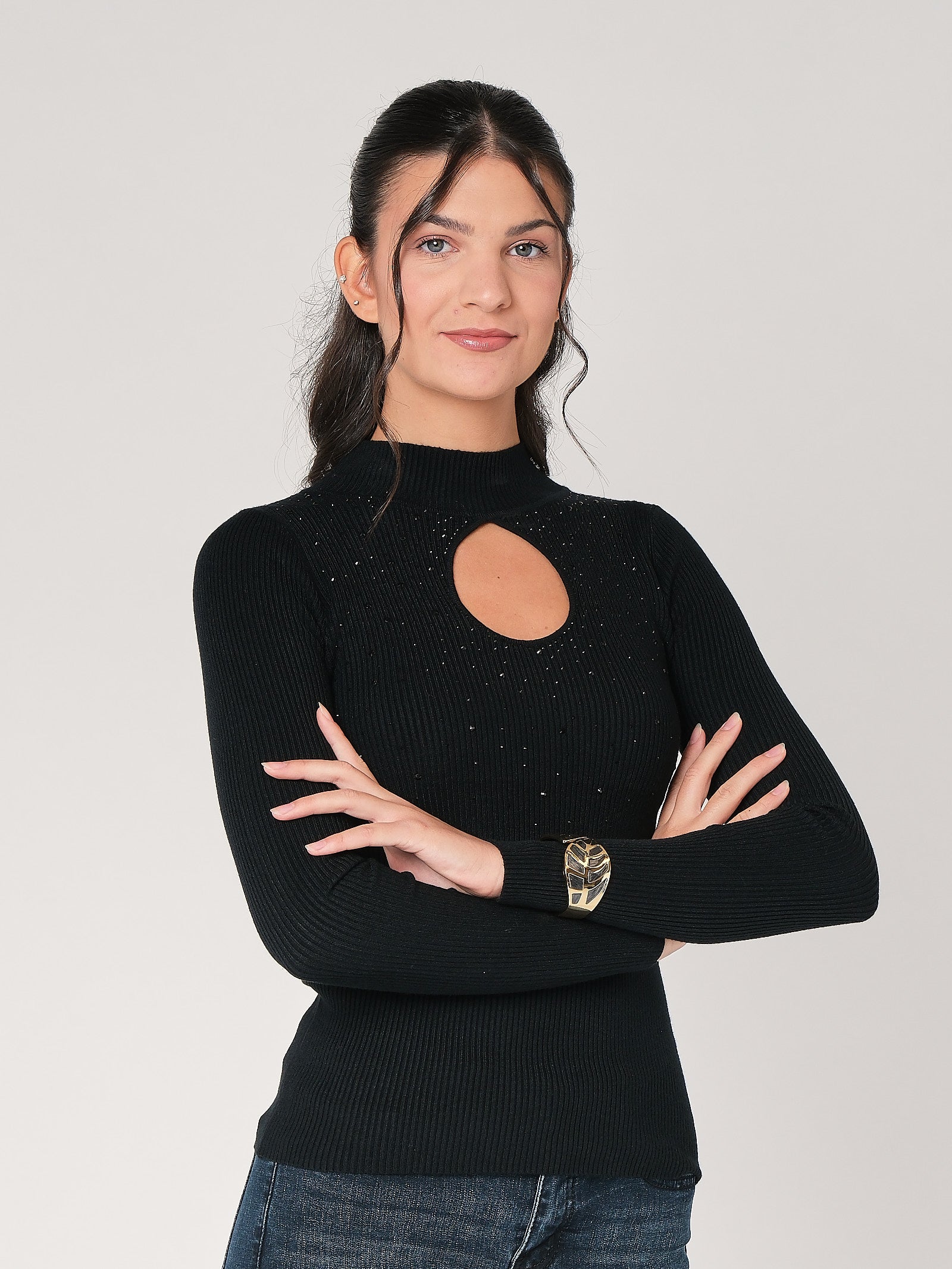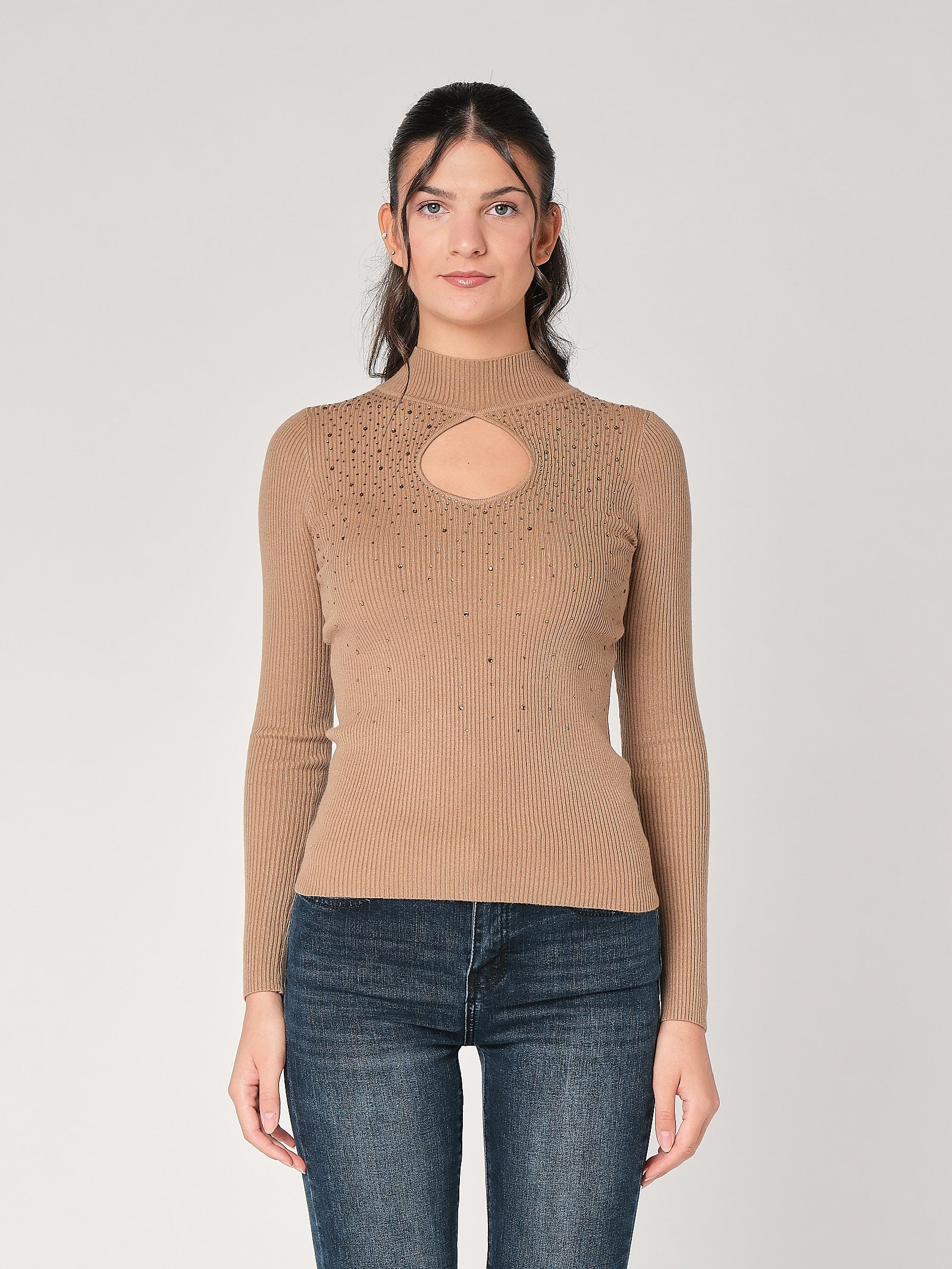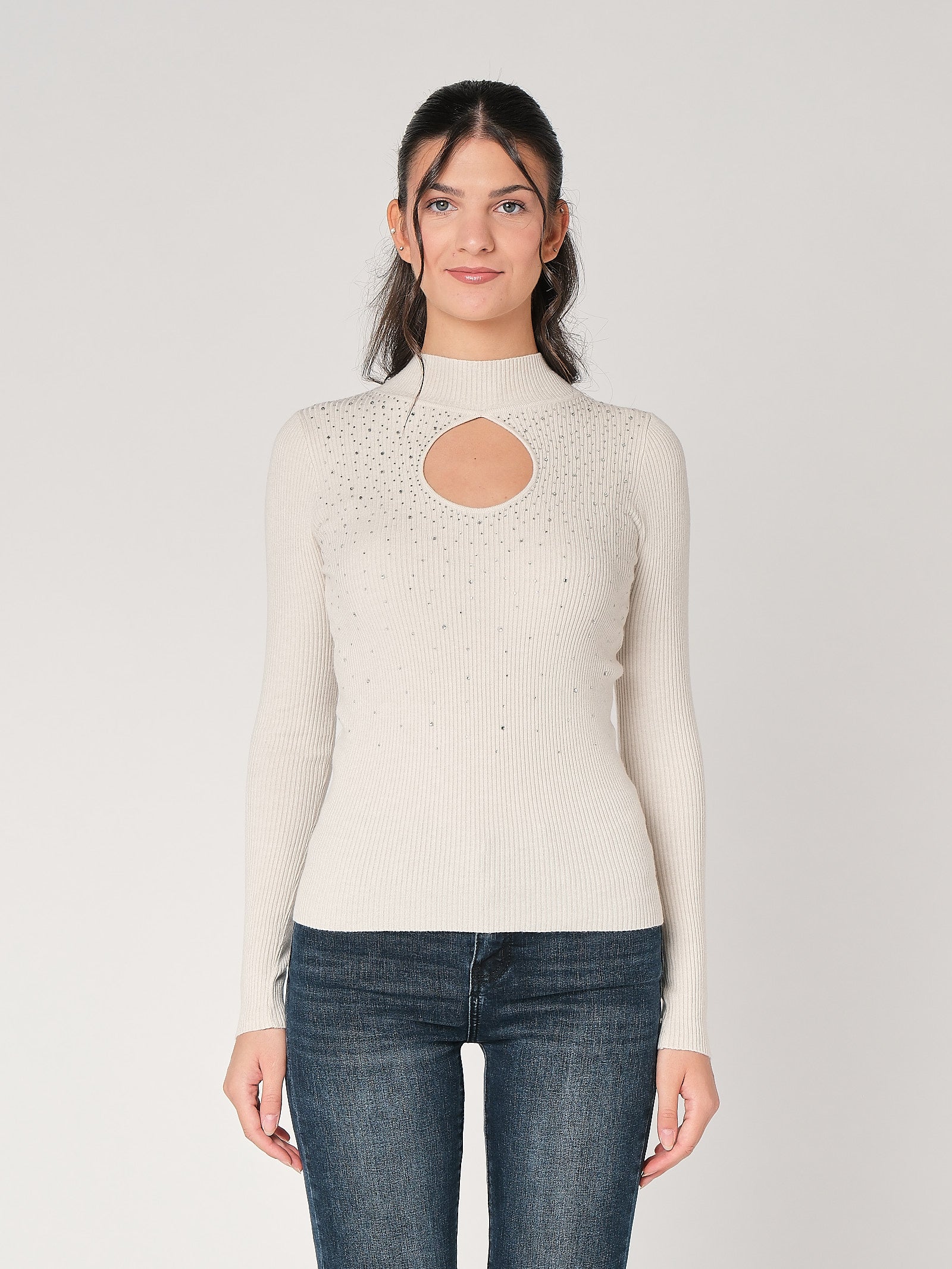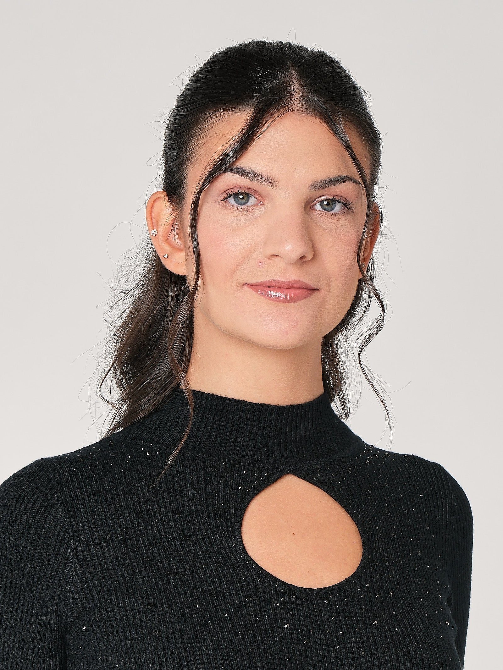 Dettagli: applicazione di strass frontali, collo tipo dolcevita corto, finiture pulite