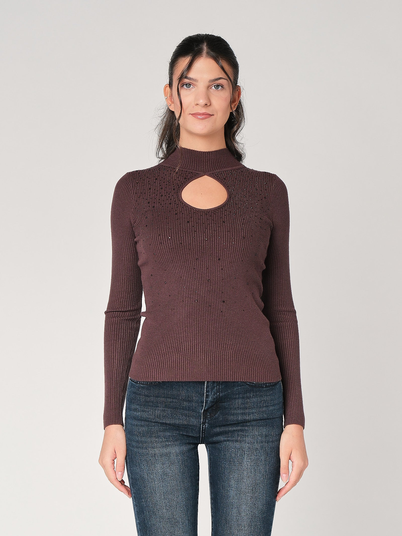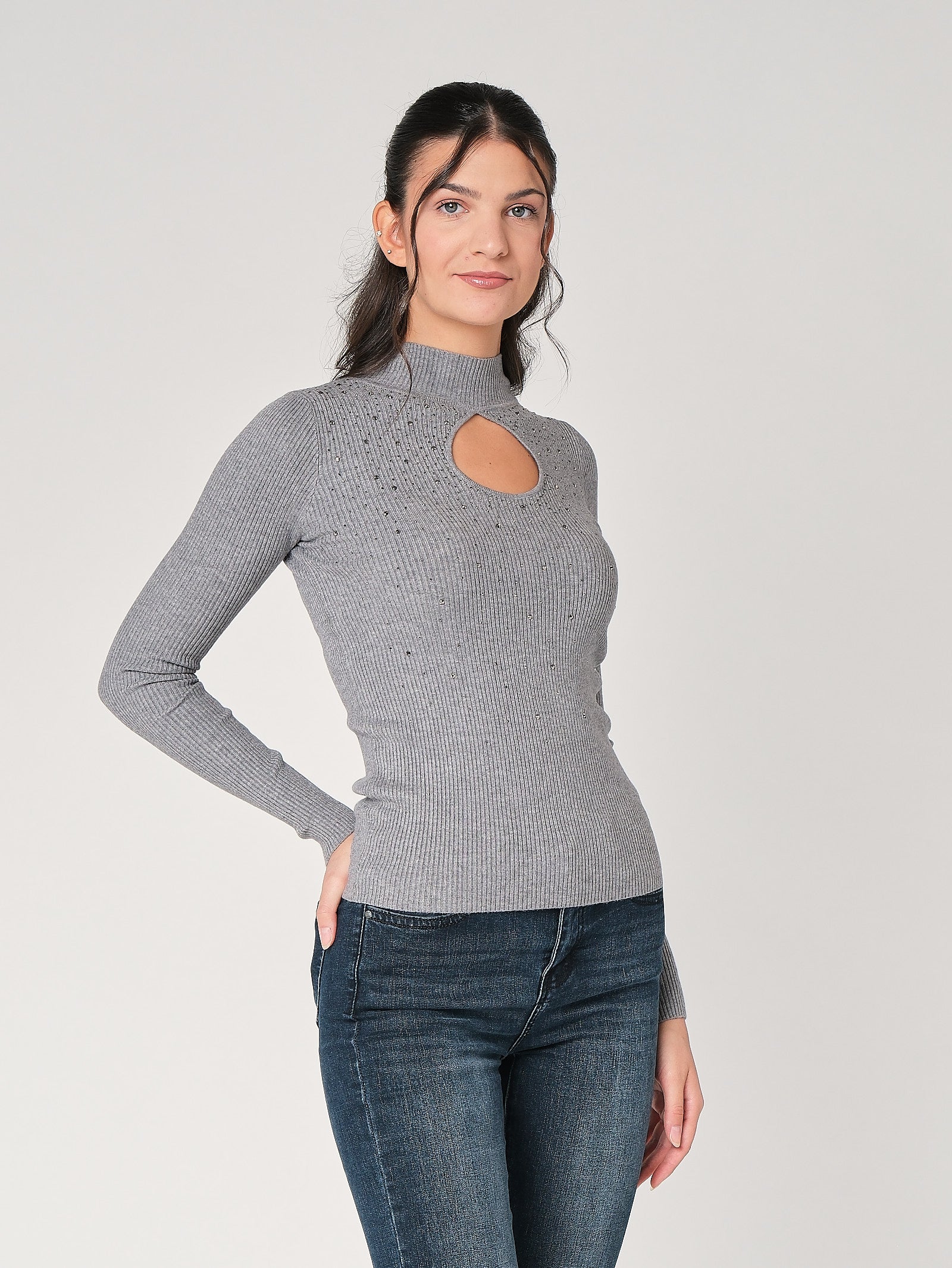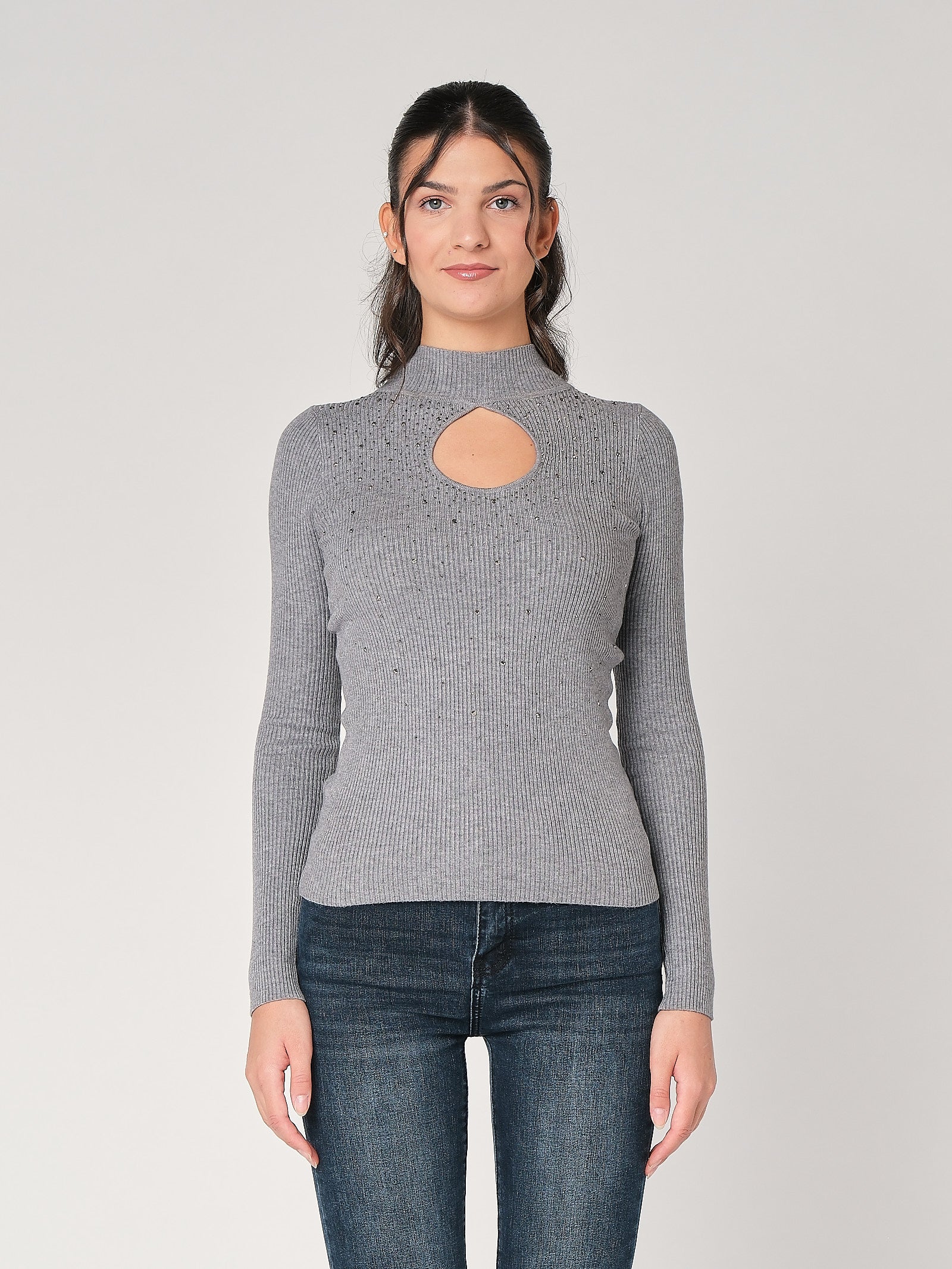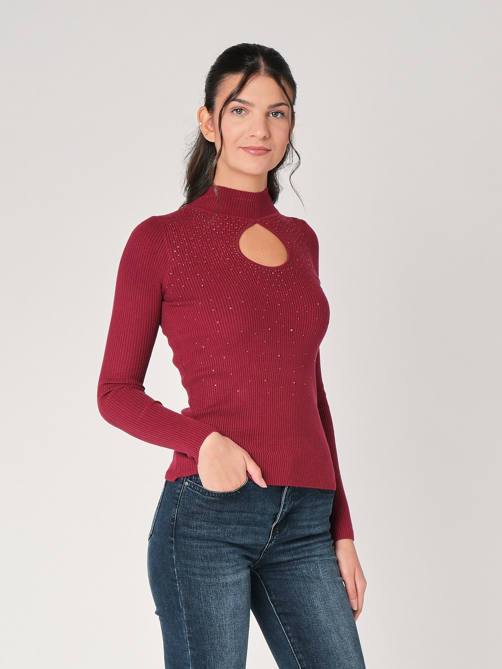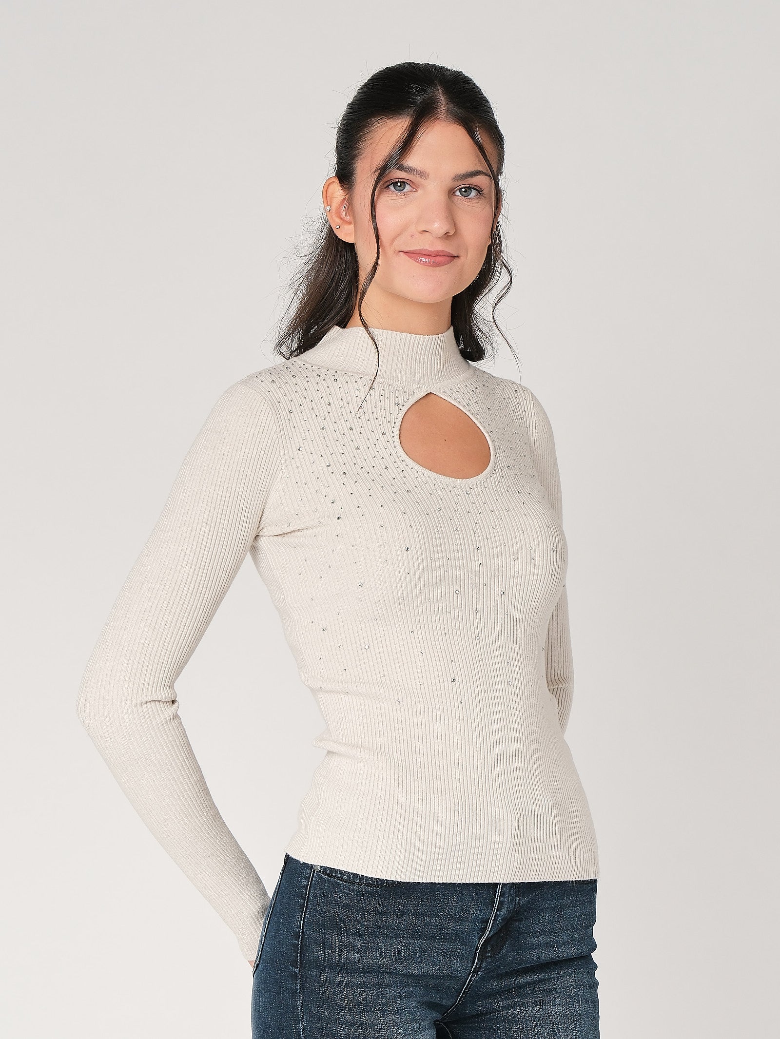 Dettagli: applicazione di strass frontali, collo tipo dolcevita corto, finiture pulite