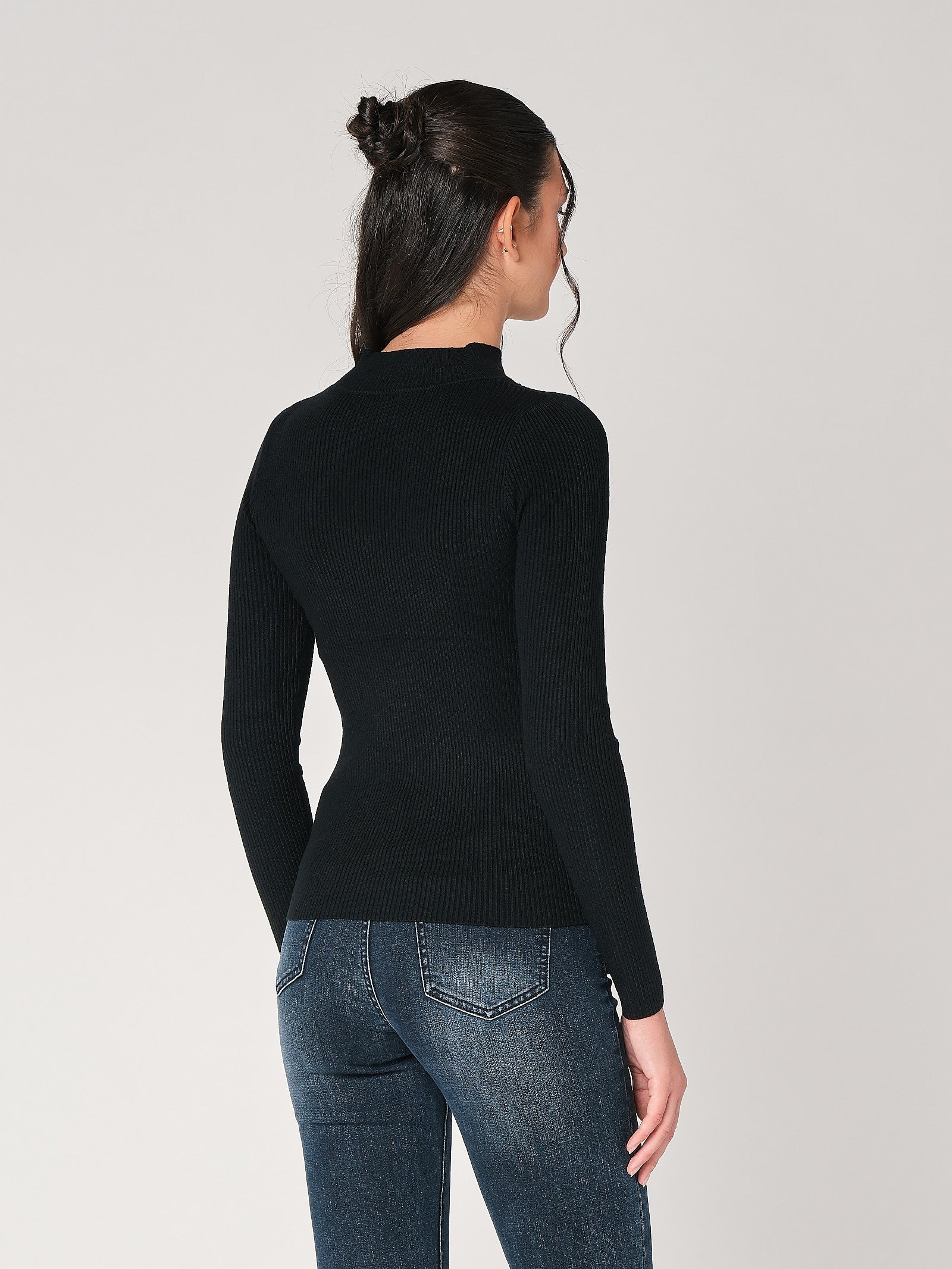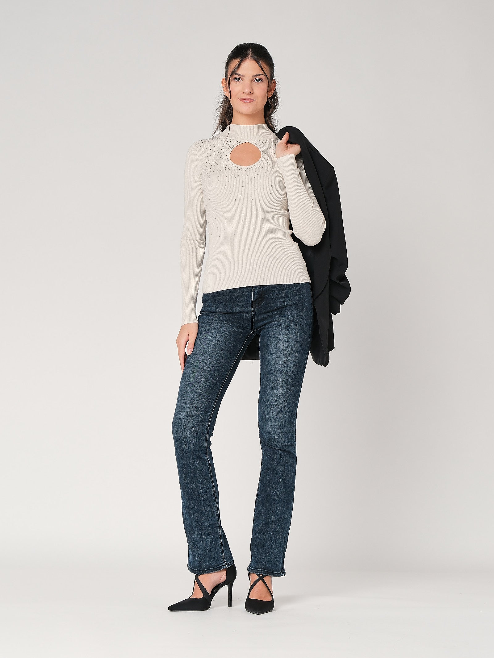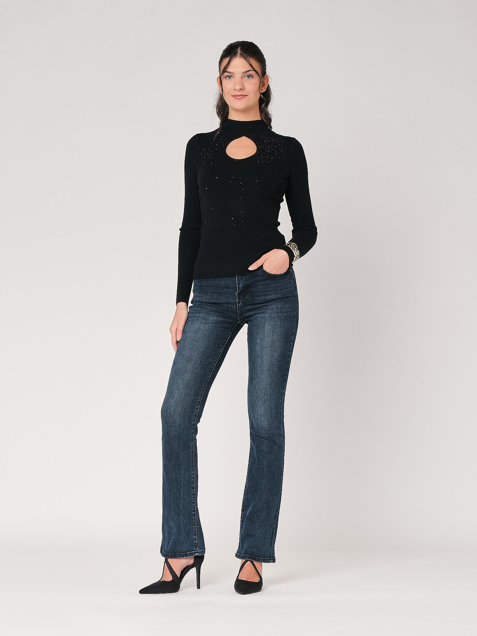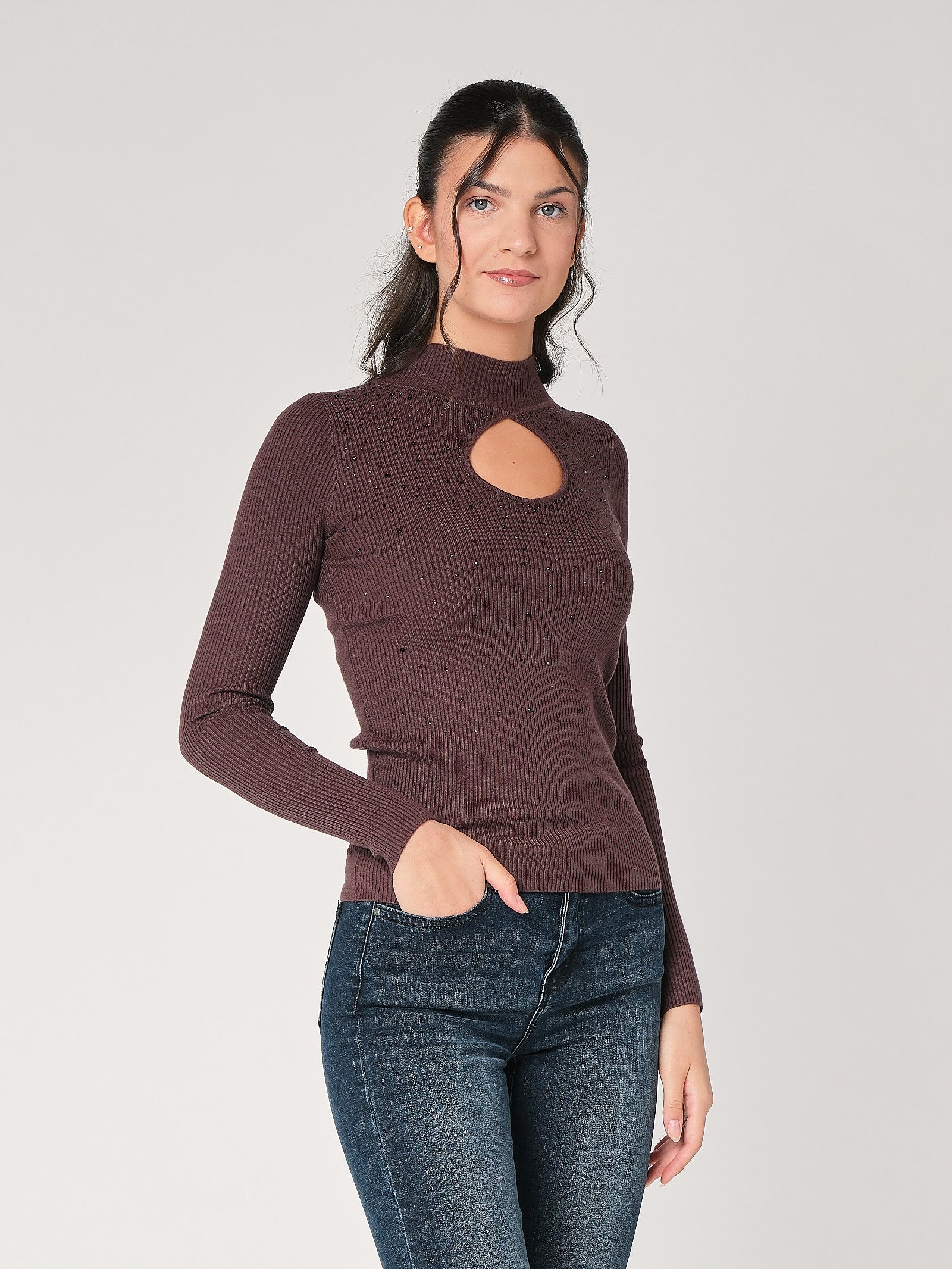 Dettagli: applicazione di strass frontali, collo tipo dolcevita corto, finiture pulite