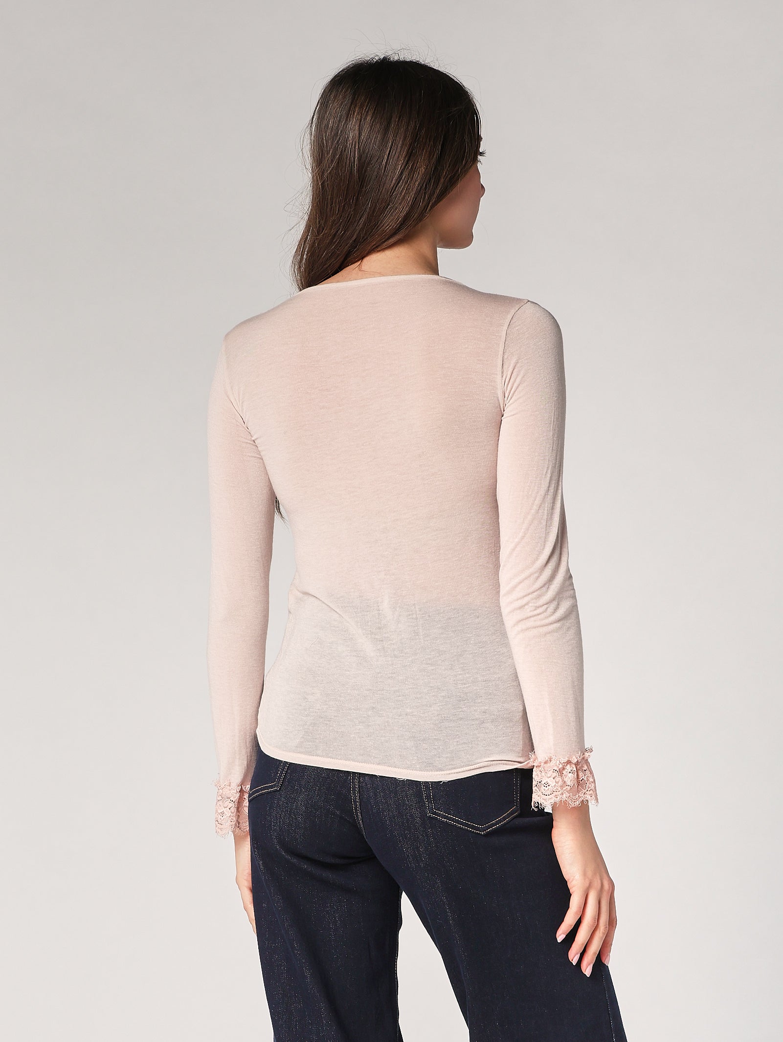 Maglia in cashmere con scollo a V rifinito in pizzo, un capo femminile e raffinato pensato per valorizzare ogni look. La morbidezza del filato e il dettaglio delicato rendono questa maglia perfetta per outfit eleganti o quotidiani.
