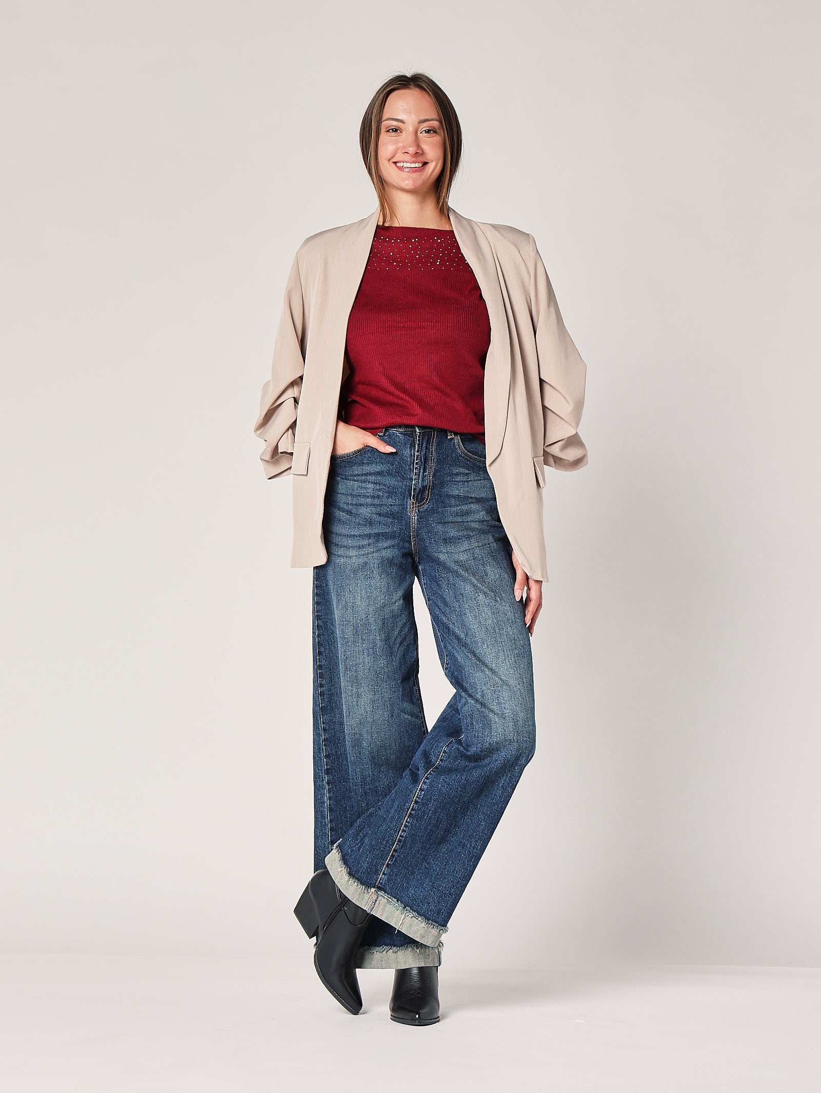 Dettaglio sartoriale: strass applicati sul davanti, finiture pulite