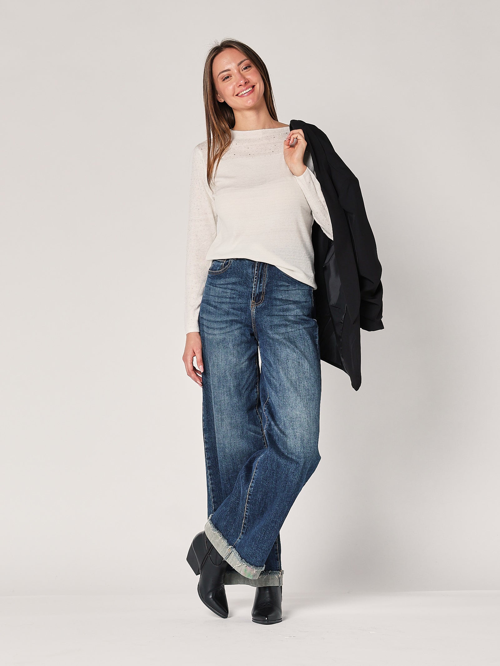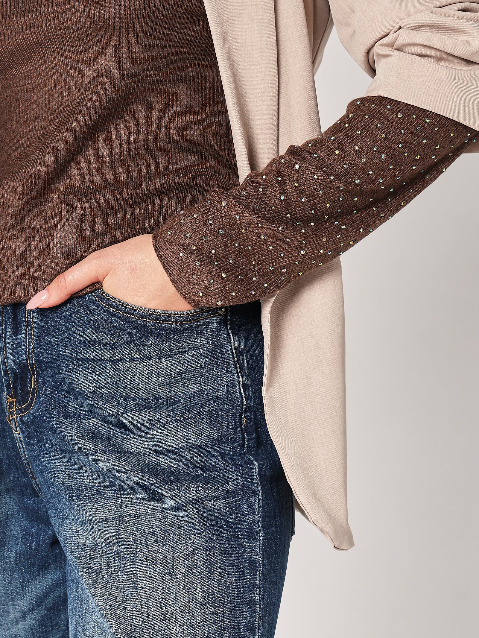 Maglia con dettaglio di strass applicati, pensata per illuminare il look con un tocco di femminilità e carattere. Il taglio regolare e il tessuto morbido la rendono comoda da indossare tutto il giorno, perfetta per creare outfit casual chic o eleganti a seconda degli abbinamenti. Ideale per chi ama uno stile semplice ma curato nei dettagli.