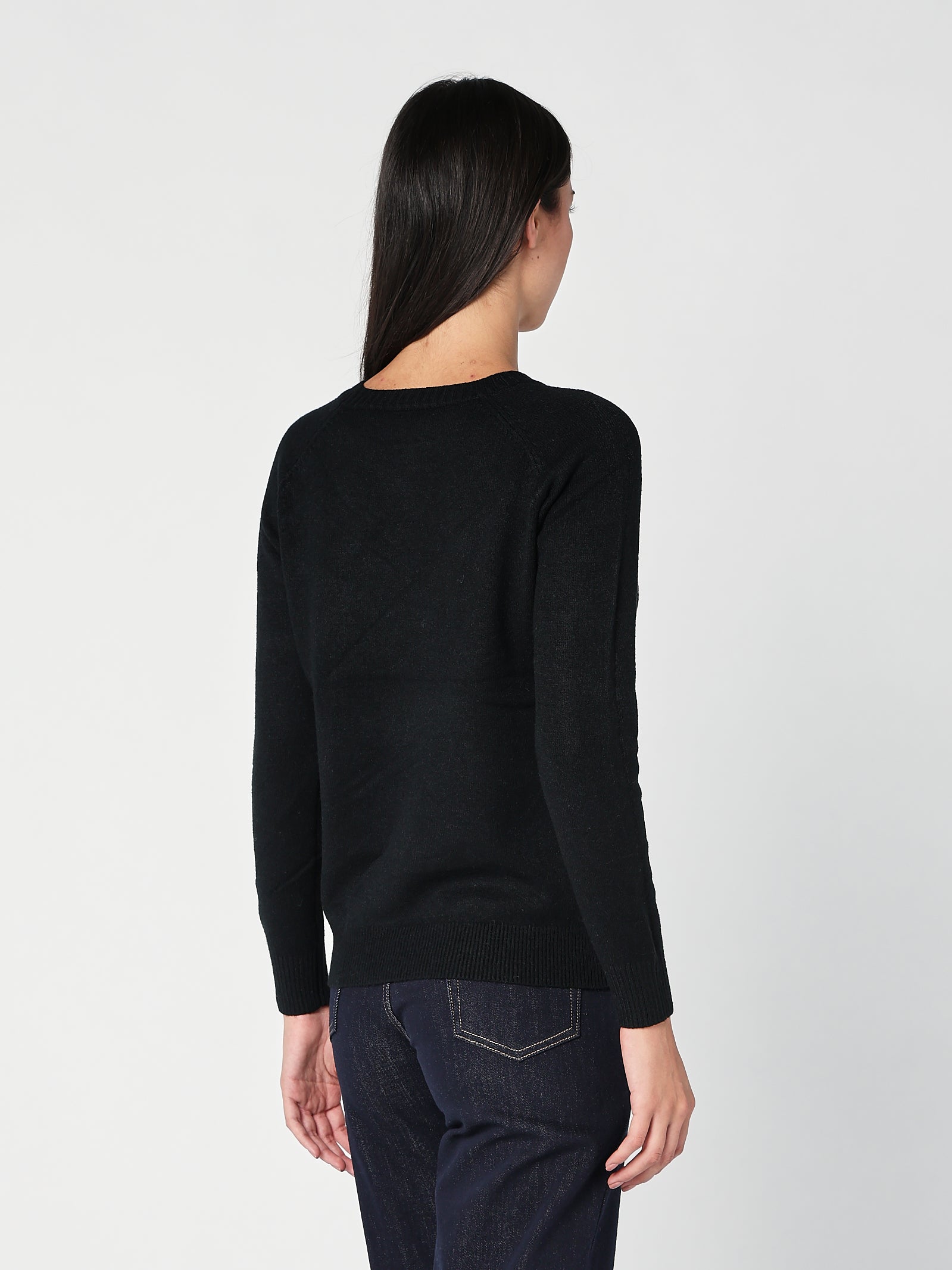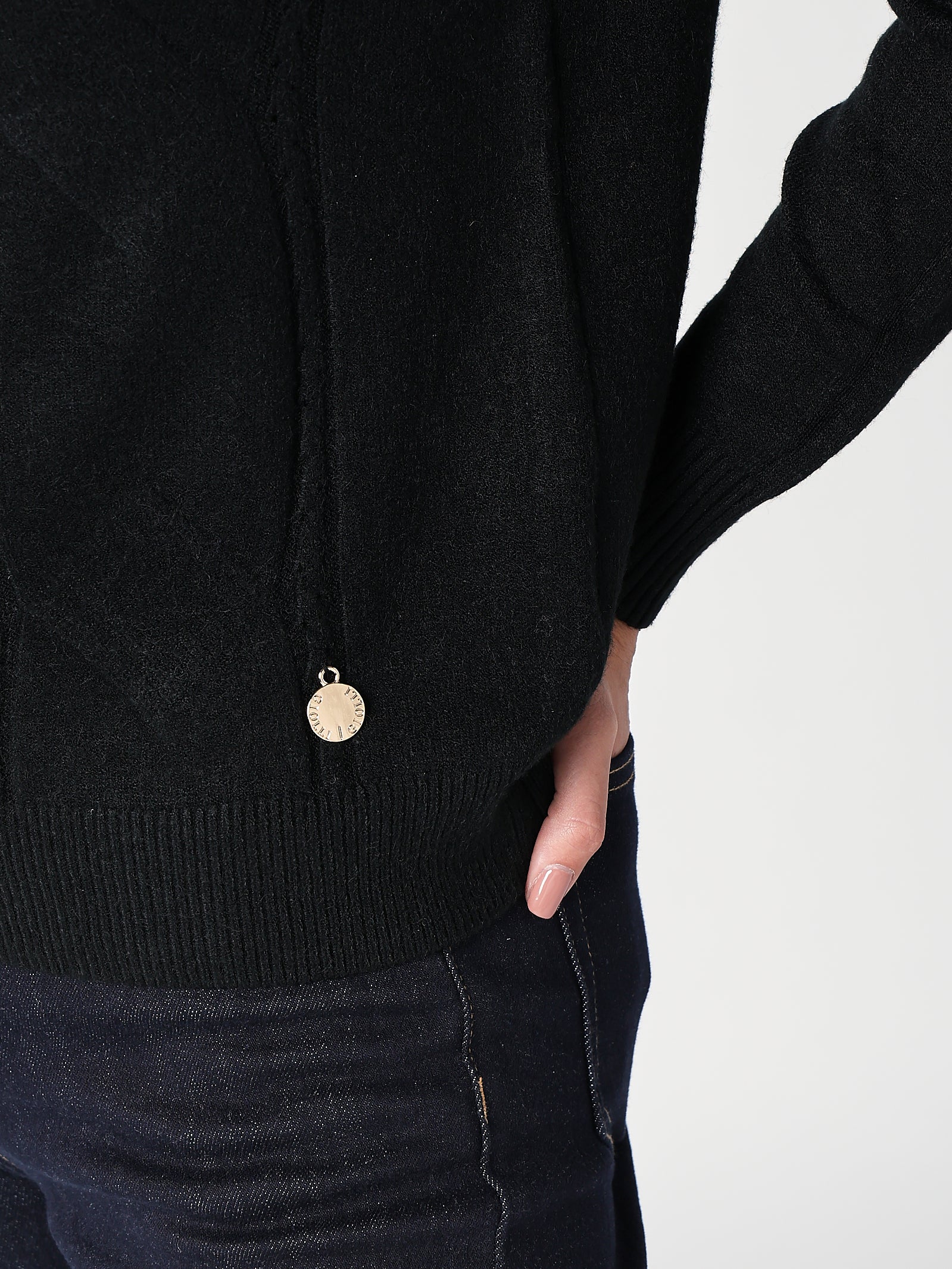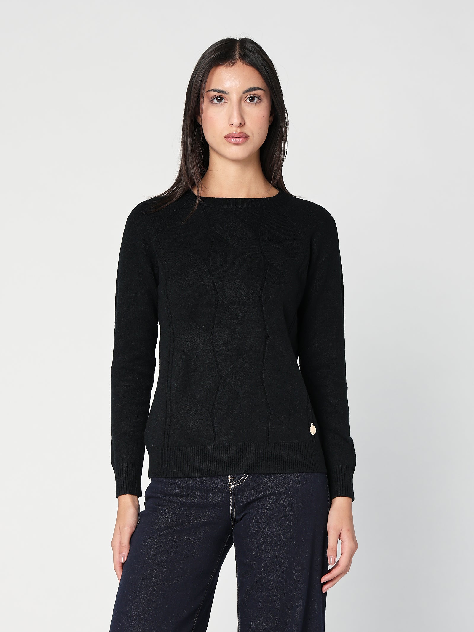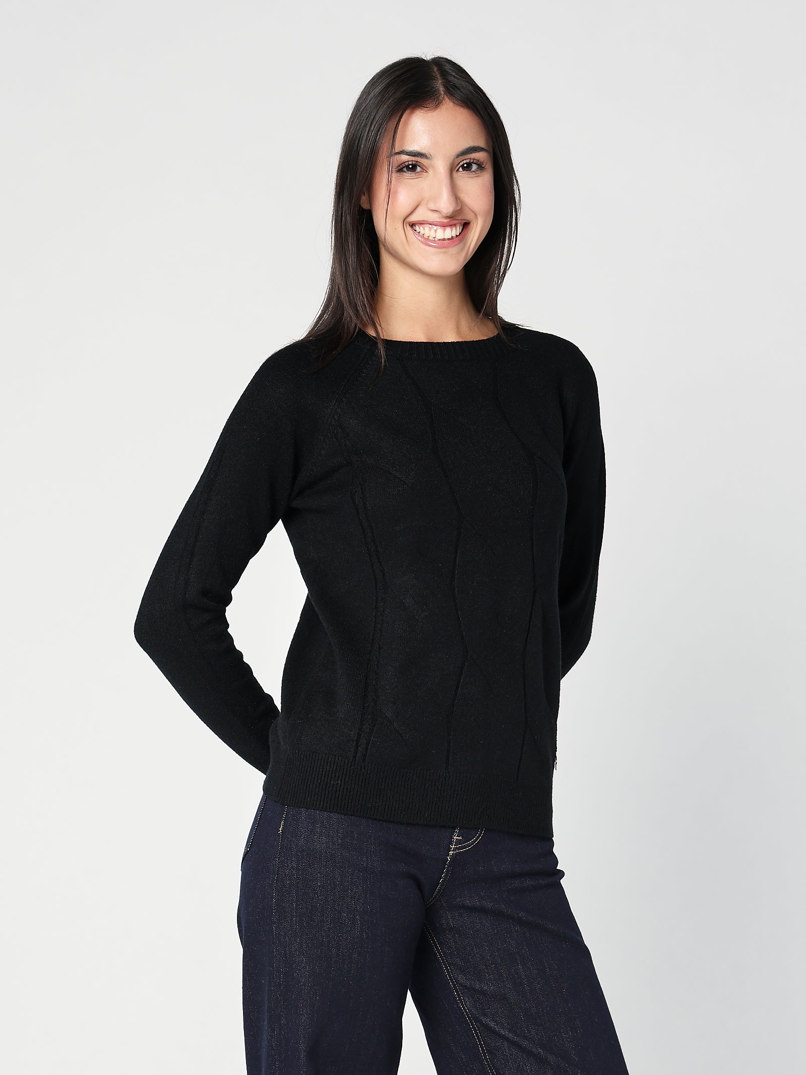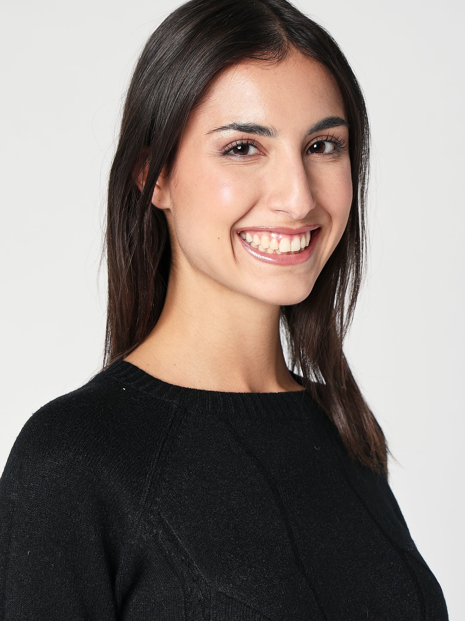Maglia girocollo nera dal taglio essenziale e lineare, perfetta come base neutra da valorizzare. Indossala con jeans a vita alta e blazer oversize per un look urbano, oppure sotto salopette o abiti smanicati per un effetto stratificato. Completa con sneakers bianche o ankle boots per equilibrio.