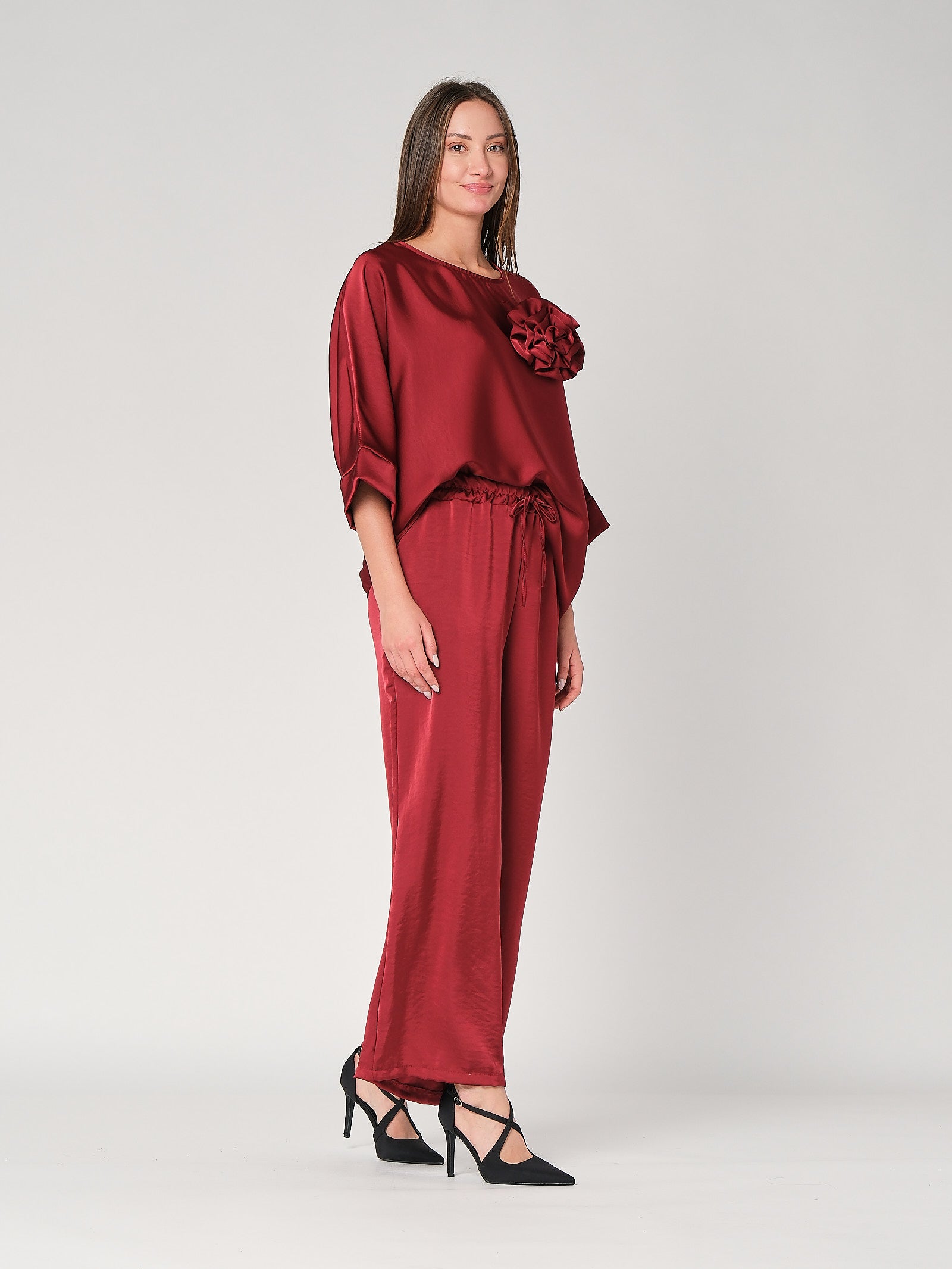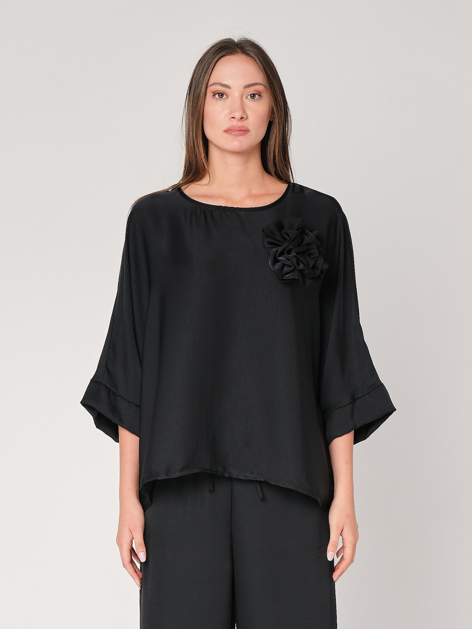 Maglia in raso larga con applicazione a rosa. La maglia in raso larga è quella mossa easy-chic che sistema il look in due secondi: scivola bene, cade fluida, resta leggera e curata. L’applicazione a rosa aggiunge il twist romantico giusto senza appesantire. Come top donna funziona da sola con denim, sotto giacca donna fa subito outfit più elegante. Zero sbatti, massimo effetto.