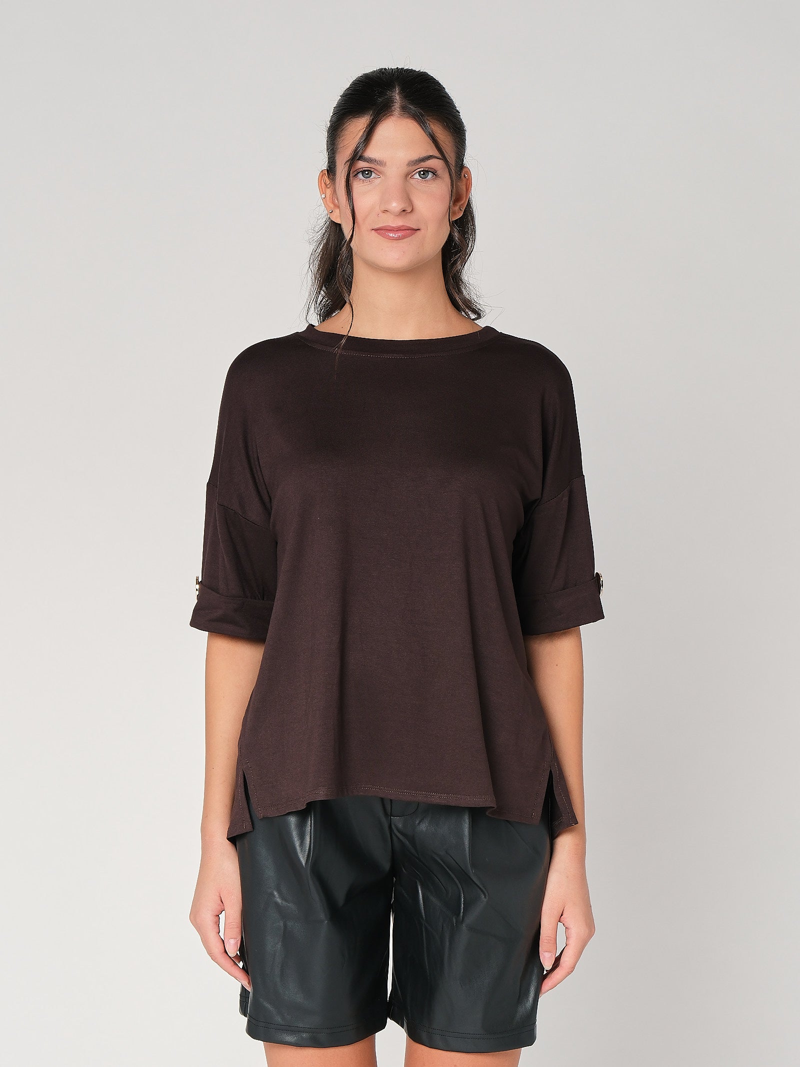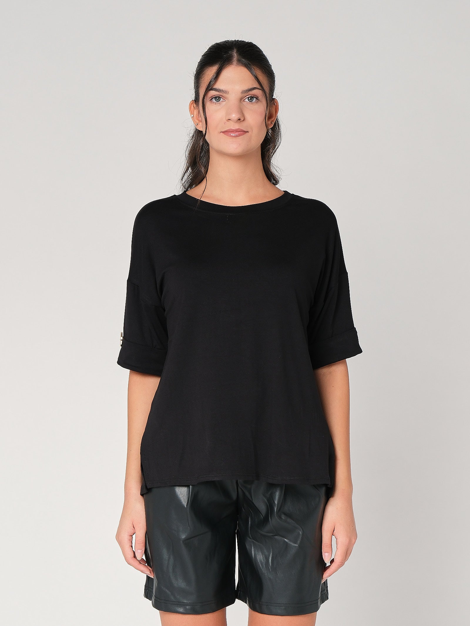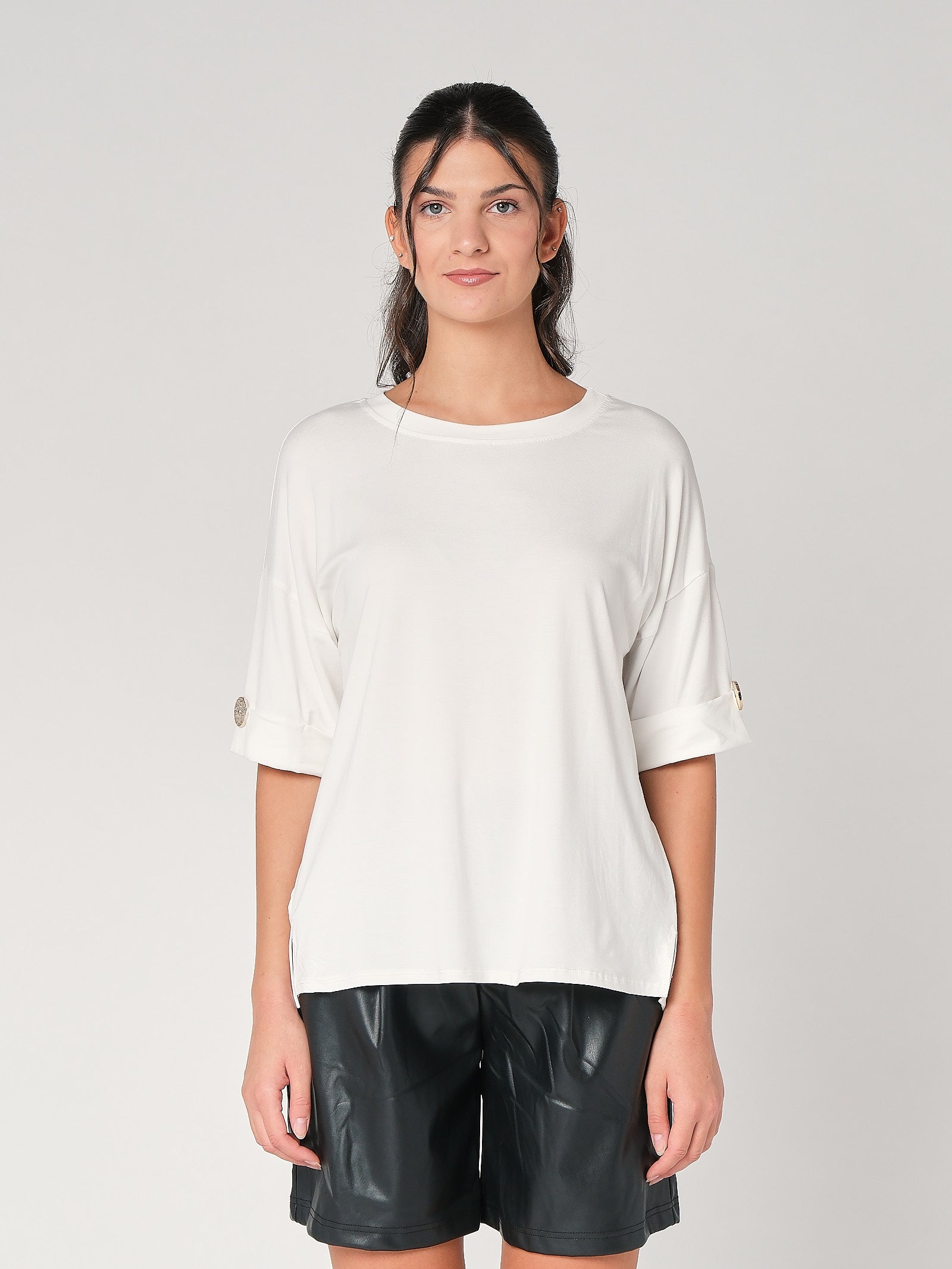 La t-shirt con bottone a mano è il trucco easy che dà subito carattere al look: taglio pulito, dettaglio prezioso, zero complicazioni. È una t-shirt donna pensata per restare comoda e ordinata, perfetta da sola come top donna o sotto giacca quando vuoi un tocco più curato. La linea essenziale slancia senza stringere, così la maglia donna lavora dal daily all’aperitivo senza sforzo.