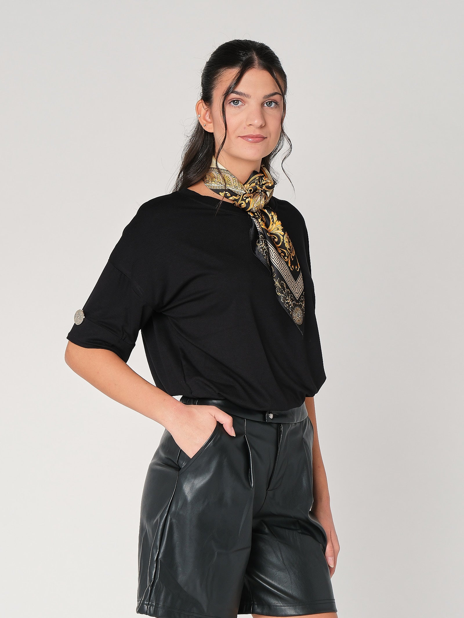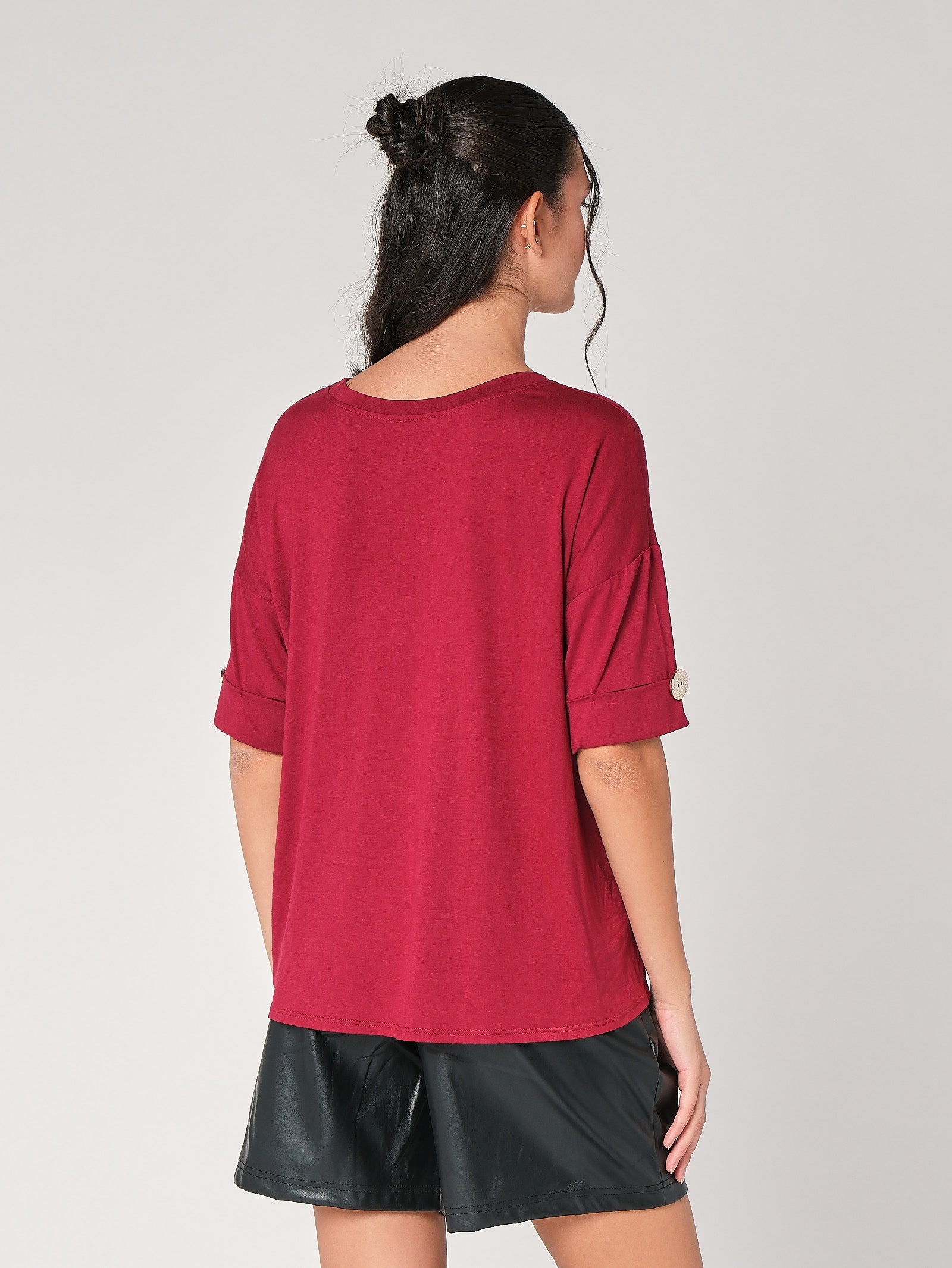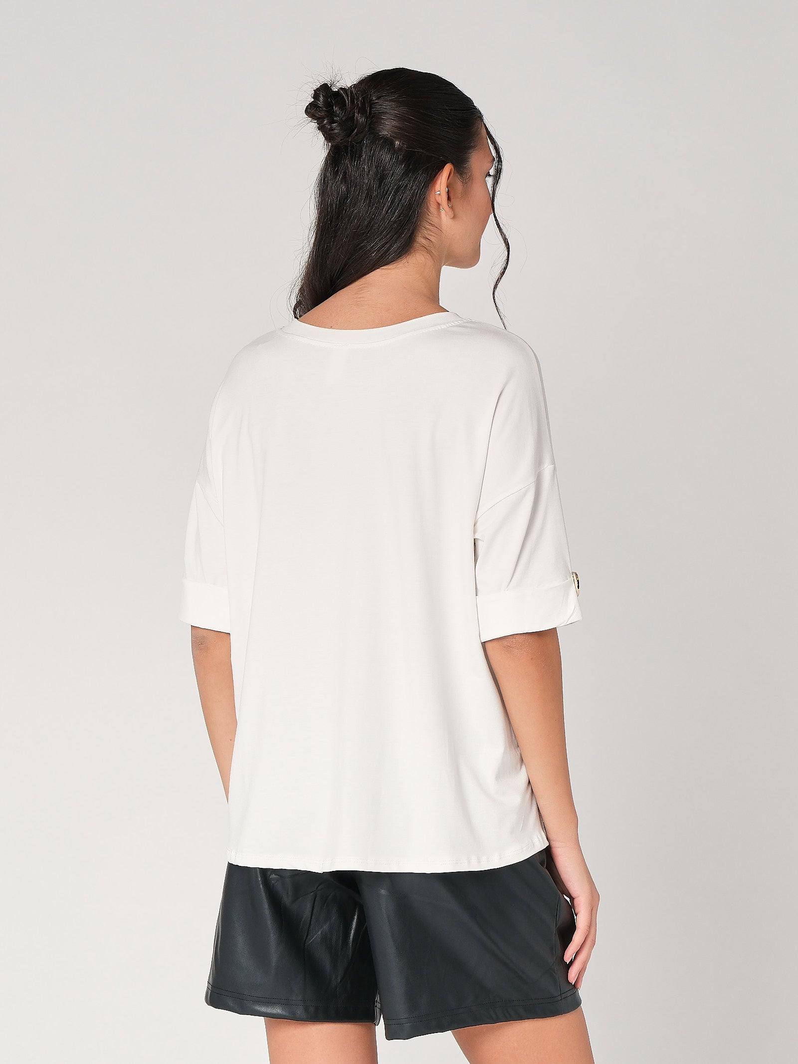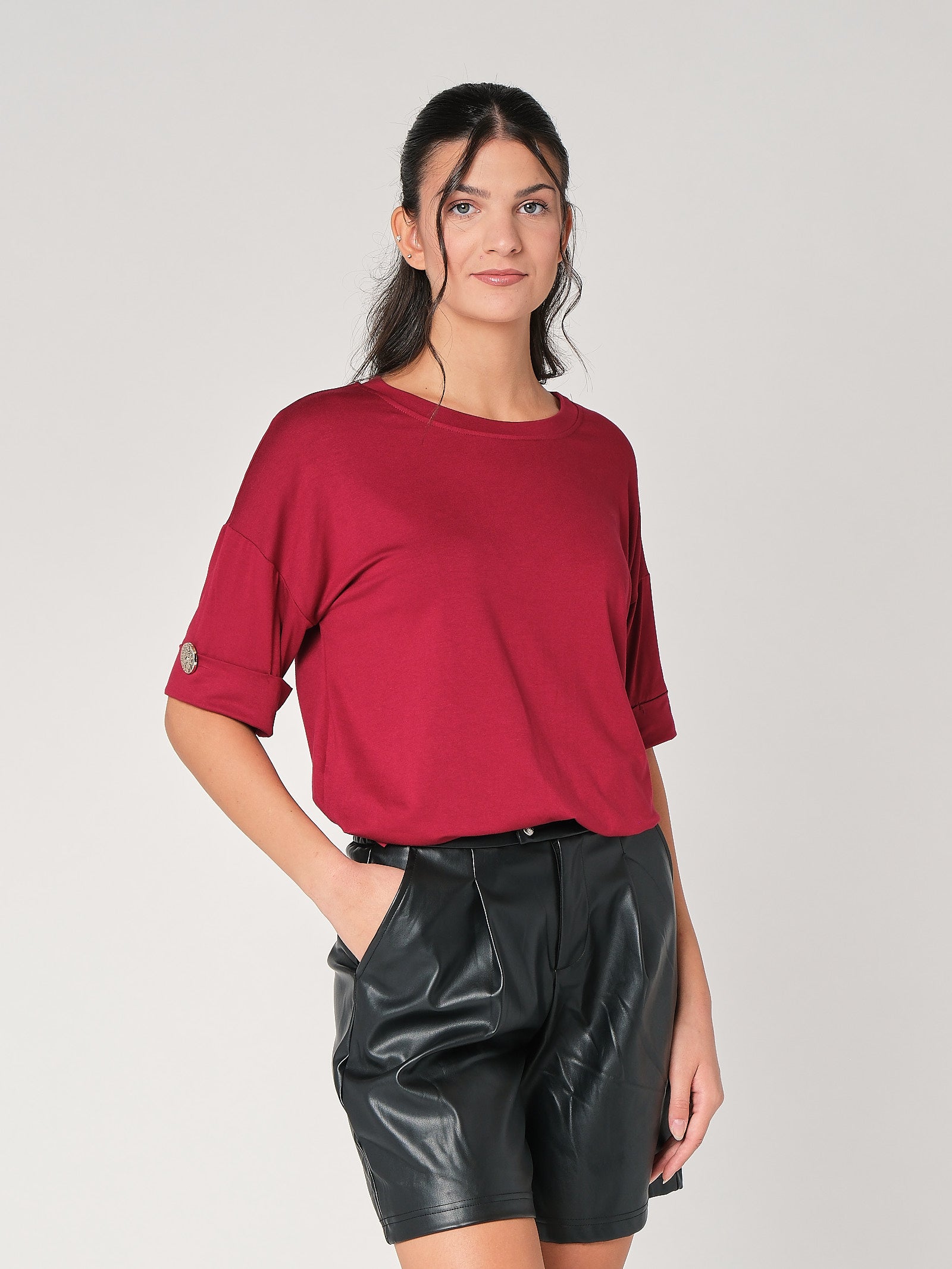 La t-shirt con bottone a mano è il trucco easy che dà subito carattere al look: taglio pulito, dettaglio prezioso, zero complicazioni. È una t-shirt donna pensata per restare comoda e ordinata, perfetta da sola come top donna o sotto giacca quando vuoi un tocco più curato. La linea essenziale slancia senza stringere, così la maglia donna lavora dal daily all’aperitivo senza sforzo.