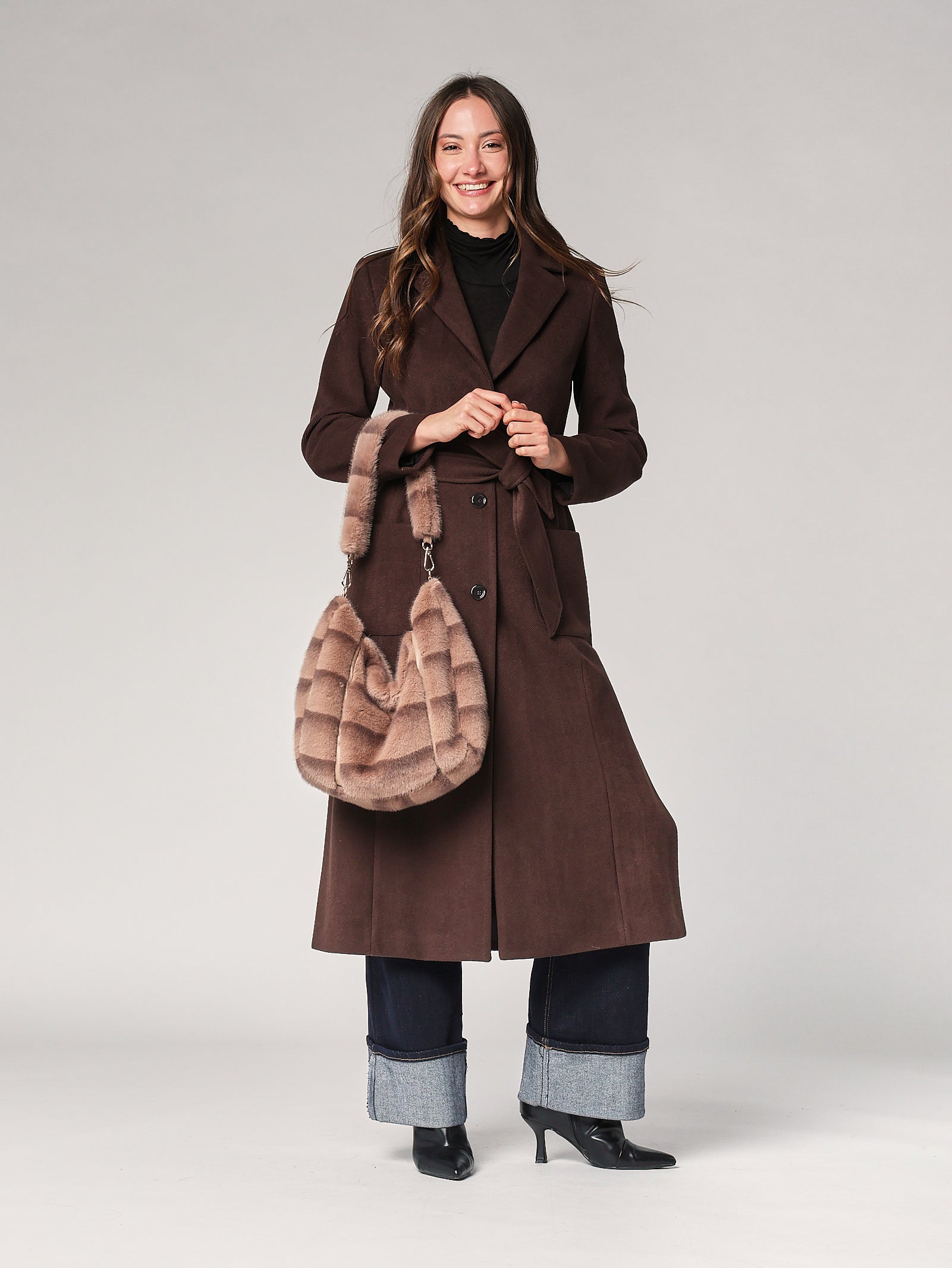 Borsa in pelliccia con tracolla dal carattere moderno e femminile. La texture soffice dona un effetto cozy immediato, mentre la tracolla la rende comoda e perfetta per accompagnare look invernali con un tocco di stile.