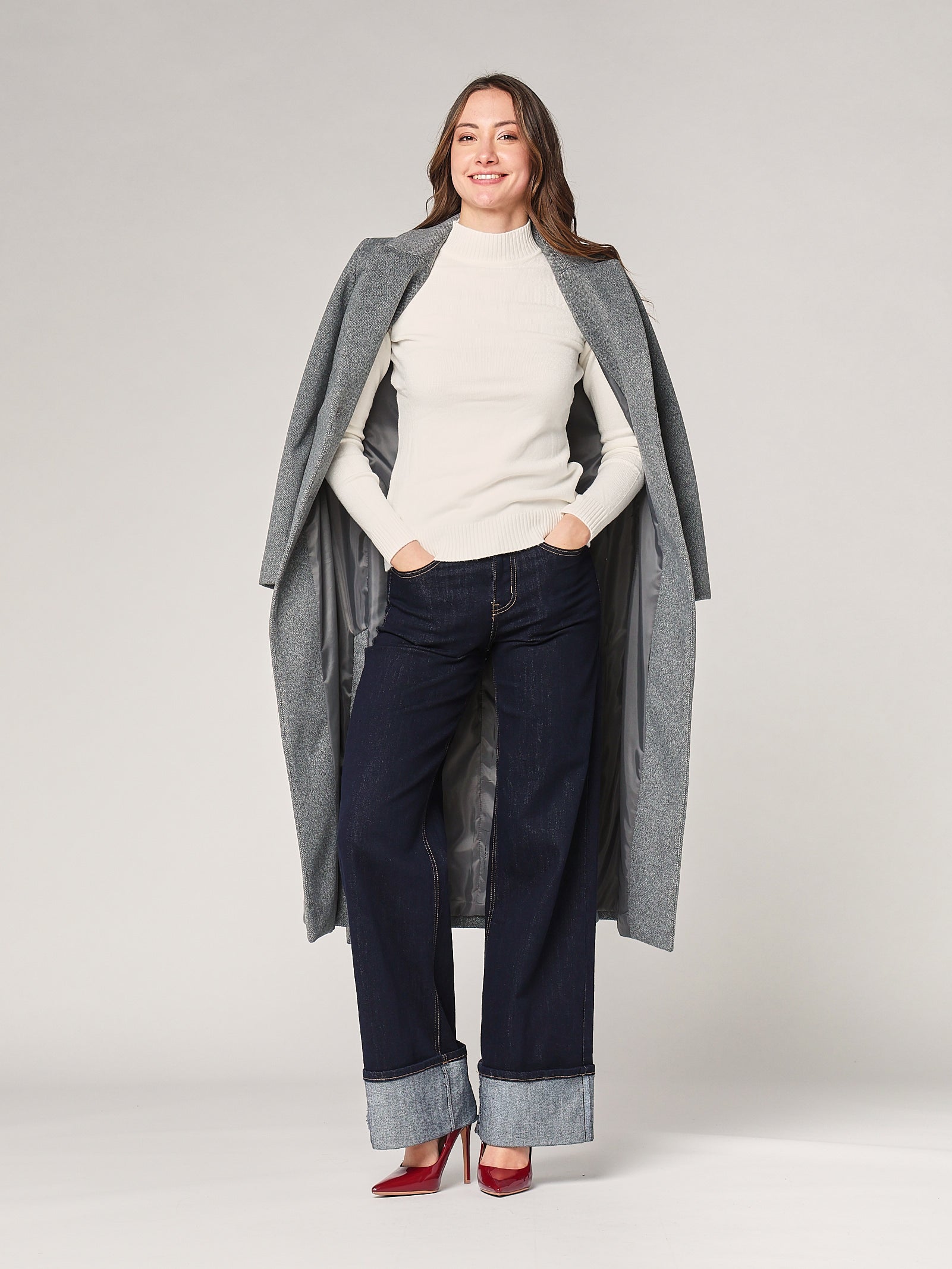 Dettagli sartoriali: collo alto lineare, finiture pulite