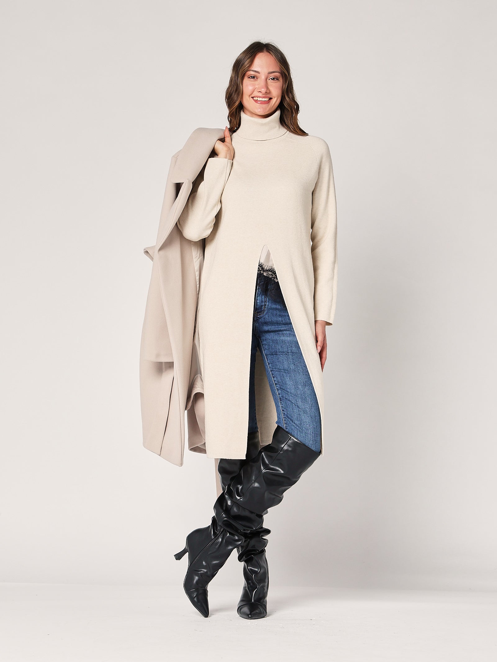 Dettaglio sartoriale: spacco frontale e cuciture pulite