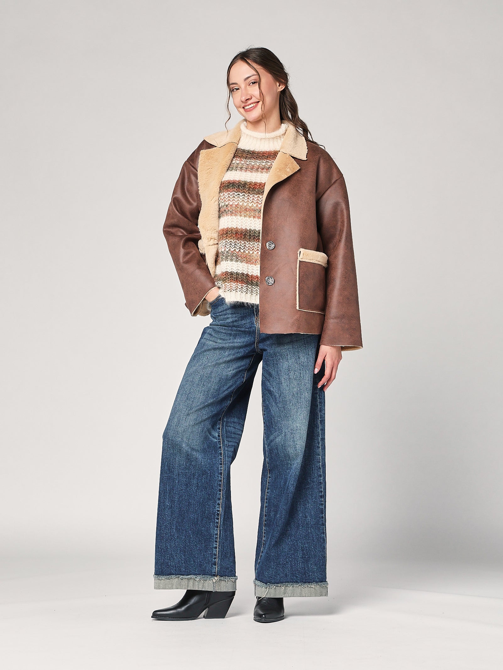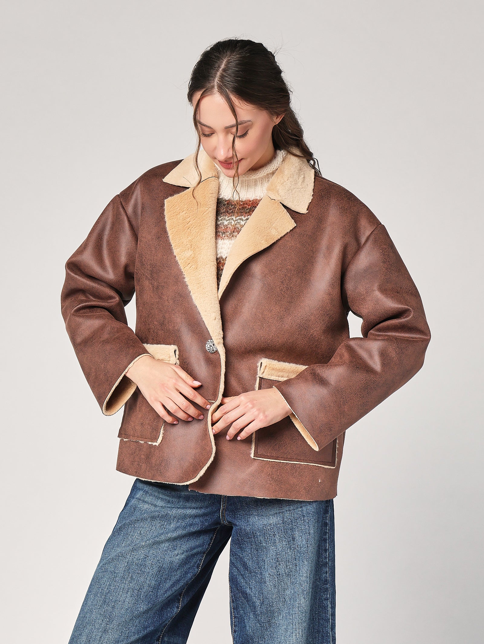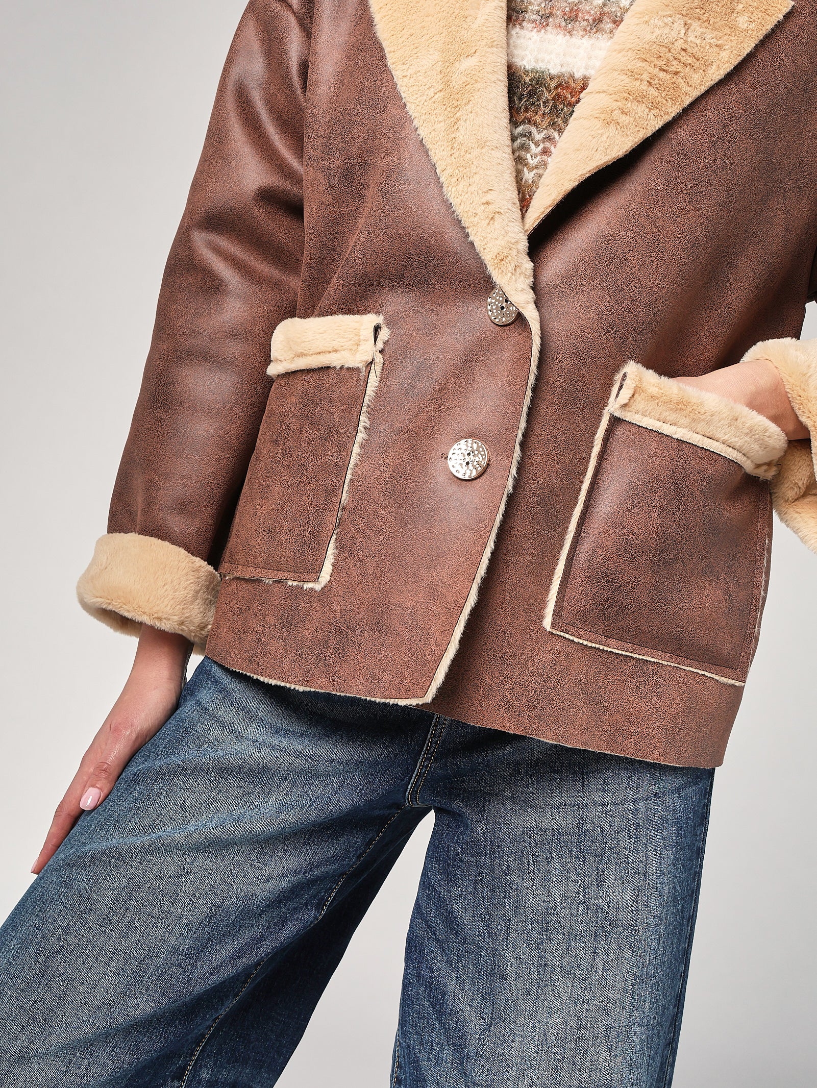 Montone con due tasche, un capo caldo e sofisticato che unisce stile e praticità. La texture effetto pelliccia regala un tocco lussuoso, mentre il taglio corto e le tasche frontali aggiungono una nota contemporanea e versatile. Perfetto per affrontare con eleganza le giornate più fredde.