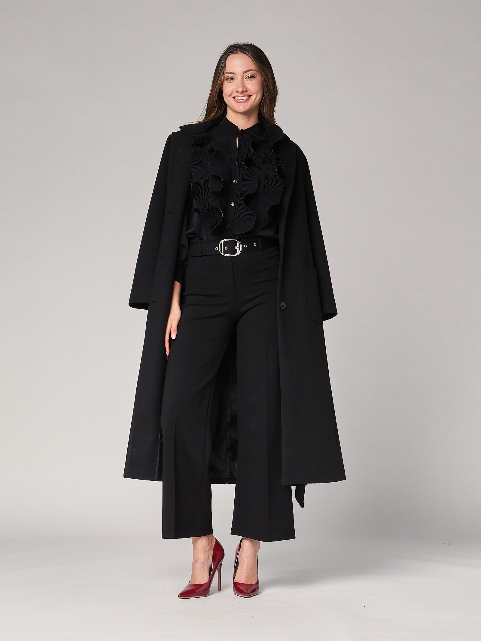Pantalone palazzo fluido, perfetto per uno stile minimal e sofisticato. Il taglio ampio accompagna i movimenti con eleganza, mentre la vestibilità morbida lo rende un capo essenziale nel guardaroba contemporaneo.