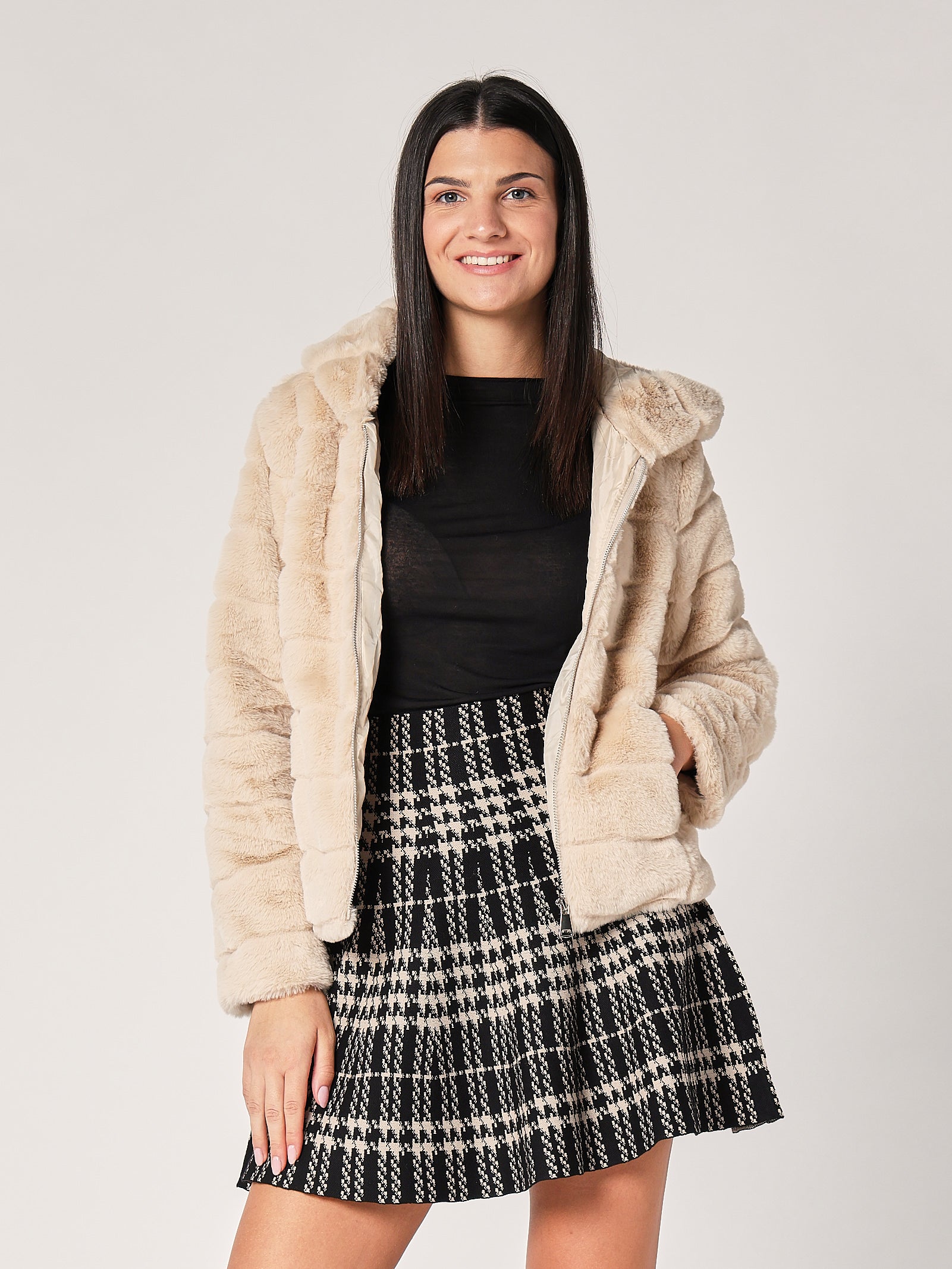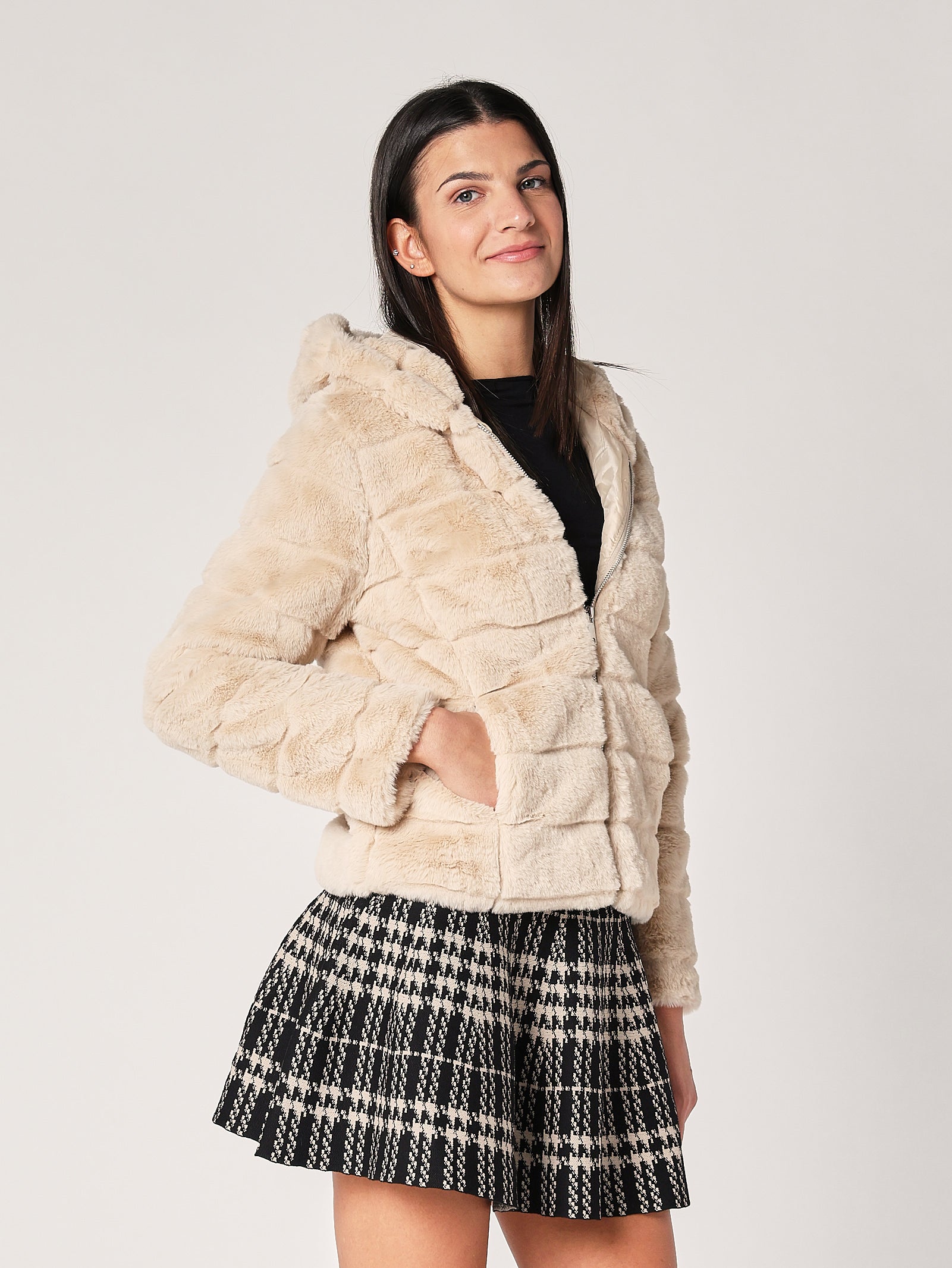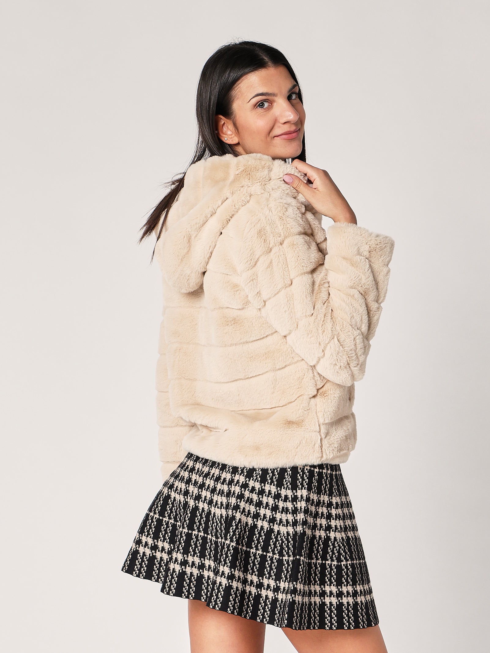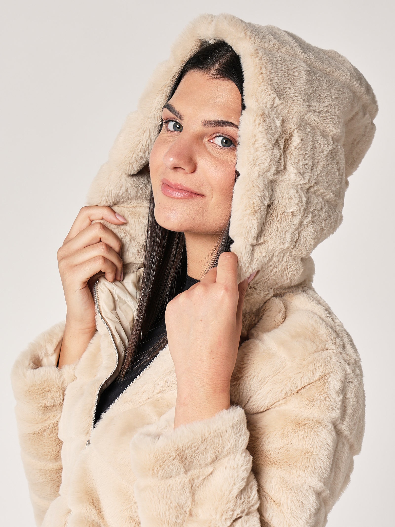 Giacca in pelliccia effetto peluche con cappuccio, un capo iconico che unisce morbidezza e stile. Il volume equilibrato e la texture soffice la rendono perfetta per look casual chic o eleganti. Da indossare sopra dolcevita, vestiti o denim per un effetto caldo e glamour.