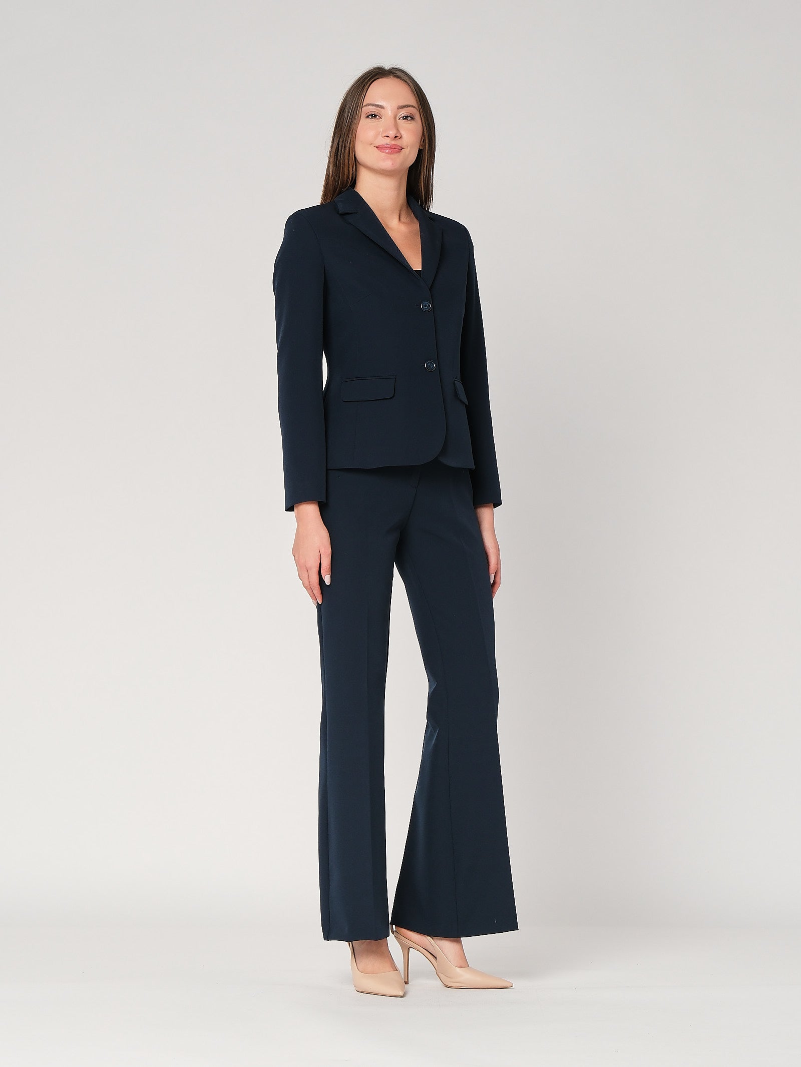 Il pantalone a zampa è l’asso che allunga la figura senza sforzo: punto vita definito, linea che parte asciutta e si apre sul fondo con passo leggero. È un pantalone donna comodo ma deciso, perfetto per dare proporzioni eleganti anche ai look basic. Da solo fa subito ordine, con gilet o giacca diventa set sartoriale che funziona ovunque.